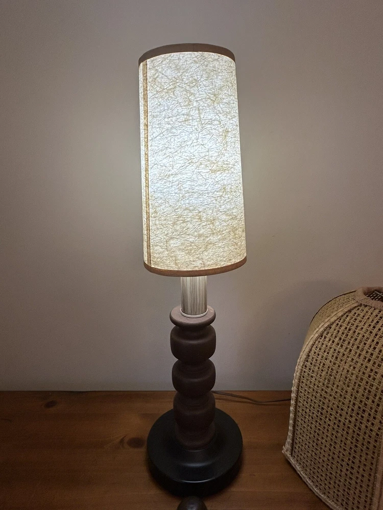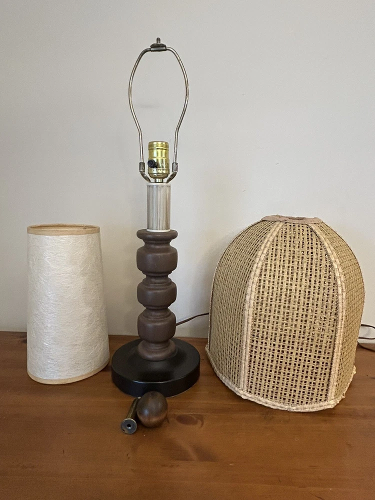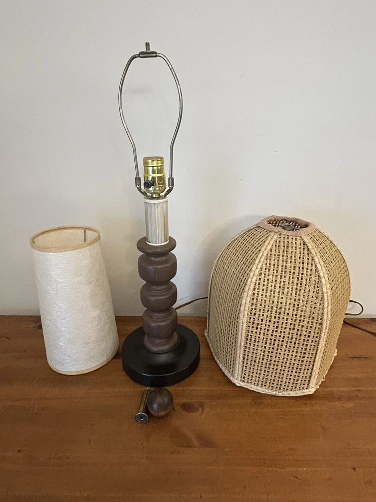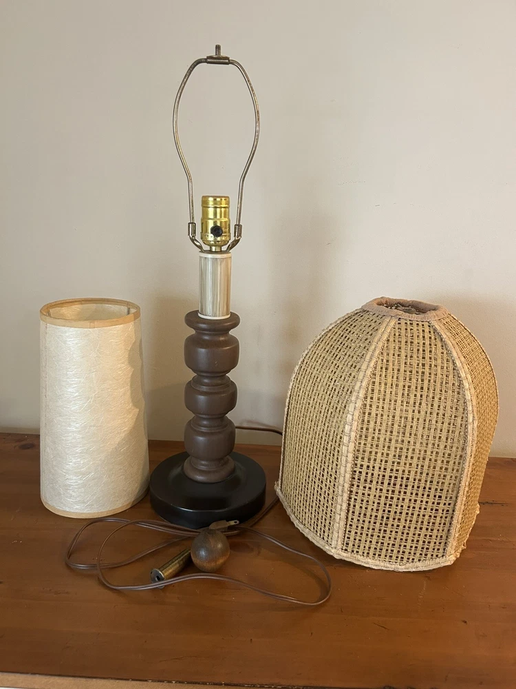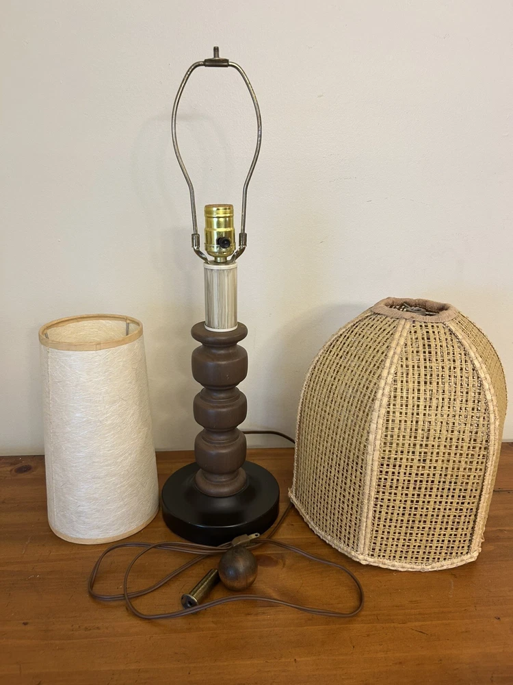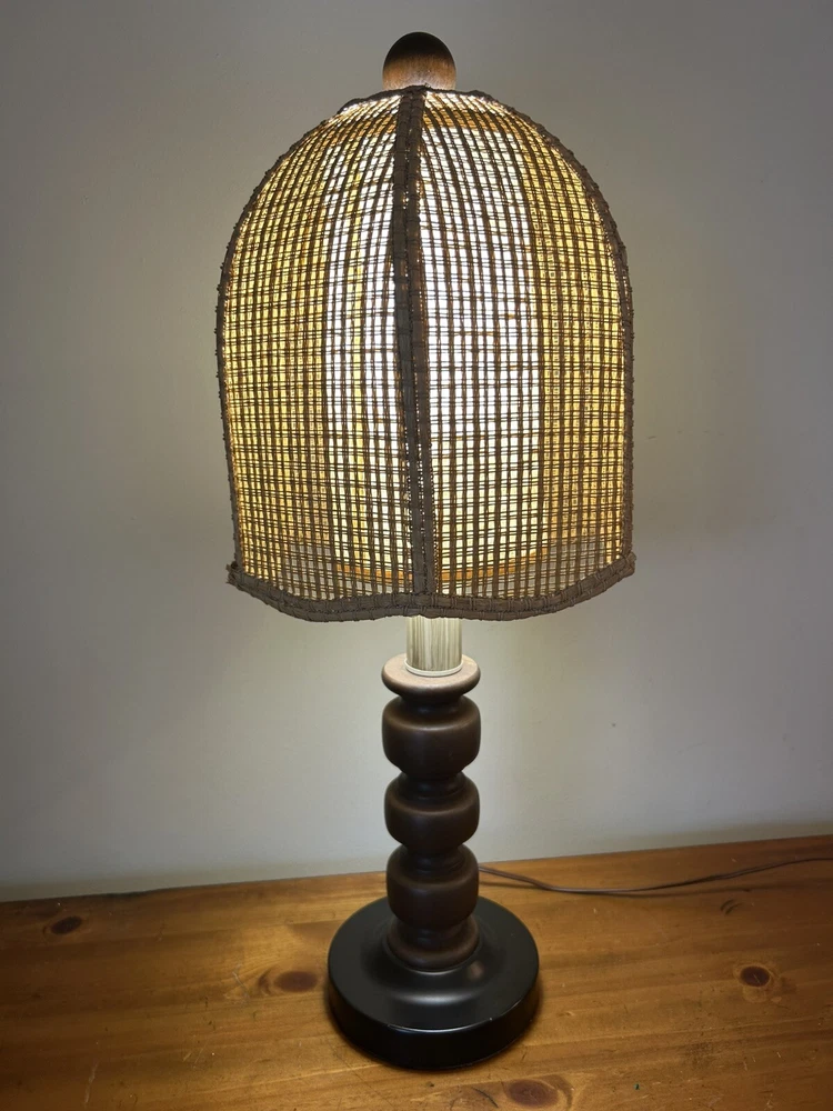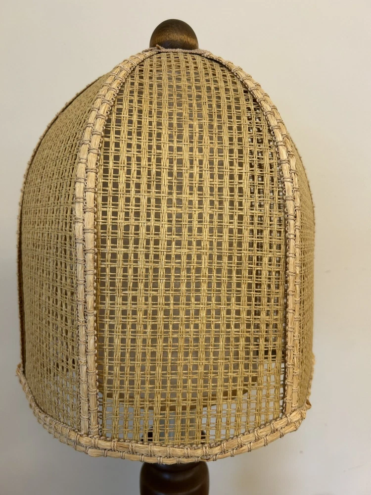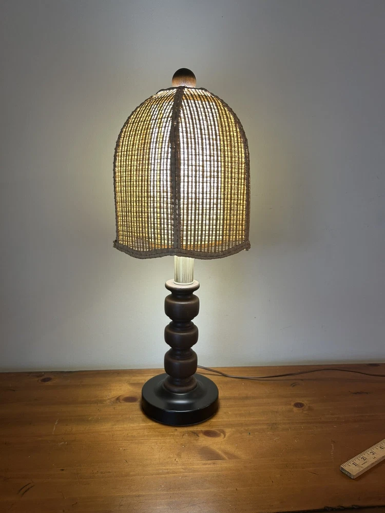 Beautiful Vintage MCM Rattan Wicker & Fiberglass Double Drum Table Lamp Light 25”H Retro Nice vintage condition- refer to pics Light bulb not included May ship in 2 boxes not to damage lampshades