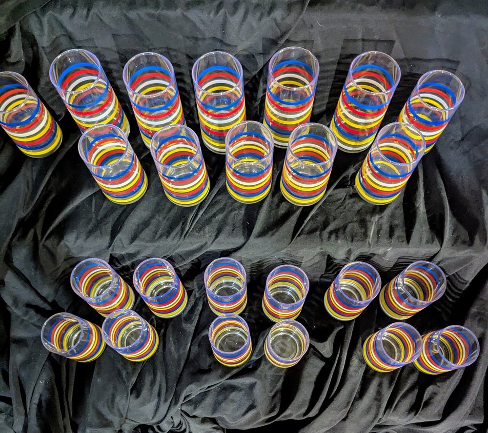 This set of 8 Libbey striped tumbler glasses is perfect for any occasion. The mid-century modern design adds a touch of vintage charm to your drinkware collection. Made in the United States, these glasses are crafted from high-quality glass material and feature a decorative striped pattern. The set includes 4 large and 4 small glasses, each measuring 4.75 inches in height. These glasses are ideal for serving water, iced tea, or other beverages. They are also great for display and can be used as decorative pieces in your home or office. Add this set of Libbey striped tumbler glasses to your collection today!