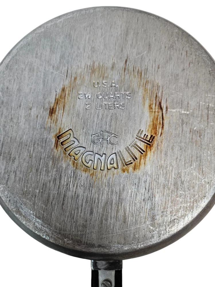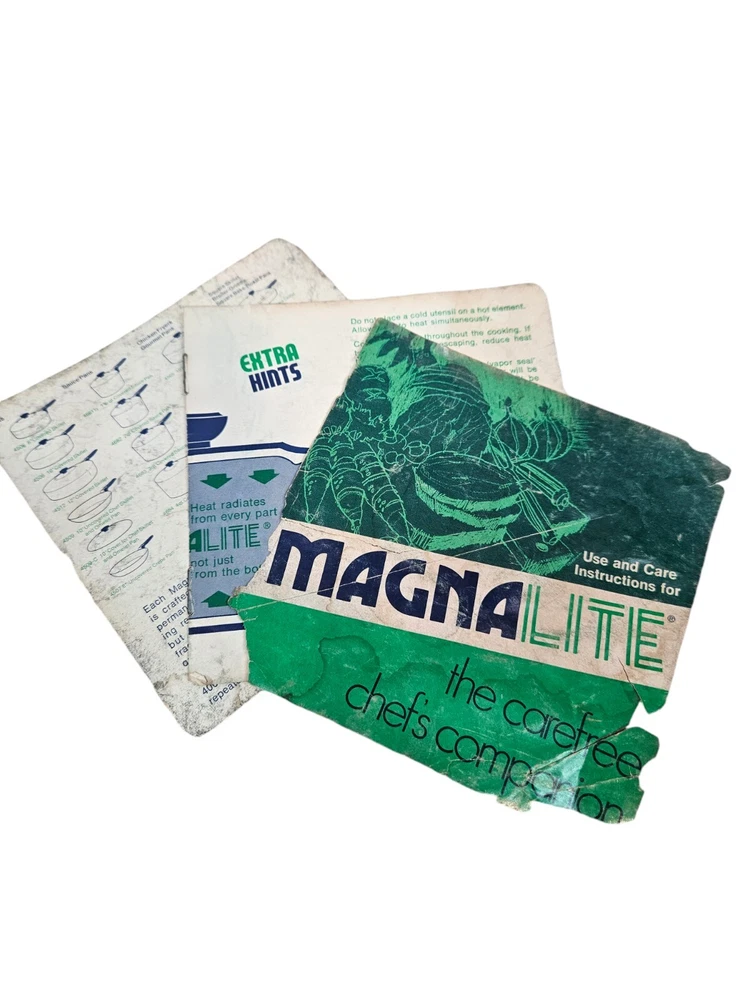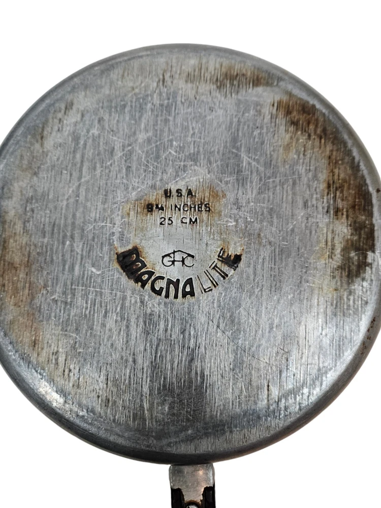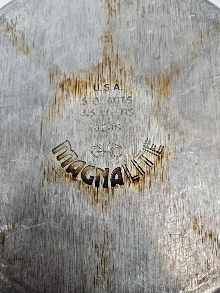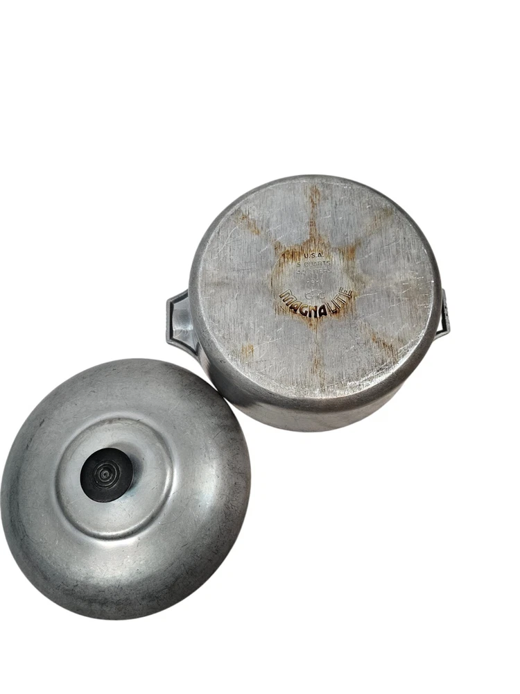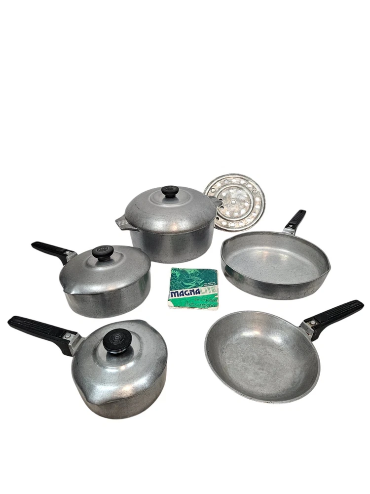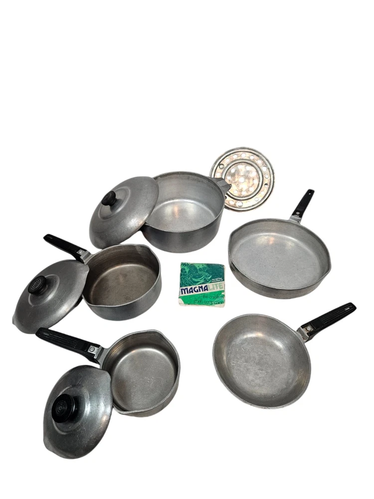 Vintage Magnalite 4000 9 Piece Set of Aluminum Cookware Dutch Oven Sauce Sautee Constructed from hand-poured cast aluminum; heavy domed lids lock-in moisture, transfer heat from vessel side walls, and help facilitate convection style heating; Phenolic handles; Oven-safe to 350 degrees F; hand wash only; interchangeable lids; includes original booklet. Made in USA Includes 4248 Dutch Oven with lid 5 quarts 2.4 quart Saucepan with lid 1 quart Saucepan with lid 7.75" small Sautee pan 9.25" Frying Pan This a a pre-owned item that may show signs of wear. In excellent condition, 2.5 quart sauce pan interior is darker in color.