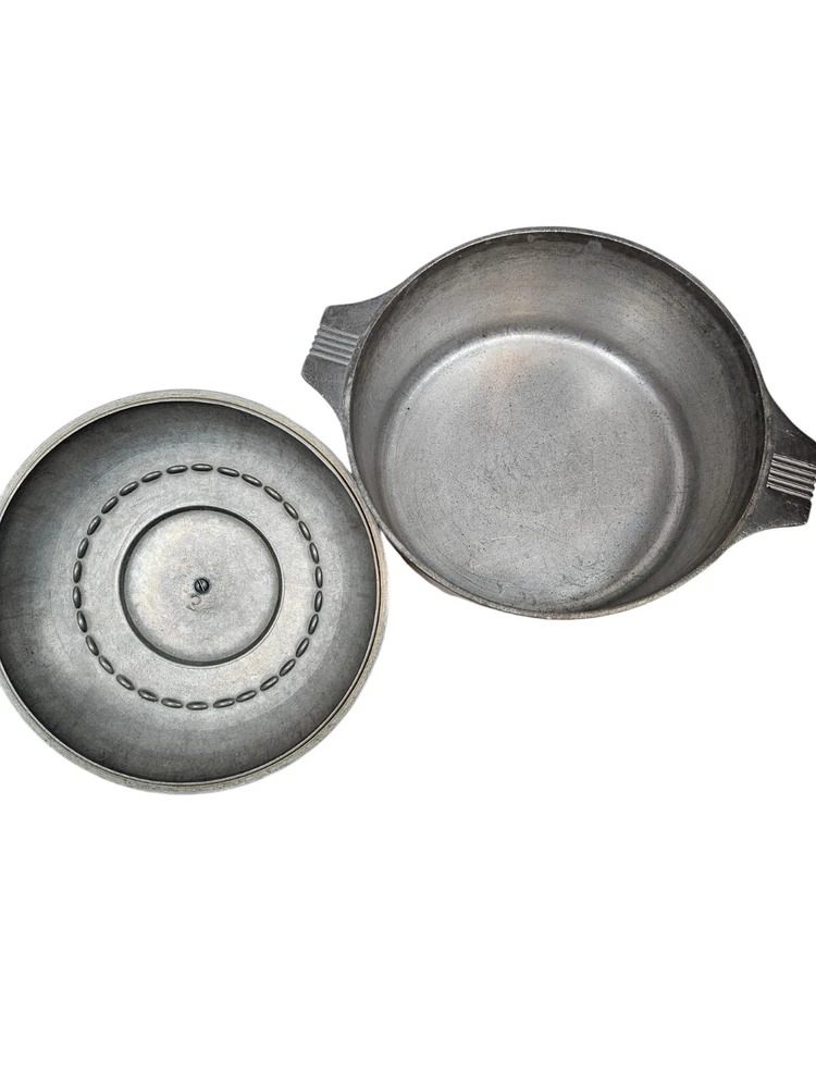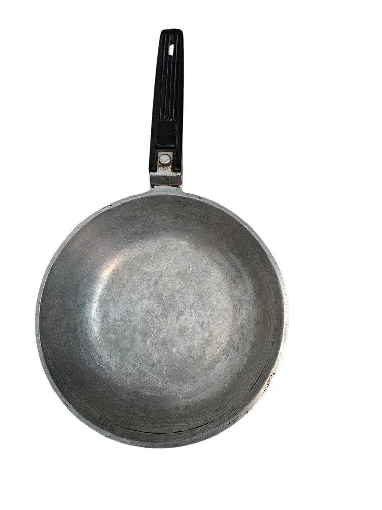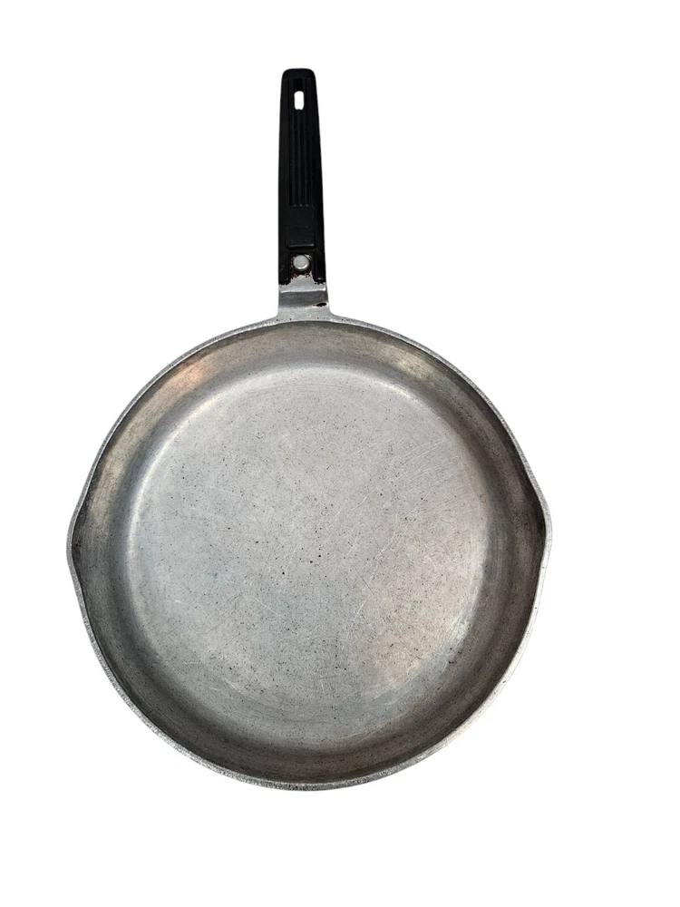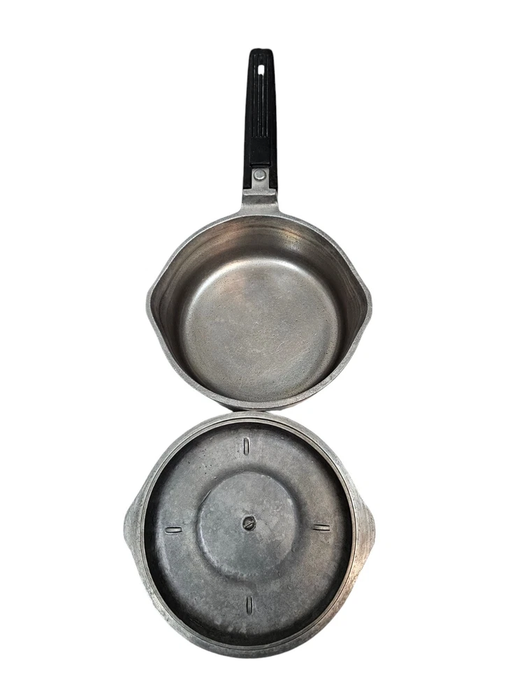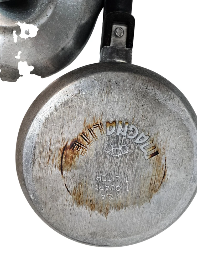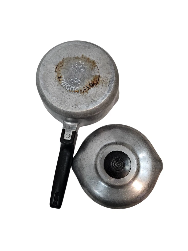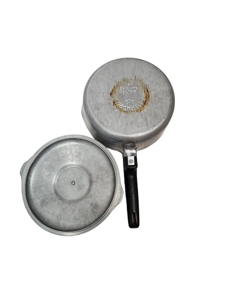 Vintage Magnalite 4000 9 Piece Set of Aluminum Cookware Dutch Oven Sauce Sautee Constructed from hand-poured cast aluminum; heavy domed lids lock-in moisture, transfer heat from vessel side walls, and help facilitate convection style heating; Phenolic handles; Oven-safe to 350 degrees F; hand wash only; interchangeable lids; includes original booklet. Made in USA Includes 4248 Dutch Oven with lid 5 quarts 2.4 quart Saucepan with lid 1 quart Saucepan with lid 7.75" small Sautee pan 9.25" Frying Pan This a a pre-owned item that may show signs of wear. In excellent condition, 2.5 quart sauce pan interior is darker in color.
