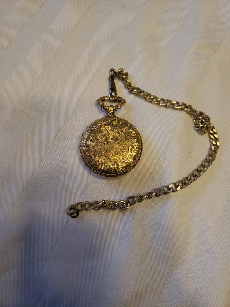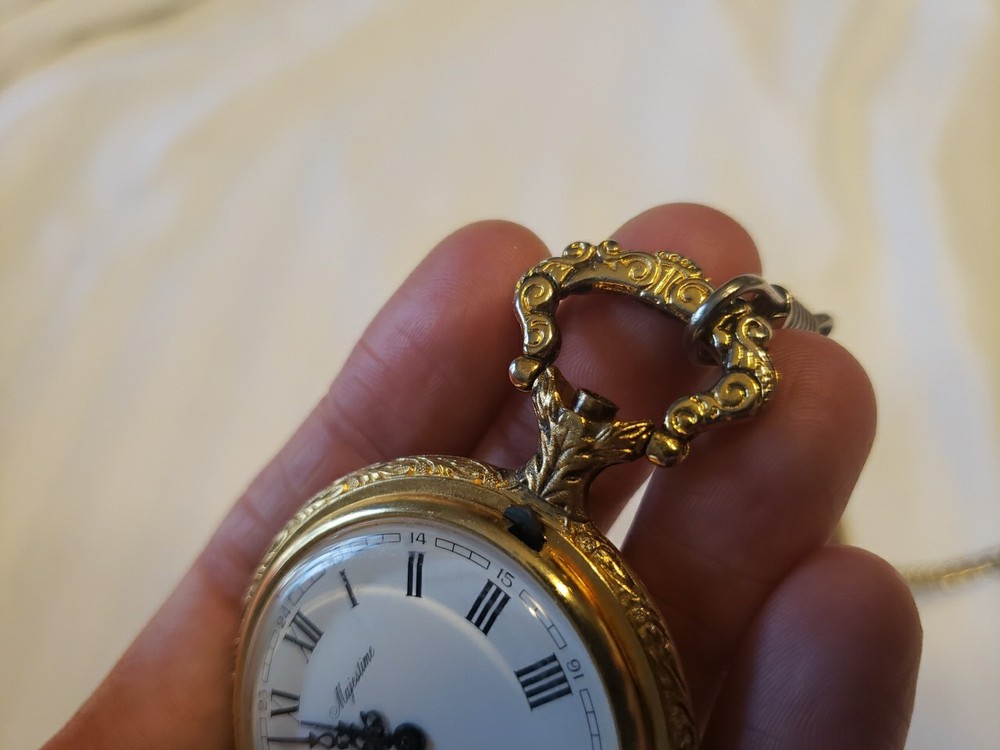Missing the wind up knob-makes it difficultto open to see clock face. Has gold tone. See pictures. What you see is what you get .please message me if you have any questions. Thank you and God bless. Bin#20