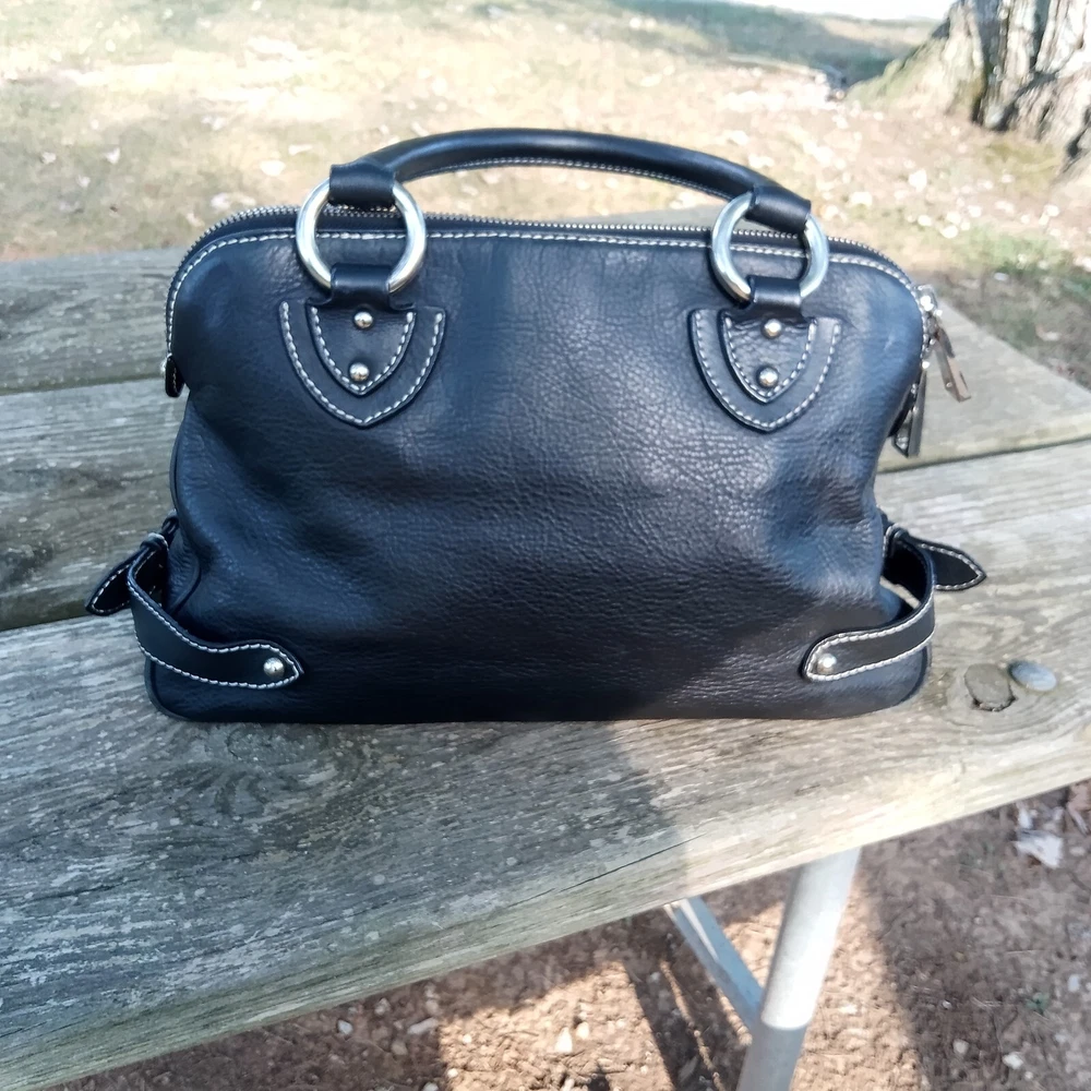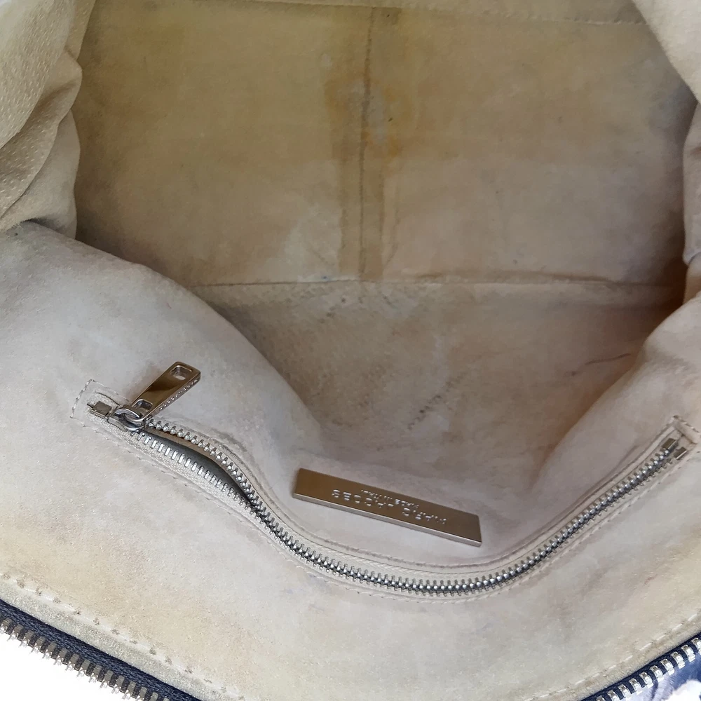 Excellent condition the handles and all leather is in perfect shape this bag looks like it was never used it is at least 20 years old sitting in our closet for that long really heavy leather made in Italy