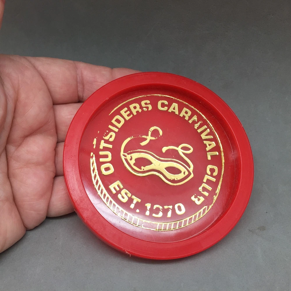 Vintage Mardi Gras Plastic Coaster Parade Throw Outsiders Carnival Club Est 1970 This a vintage Mardi Gras New Orleans parade float "throw" plastic coasters in functional condition that measures 3 5/8" diameter. It reads, "Outsiders Carnival Club Est. 1970" and is red color with gold lettering. These are a vintage pre-owned item that was from estate of Mardi Gras collector (circa 1960-1990). My photos are of the actual items you are getting. See my store for other interesting Mardi Gras collectible items. PAYMENT DETAILS: Buyer must furnish seller with "ship to " address that matches the address registered on ebay. Payment is expected within 3 days after close of auction. Thank you for looking.
