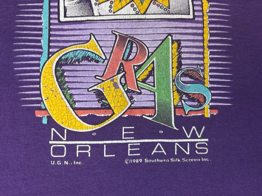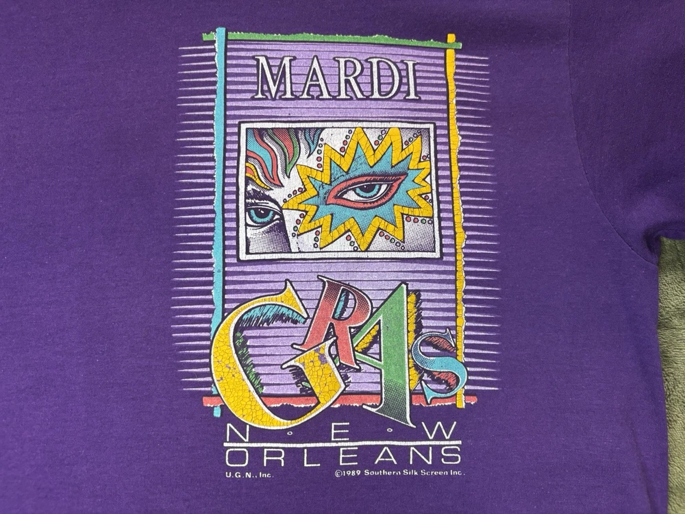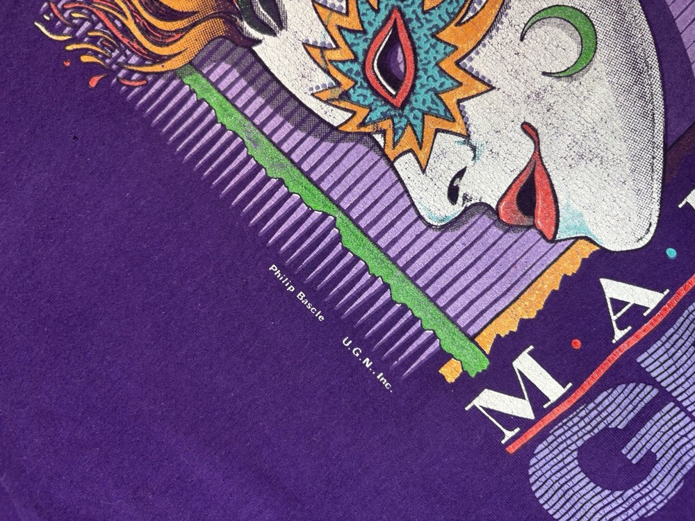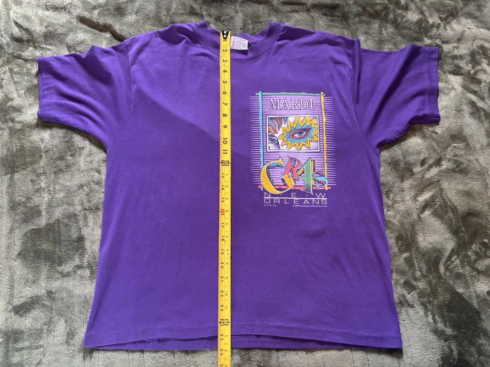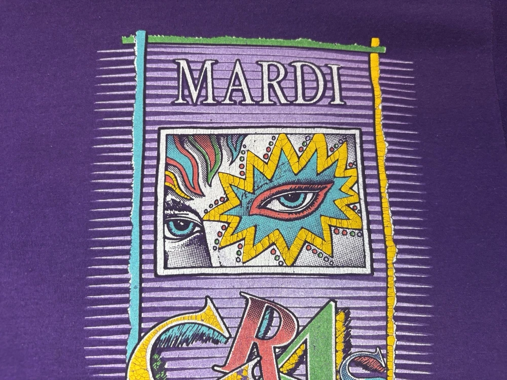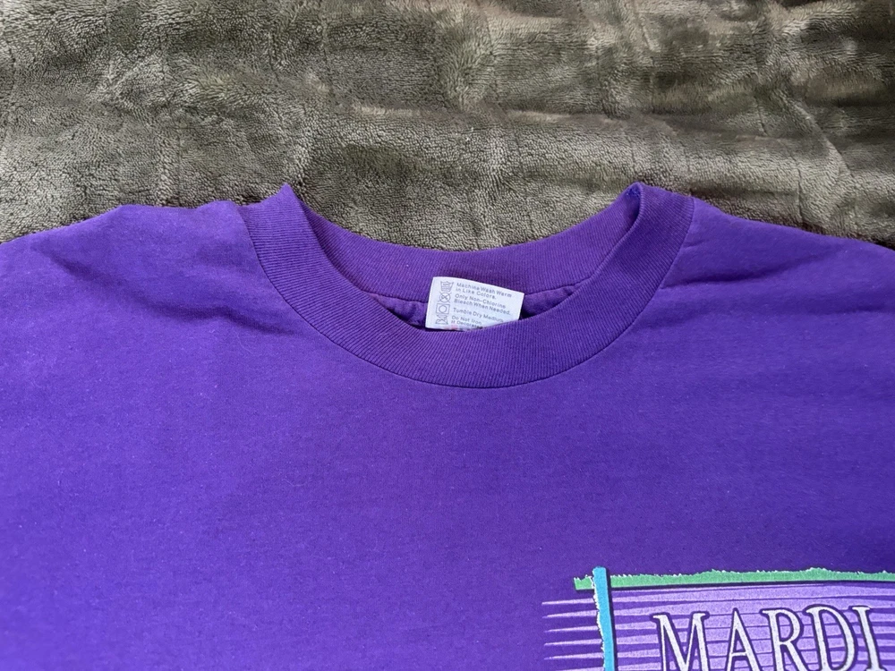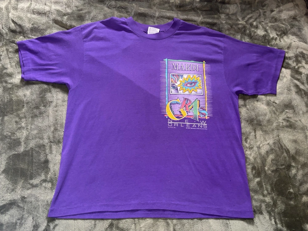 This Vintage Mardi Gras Shirt for men in size XL features a graphic print design in purple, perfect for celebrating the 80s and New Orleans culture. Made from a blend of polyester and cotton, this crew neck shirt is machine washable for easy care. With a regular fit and short sleeves, this double-sided shirt is ideal for all seasons and can be worn to any USA-themed or 80s-inspired festival or event. Made in the United States by Hanes, this unique shirt is a must-have for travel enthusiasts and art lovers alike. There are a couple of spots on the bottom hem where the stitching is fraying.