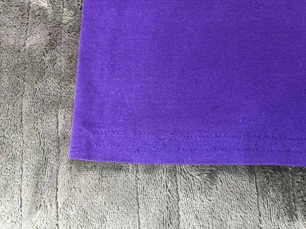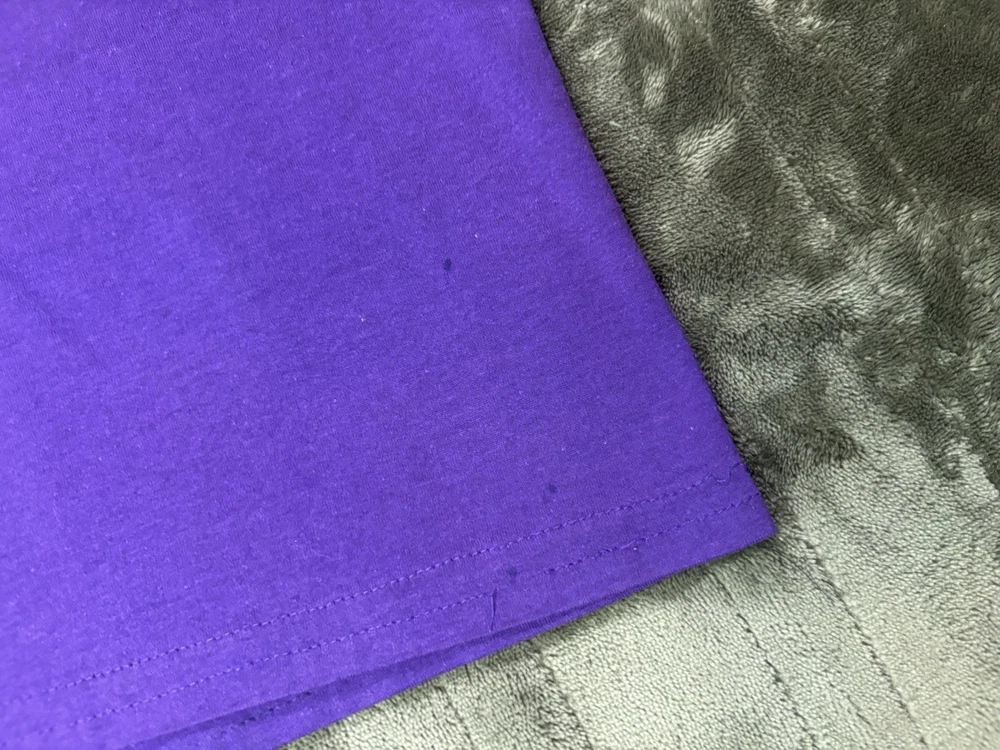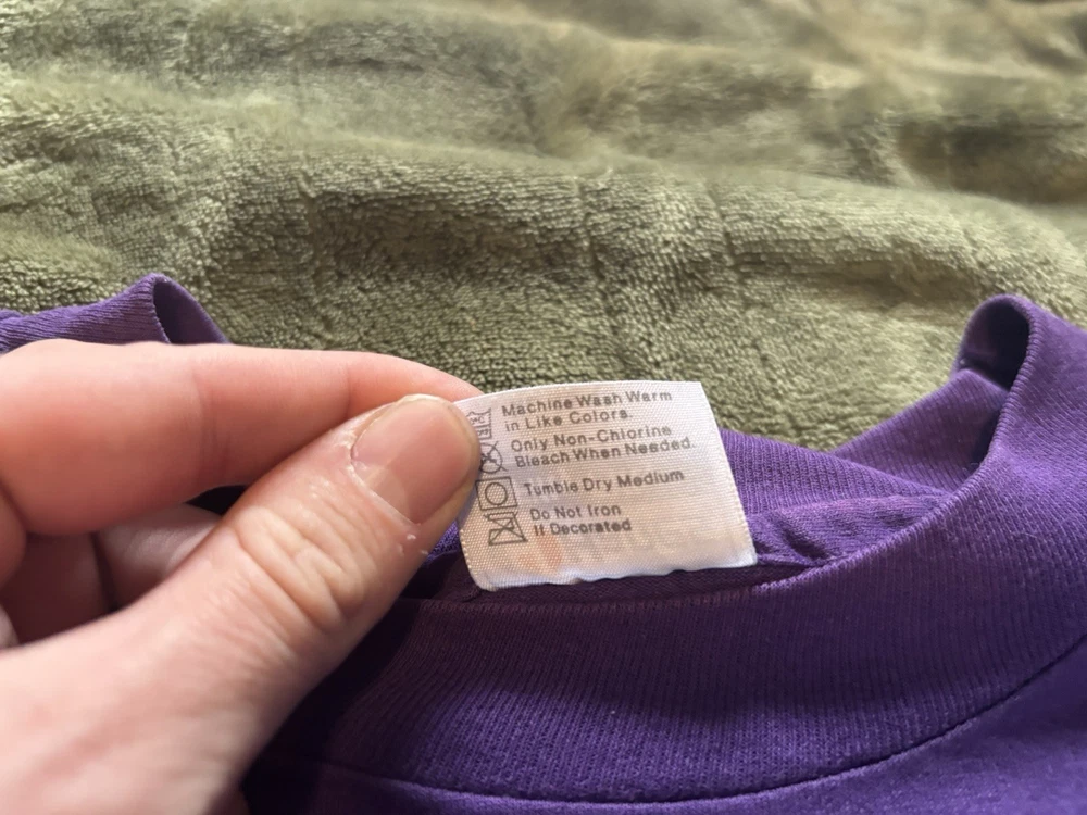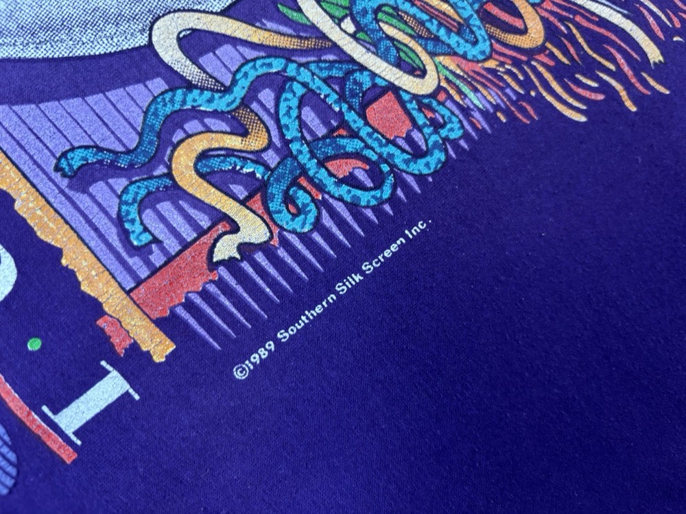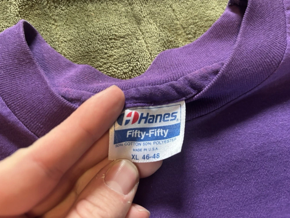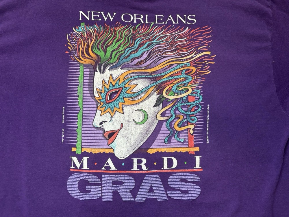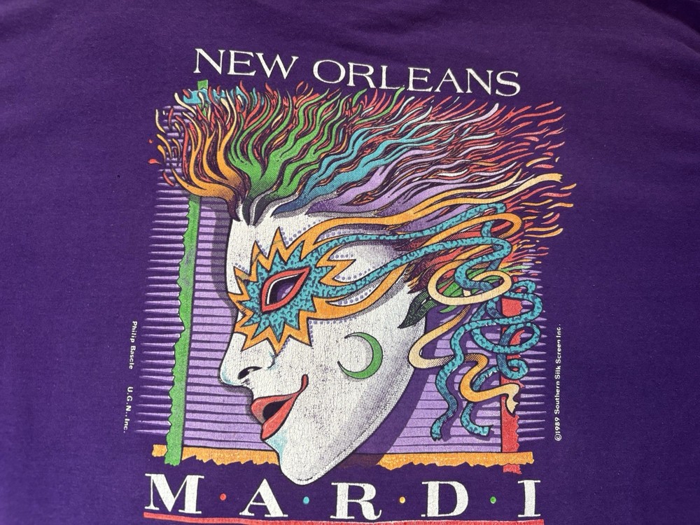 This Vintage Mardi Gras Shirt for men in size XL features a graphic print design in purple, perfect for celebrating the 80s and New Orleans culture. Made from a blend of polyester and cotton, this crew neck shirt is machine washable for easy care. With a regular fit and short sleeves, this double-sided shirt is ideal for all seasons and can be worn to any USA-themed or 80s-inspired festival or event. Made in the United States by Hanes, this unique shirt is a must-have for travel enthusiasts and art lovers alike. There are a couple of spots on the bottom hem where the stitching is fraying.