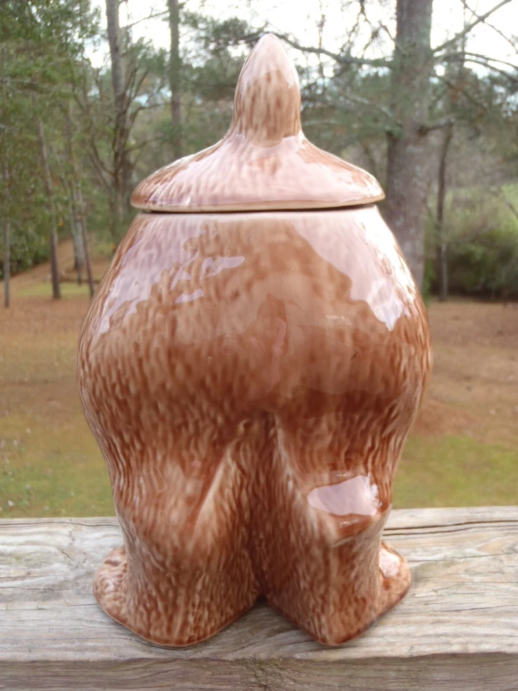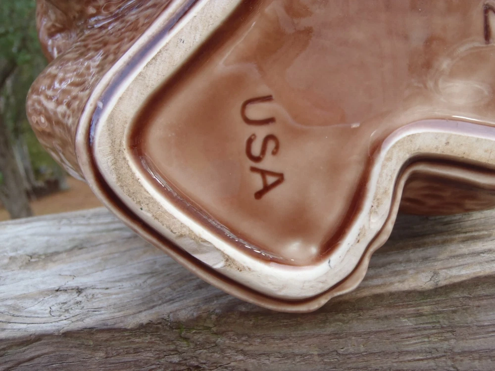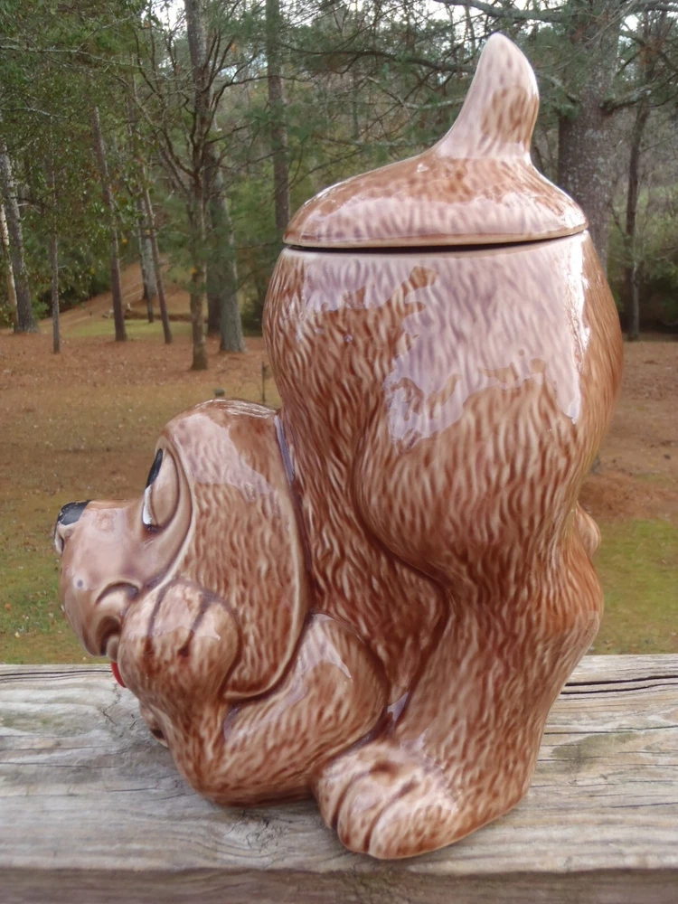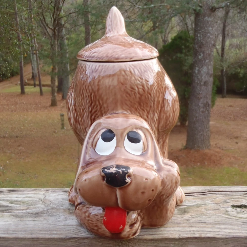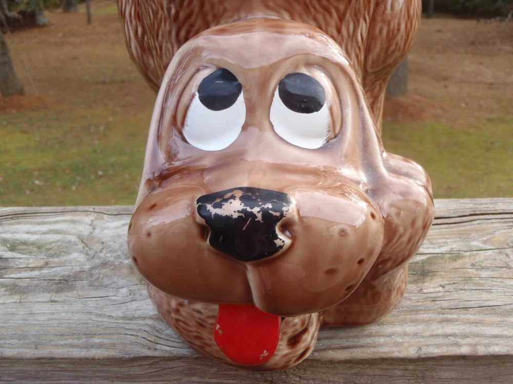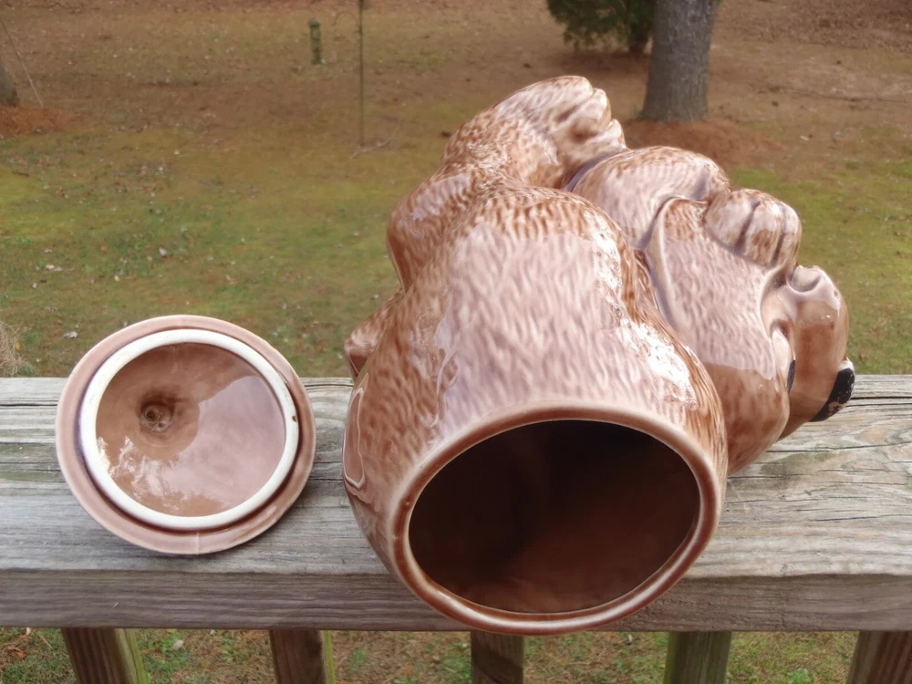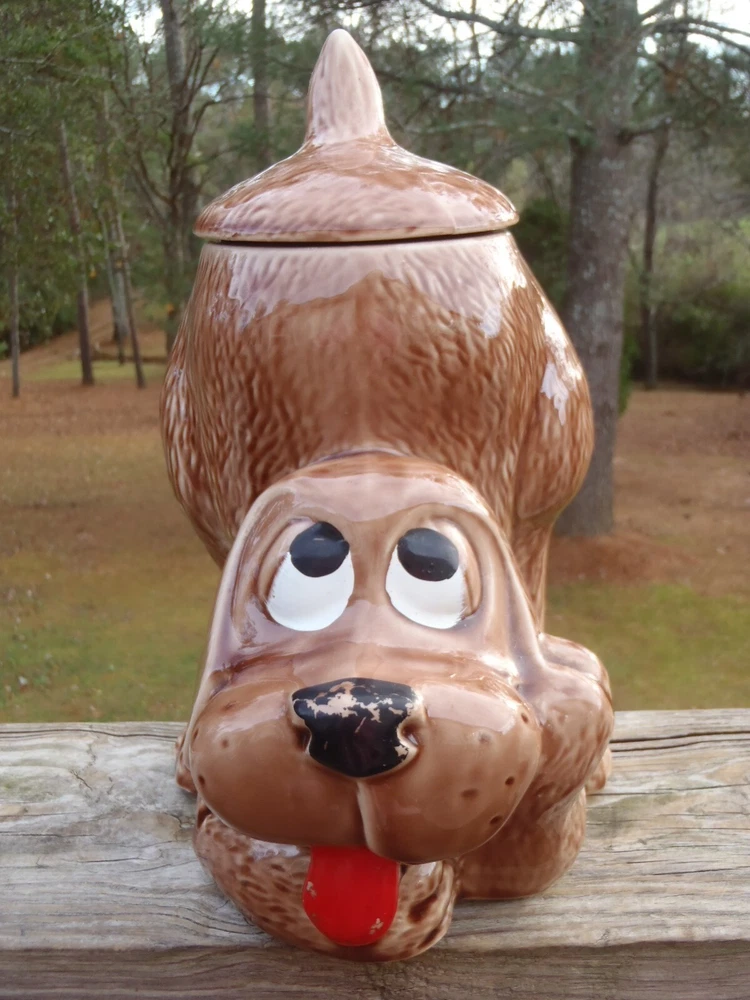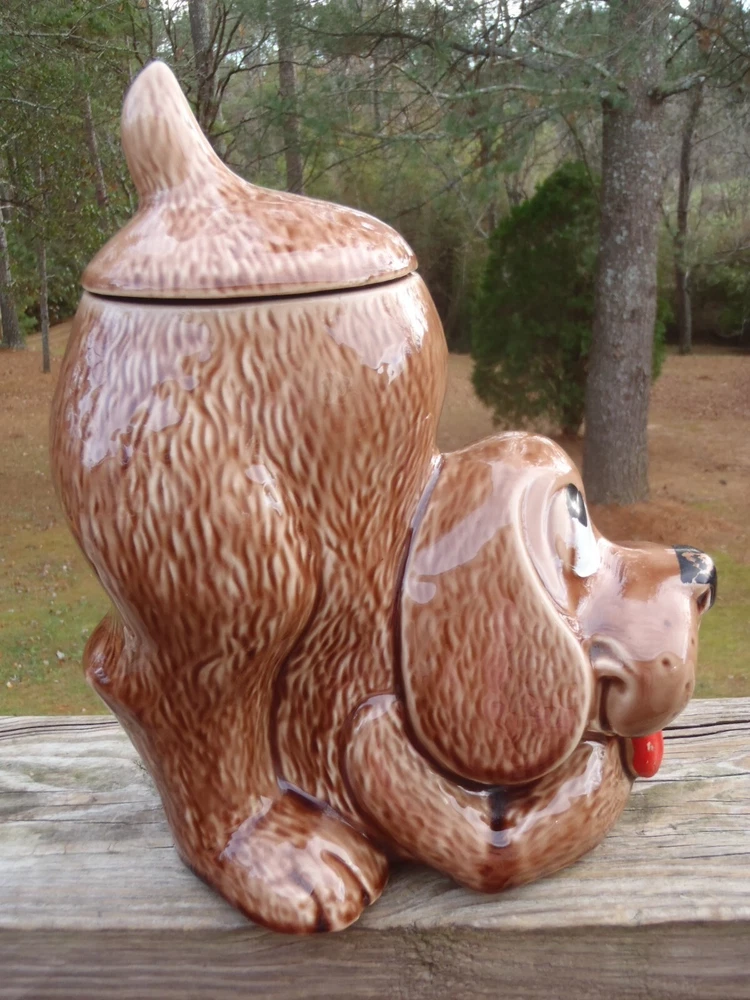 Up for bid here is a vintage McCoy Pottery brown thinking puppy hound dog cookie jar with most of the original cold paint still intact #272, c. 1977-1979. Please excuse the camera reflection glares, white spots, and shadows. The cookie jar is in very good condition with two small shallow chips on the very bottom of the dry base rim and minor cold paint wear (see pics), but there are no other chips, cracks, nicks, crazing, hairlines, wobble, or repair. It measures approx. 10 1/2" tall by 8 1/2" long and 6 1/2" wide. The very bottom is marked, 0272 U.S.A. This cookie jar could also be used to store dog treats and snacks. Folk s, this is a lovely vintage McCoy thinking puppy cookie jar and it would go wonderful in a collection or home. U SPS Ground/Priority and FedEx Ground/Home Delivery mail true calculated shipping costs is based on a insured well wrapped and packed 6 pound shipment, box size 9Lx9Wx12H. If you would like to see all the available shipping services with calculated shipping costs before placing a bid, please look under the Shipping & Payments tab above the Item Specifics on our auction page or scroll down to the Shipping, returns & payments section and hit the small arrow on the right of Returns, thanks. NO WORRIES ... YOU CAN BID HERE IN CONFIDENCE! We are a true U.S. seller, NOT a drop shipper and item ships from our U.S. location! As always ... Low Opening Bid and Never a Reserve! Plus, we NEVER end an auction early or CANCEL a bid after the auction has ended! PLEASE BID ONLY IF YOU ARE SERIOUS and INTEND TO PAY IF YOU ARE THE SUCCESSFUL WINNER! Our quality merchandise come directly from Estate Sales, private homes, thrift shops, and local auctions hand picked and purchased by my husband and me. As most of you may know, most vintage or used items will have some age and/or wear, and here we like to describe as accurate as possible and show many photos, so you know exactly what you are bidding on. So please read our detailed description and look at the pics as they are part of the description. Lord knows we are all only human and do make mistakes, but we honestly try very hard not to here so please rest assure and bid with confidence. Typically, our photos are shot outdoors under natural lighting on a not so fancy old railroad tie, rail, against our home, or somewhere outdoors or indoors, so please excuse any camera reflection glares, white spots or specks and shadows. Yes, we are old school and our descriptions also may be more lengthy than others, but we like you know exactly what you are buying/bidding on so there are no surprises. Please read the entire description, see all photos and ask any questions before placing a bid. All emails/messages are answered. We are rural and ship by USPS Ground/Priority and FedEx Ground/Home Delivery (true calculated shipping) and (free shipping) for local pick-up. We also recycle and use over-sized boxes and new high quality packaging materials to ensure your item(s) will arrive to you safe and unharmed. We do not charge for boxes, packaging materials, gas, or handling. We do not profit any money from shipping costs or sales tax. You are only charged true actual calculated postage and all items are shipped fully insured with carrier. We ship same or next day unless it is a holiday or a weekend, then shipment will be the following business work day. Payment is due within 3 days of close of auction. Unless you have made prior arrangements with us, please pay within the allotted time frame to avoid a strike against your account. North Carolina buyer must pay 7% sales tax. We combine shipping to save you money and give shipping discounts on 3 or more auction wins. The eBay combined shipping calculator is not always correct, so if you win 2 or more auctions please request or wait for a combined invoice for appropriate total. Our items come from a smoke free home. We do have pets, but all items are stored in a pet free environment until delivery day. Claims/Refunds - Please DO NOT request a return on merchandise damaged in shipping. Insurance claims can only be filed upon proof of damage (proof of damage is pictures which are most needed to file claims) and before issuing a refund. So if your item happens to arrive to you damaged in shipping, please contact us and DO NOT THROW ANYTHING AWAY. In order to file a USPS/FedEx online claim, we must have pictures of the shipping box at every angle, shipping labels (tracking/addressee), bubble wrap, wrapping/packing materials (packing/partitions), and of course the breakage. Once we receive all the requested pictures, we can send you a full refund ASAP. If there is a problem with your order, simply contact us. As an old-school eBay Seller, we list in the spirit in which eBay was founded; a place to find vintage, unusual, rare, hard-to-find, one-of-a-kind, and various high quality items at decent affordable auction prices! SHOP, BID and BUY IN CONFIDENCE! SATISFACTION GUARANTEED! Please, no buyer's remorse and ask any questions before buying or placing a bid. We have been selling on eBay for 25+ years and truly only want the very best for you and us both. We honestly describe all our items to the best of our knowledge and ability and show many photos, but if you have a question(s) or just need further info. or pictures, please let us know. We don't just want you satisfied; we want you to be a happy returning customer for years to come! ;) THIS IS A 10 DAY AUCTION and HIGHEST BID WINS! GOOD LUCK IF YOU BID! THANK YOU FOR LOOKING and HAVE A BLESSED DAY!