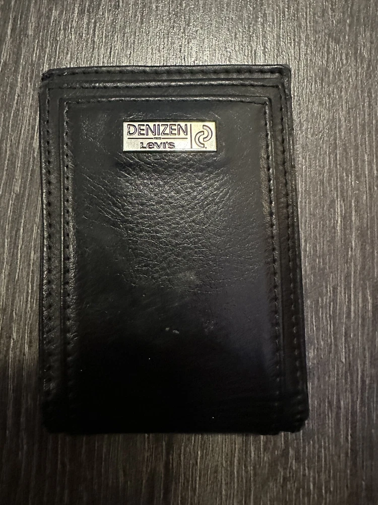 This vintage black wallet from Levi's is the perfect accessory for any stylish man. Made from high-quality leather, it features a solid pattern and a slim fold design for a sleek and compact look. The wallet is accented with the iconic Levi's logo and has a magnetic folding feature for easy access to your essentials. With enough space for your cash, credit cards, and ID, this wallet is both practical and fashionable. It's perfect for any occasion, whether you're running errands or going out for a night on the town. So why wait? Add this vintage Levi's wallet to your collection today!