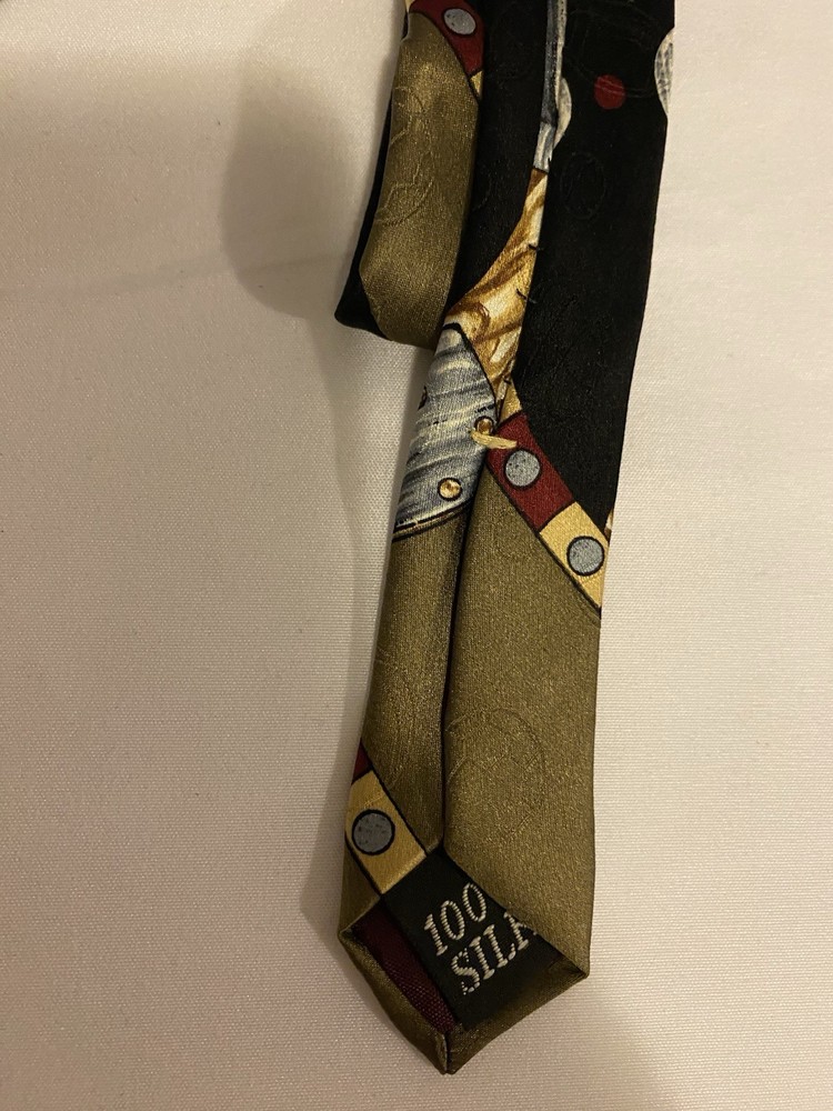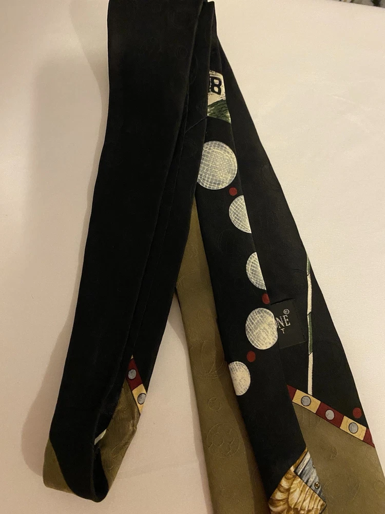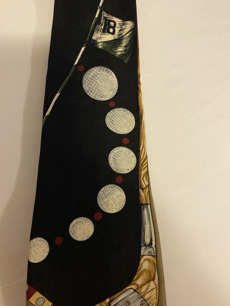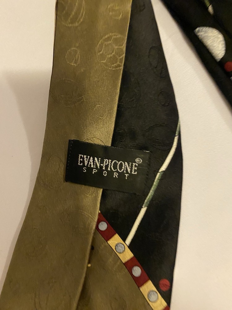 This Vintage Men’s Silk Evan Picone Golf Sports Design Tie features a golf design with sport balls in multicolor silk material, measuring 57"-60" in length. The designer tie showcases a golf theme, making it a unique addition to any man's formal attire. Made in the United States by Evan Picone, this adjustable tie is sure to add a touch of vintage style to any outfit.