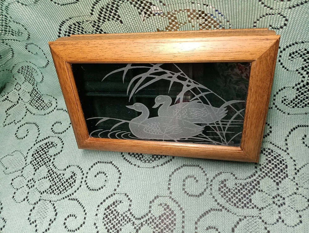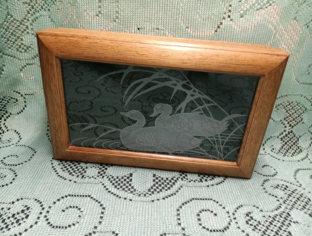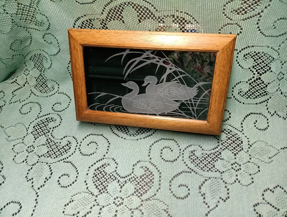 Vintage Men's Wooden Jewelry Storage Box Etched Glass Top Lid Ducks on Pond