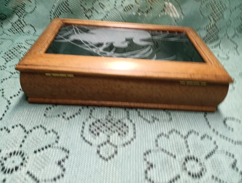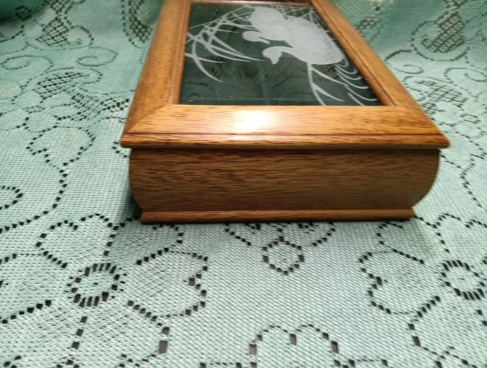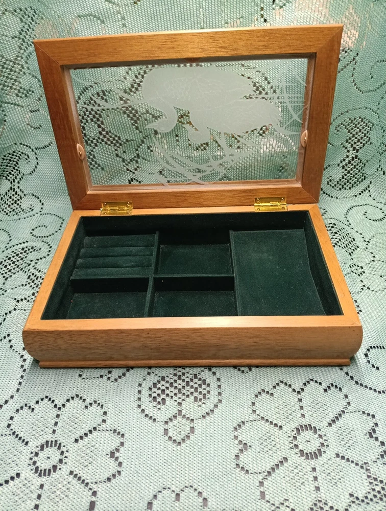 HomeVintage Men's Wooden Jewelry Storage Box Etched Glass Top Lid Ducks on Pond