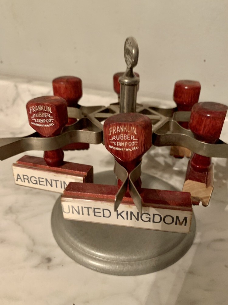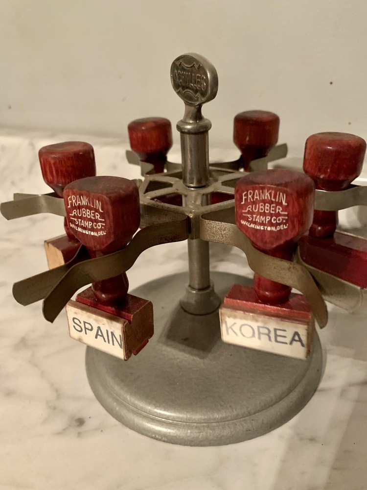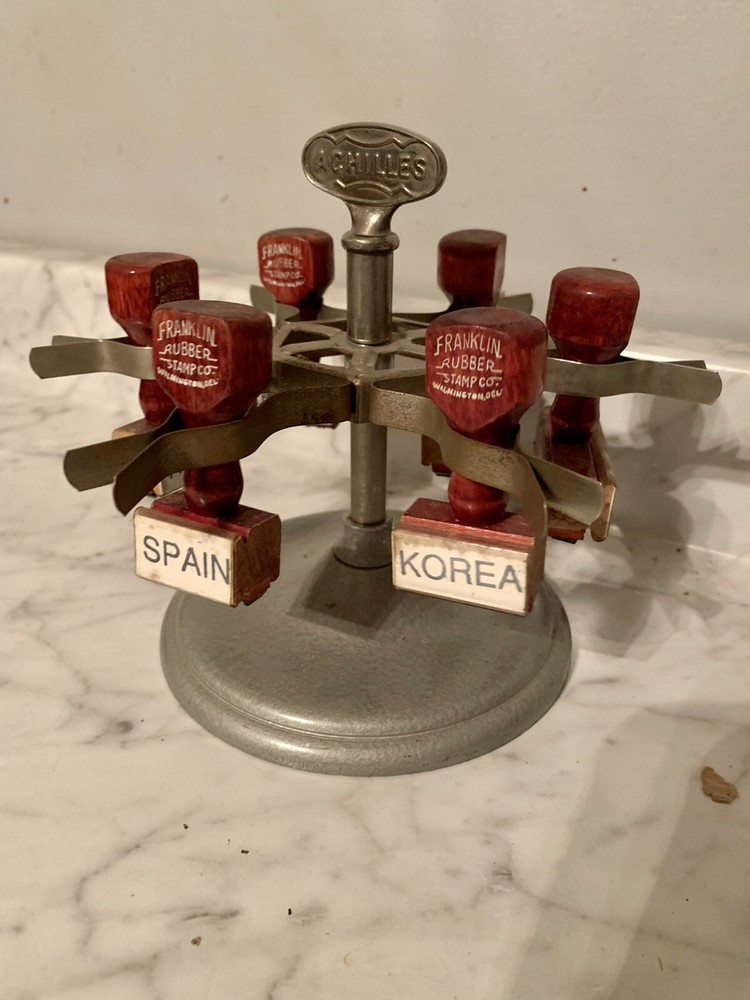 This amazing stamper was used for shipping material all over the world. What a simpler time. Vintage Metal Achilles Shipping Rubber Stamp Holder Tree Carousel. Measures 6 1/2” tall. Free US shipping.