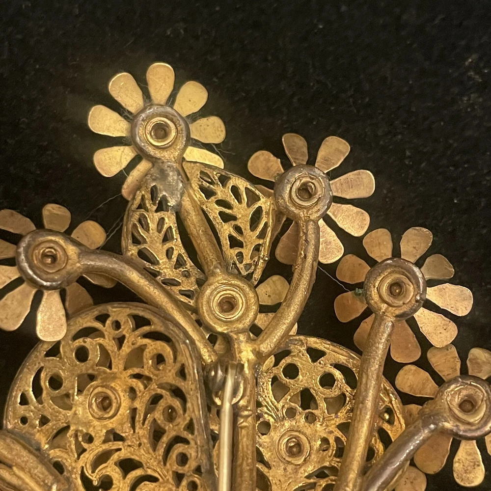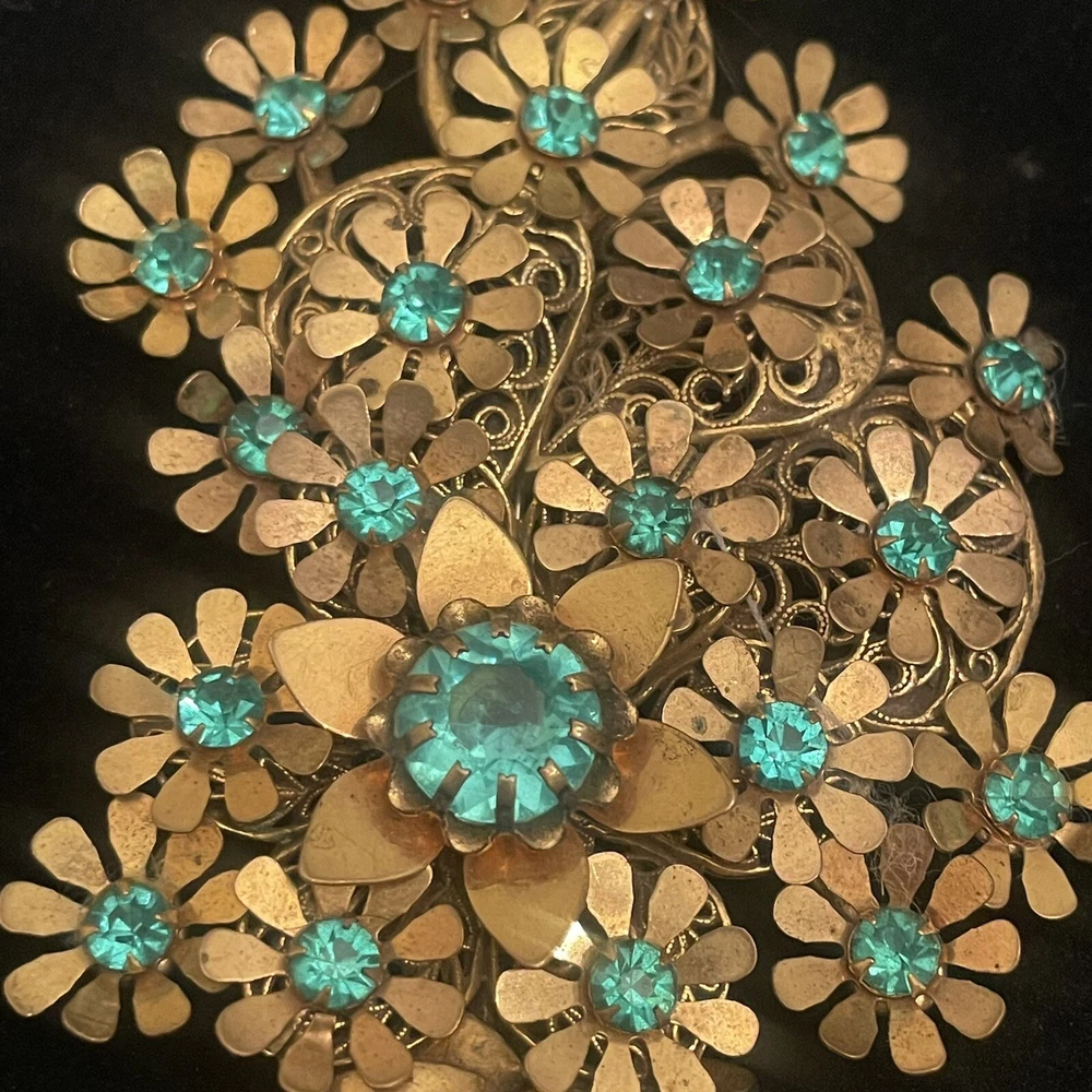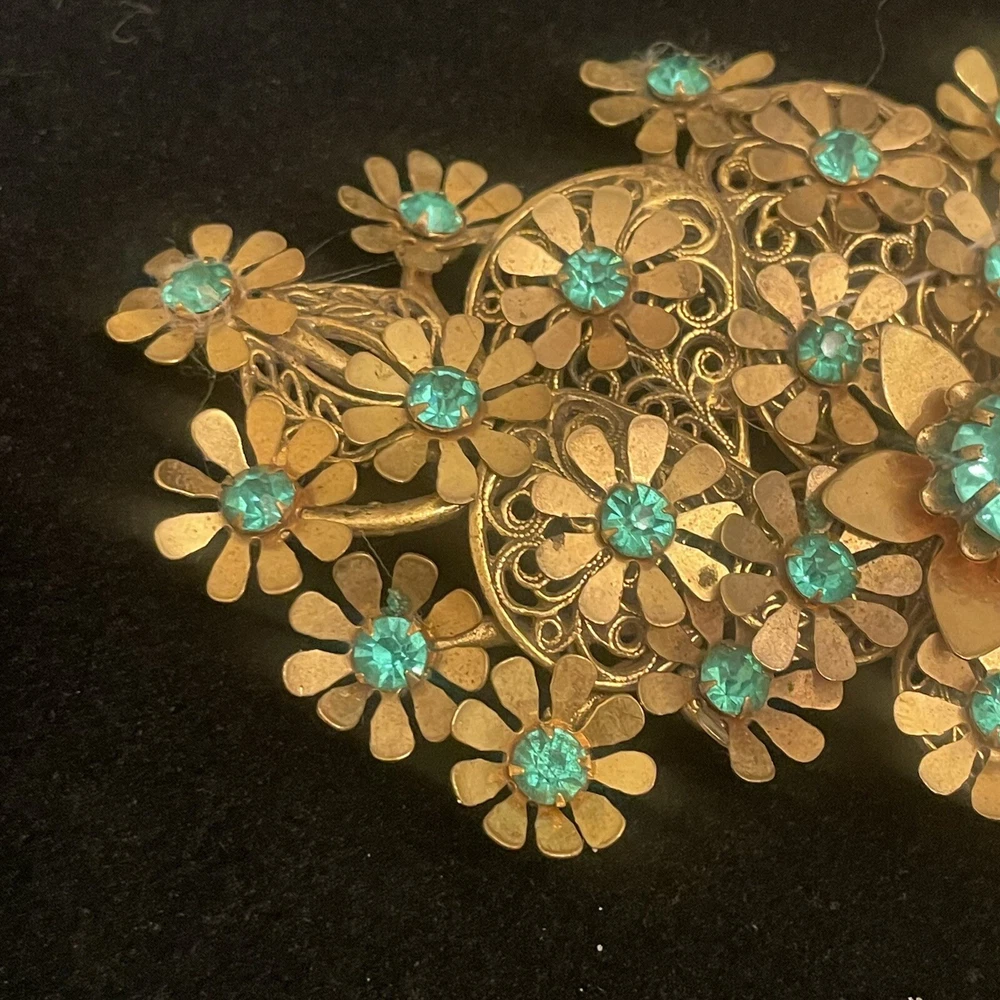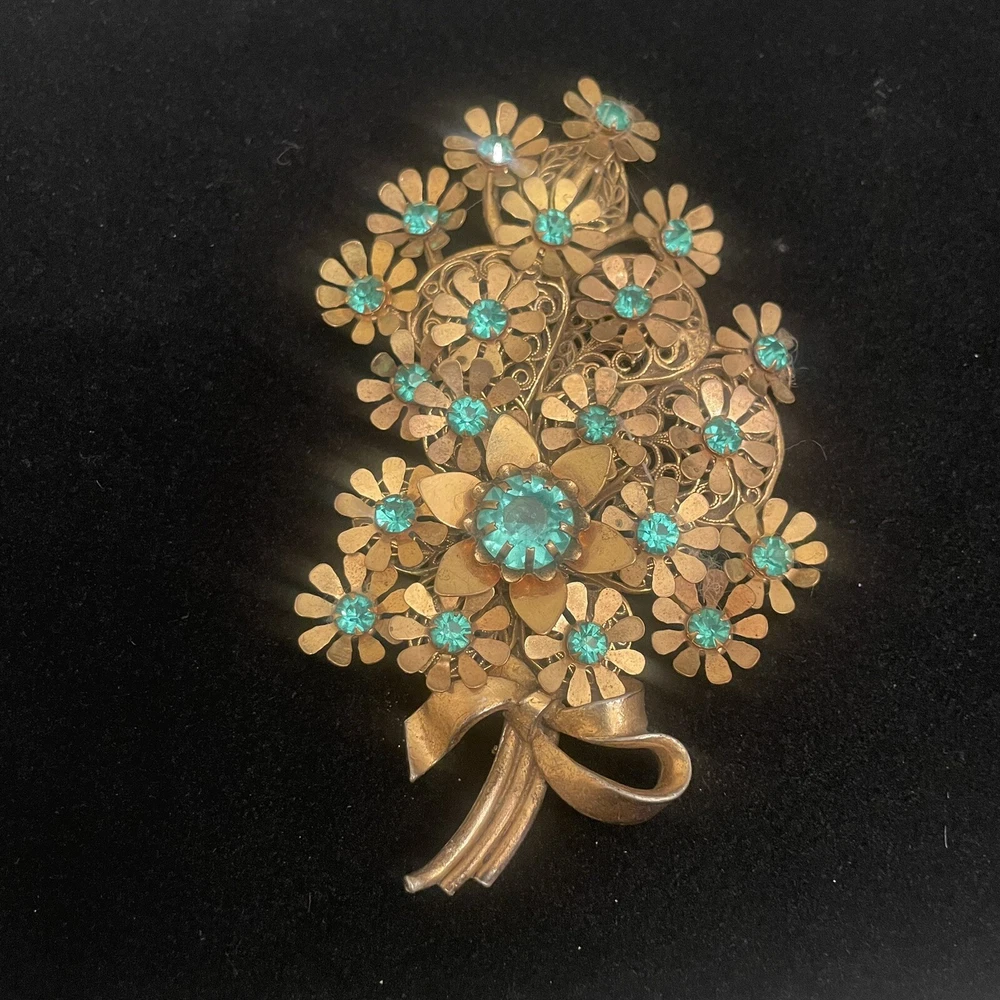 VTG Metal Floral Bouquet Ribbon Tied Brooch Aqua Rhinestones Shows Some Age & Wear. SEE ALL PICTURES