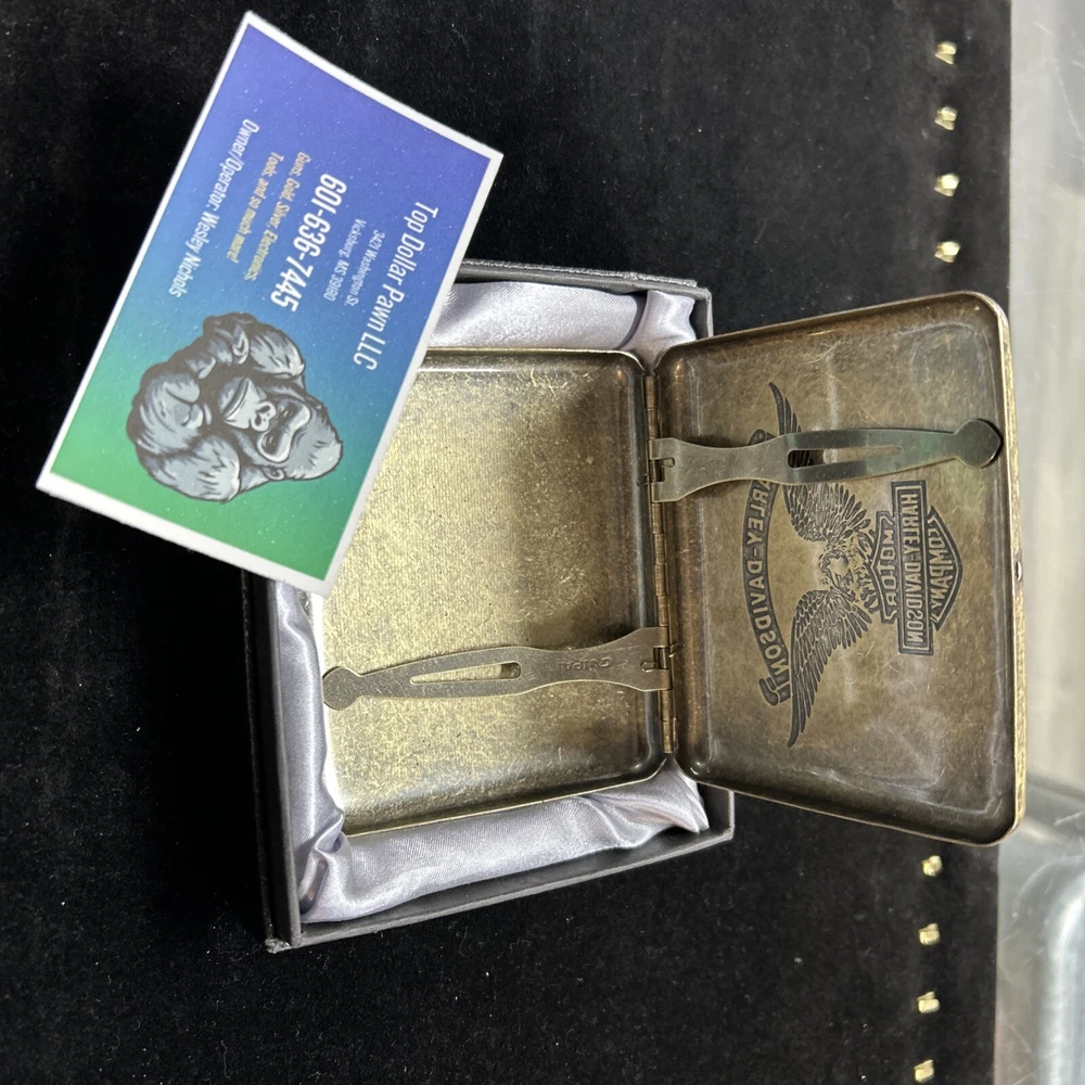 The vintage metal cigarette case is a bronze box designed in a retro Harley style, featuring a double-sided design for holding tobacco products. This tobacciana collectible showcases a unique and stylish appearance, making it a desirable item for collectors or those looking for a vintage accessory to store cigarettes. The intricate details and design of the case reflect a bygone era of tobacco culture, adding a touch of nostalgia to the item.