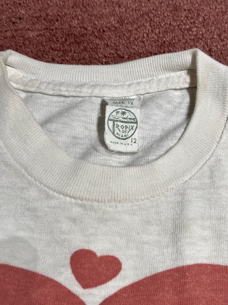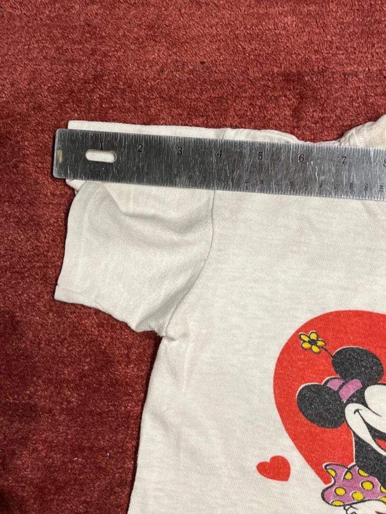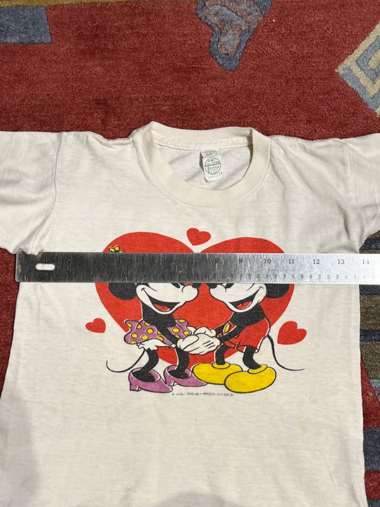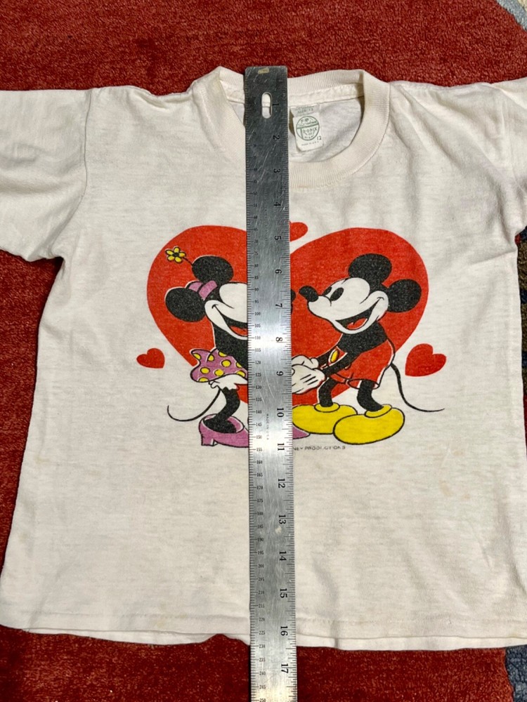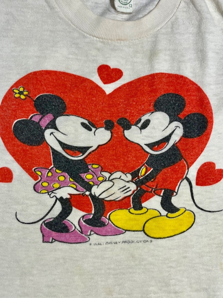 Collectable vintage "Mickey and Minnie Mouse in Love" tee shirt, Youth size 12. Perfect for Valentine's Day!!! The tee shirt shows signs of vintage wear, but is still strikingly colorful, beautiful, and cool. Micky and Minnie are holding hands within a large red heart. They gaze at each other with three small hearts circling around them. Micky wears his traditional red buttoned pants and yellow shoes and Minnie's purple and yellow polka-dot skirt matches her purple shoes. The label is still attached, and Walt Disney Productions is stamped below the main image. Measurements: across chest = 14", top to bottom = 16", sleeve length = 4" This is a truly unique shirt; I did not see the same one anywhere on the internet. This tee shirt was worn by my daughter in the late 1970's and was purchased at Anaheim California's original Disneyland. It was stored away carefully when she outgrew it a long time ago. It's a beautiful purchase for anyone who loves Mickey and Minnie would cherish this vintage tee shirt.