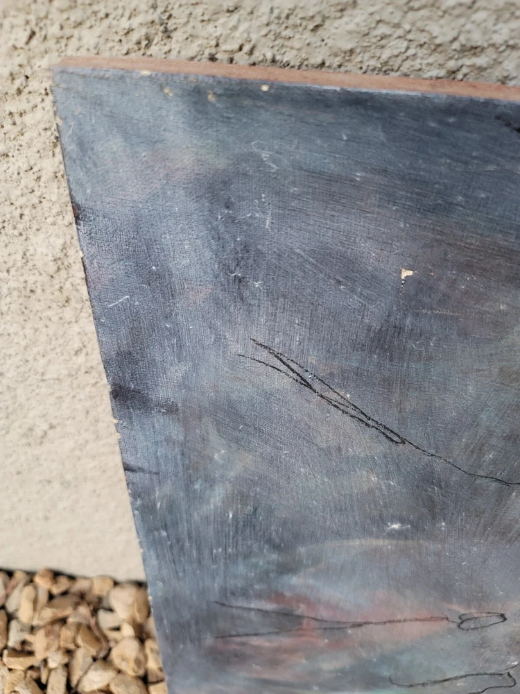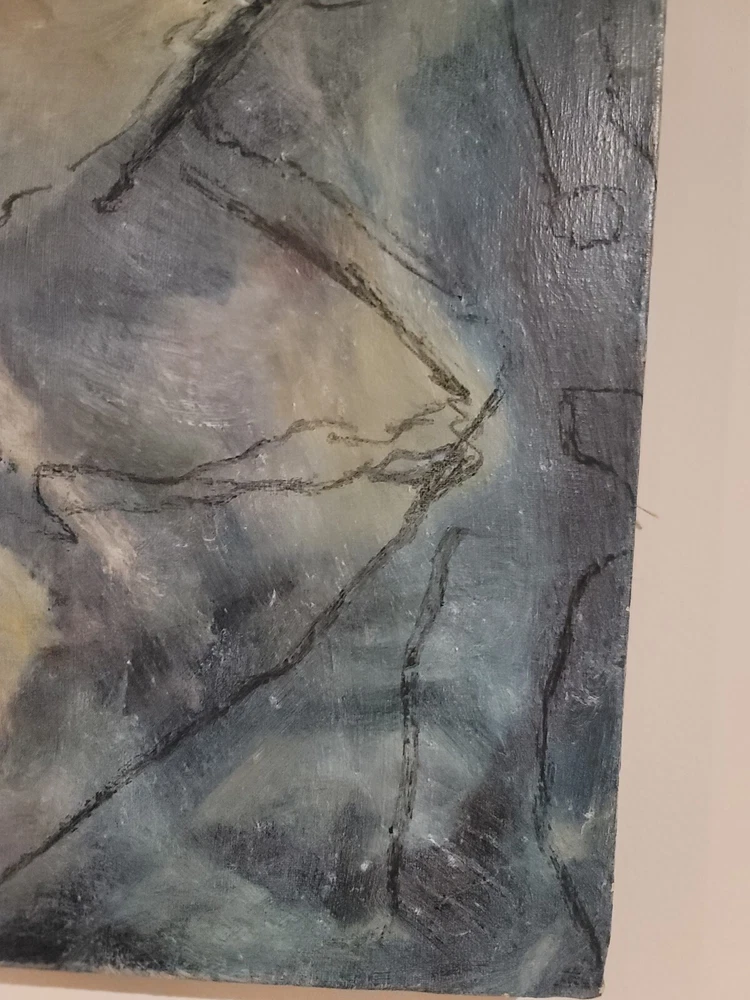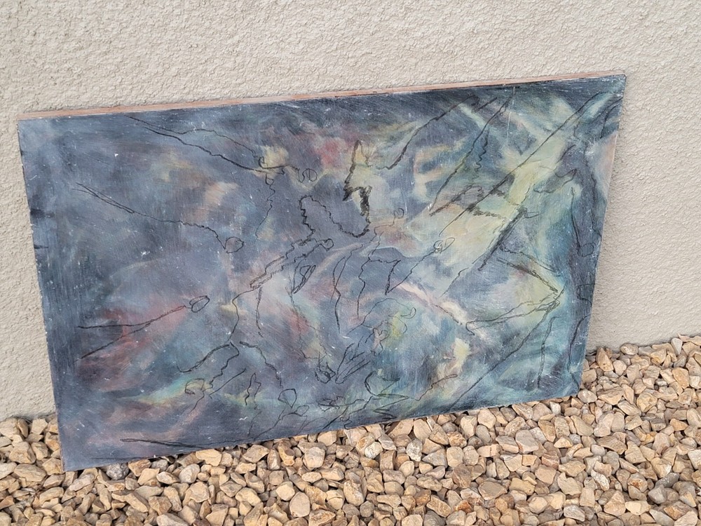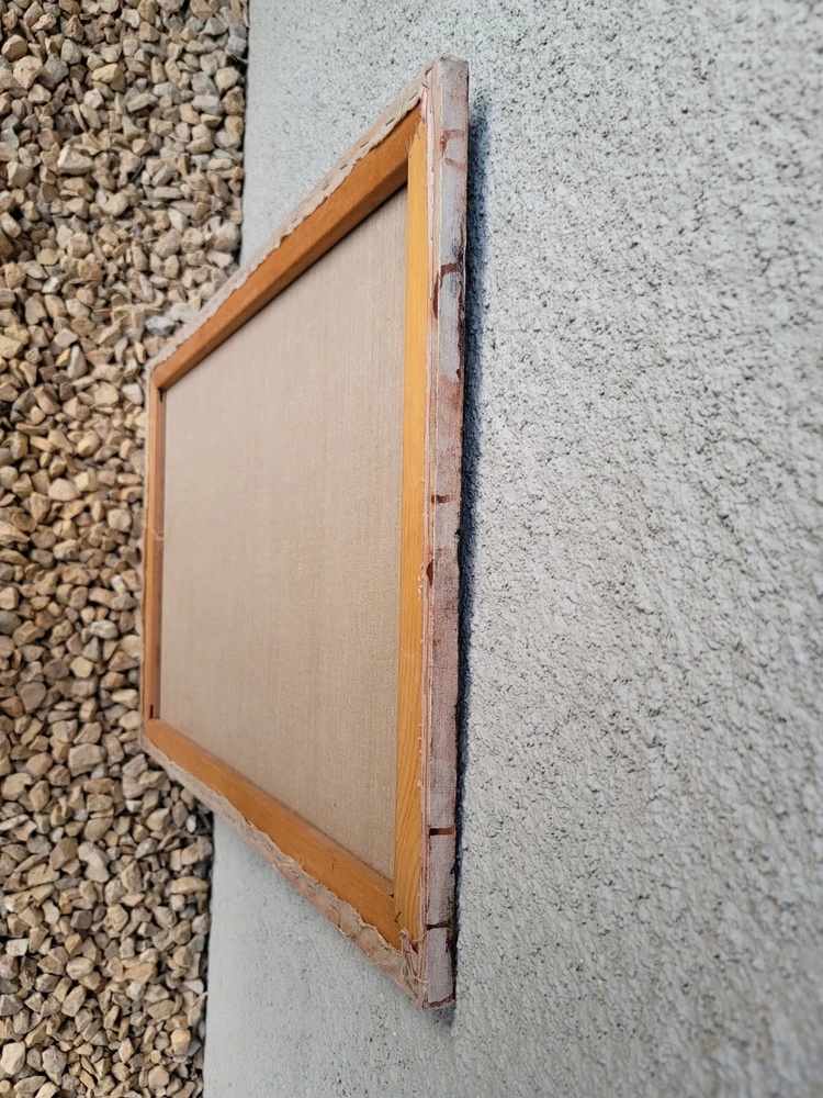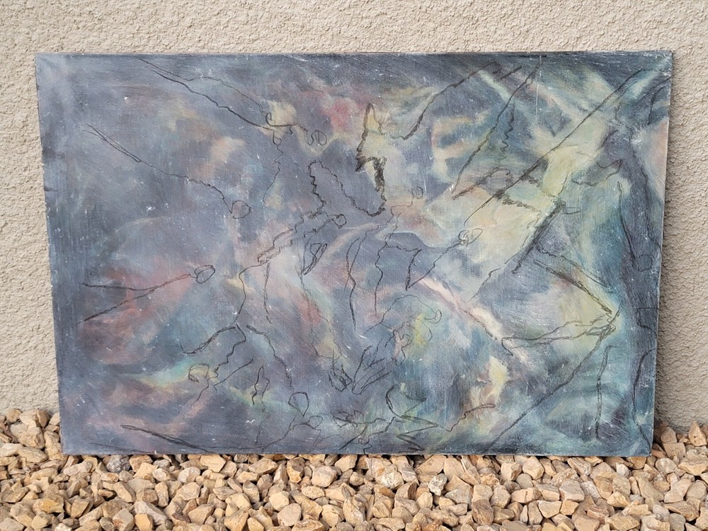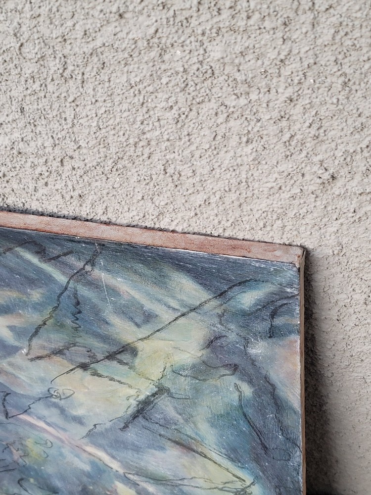 This is one of my very favorite vintage original Mid Century finds from Palm Springs. Appears to be from the 1950's or 1960's. Unsigned but obviously painted by an artist of the period of some significance. The oil on canvas painting measures about 30 x 20 inches. In good vintage condition but you will notice a few specks and scratches on the canvas from age and wear. No punctures but one near miss, as shown in the photos. I can see the spirit of Chagall and Picasso in this piece. There were no clues as to how the artiste meant for it to be hung so I have photographed it in varying positions.