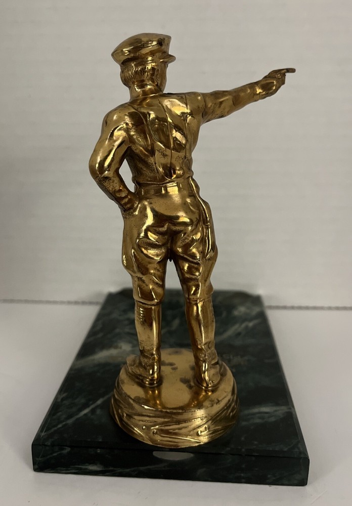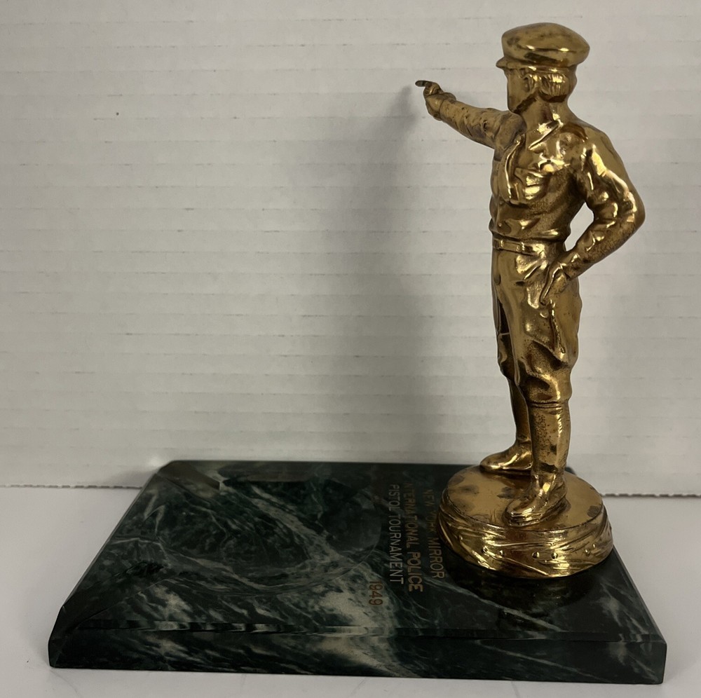 Mid Century Brass Police Shooting Trophy With Resin Ashtray Figural trophy ashtray is in very nice condition. The police figure is brass and the ashtray is some kind of resin. I believe this is mid century.