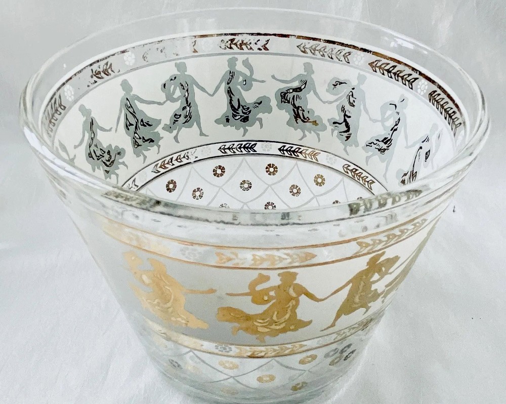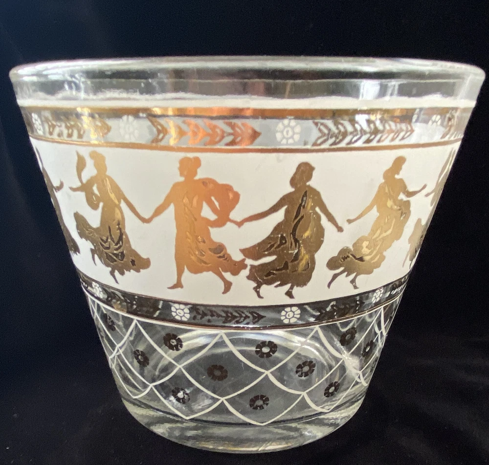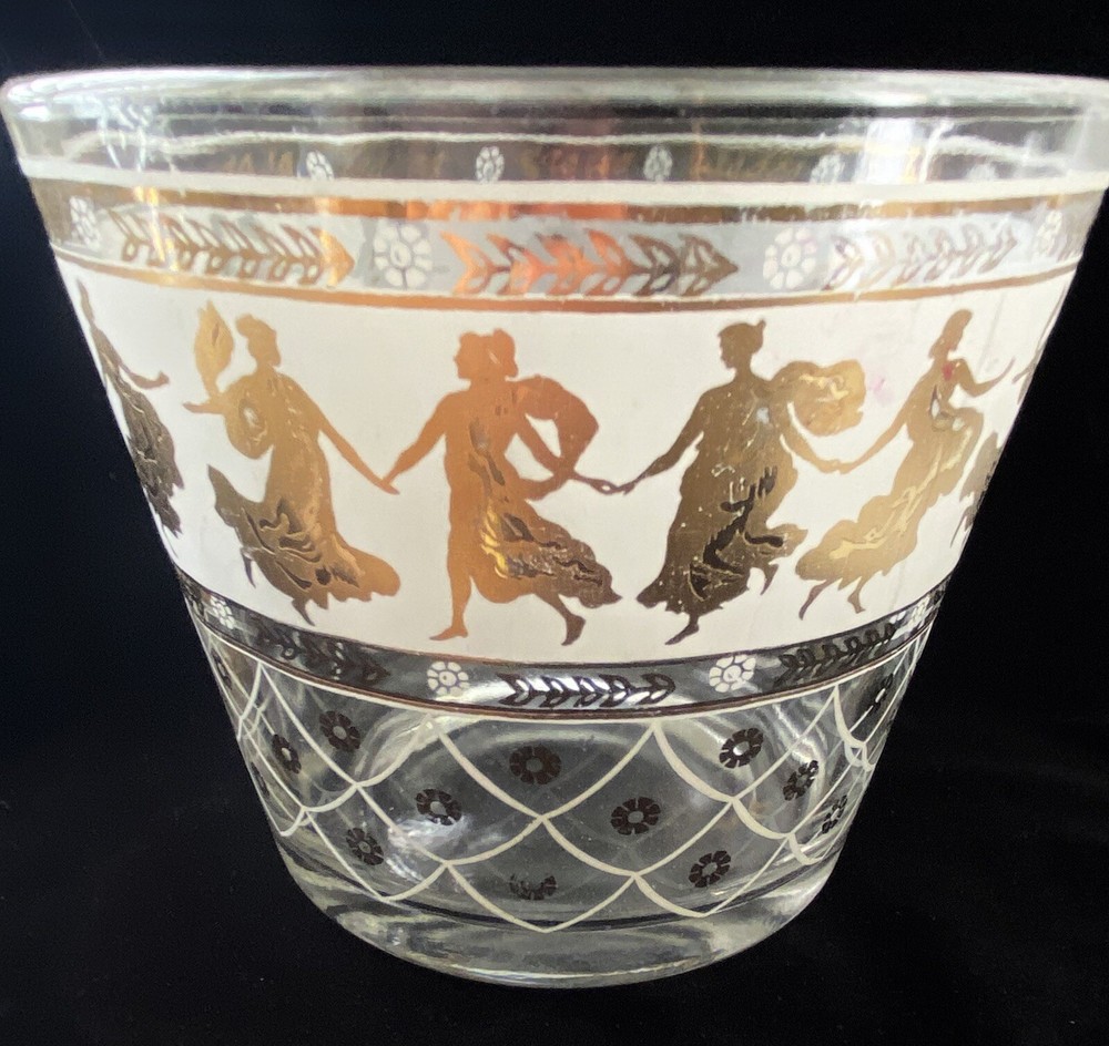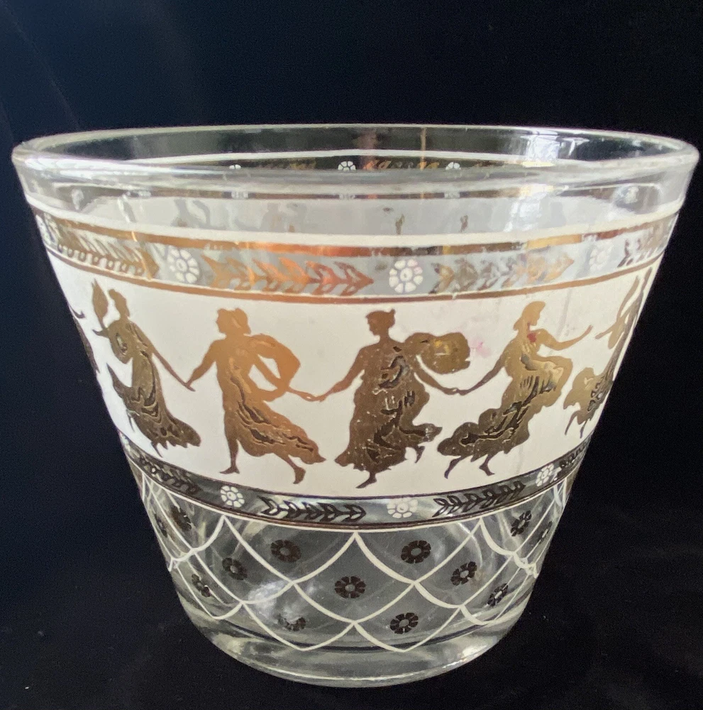 Description: For your bidding consideration is a Vintage MidCentury Glass Ice Bucket with Gold Grecian Figures and White Lattice Work onthe bottom with Gold Florets. The glass bucket measures 4 & ¾” high and 5& ¾” in diameter. Please see the other items that I have listed on ~objet_de_arto ~ MY POLICIESPLEASE READ - IF BID YOU AGREE: Payment: PLEASE make payment within TWO days of the end of the auction . NOE-checks - PAYPAL ONLY ***Due to an increase of non-paying buyers, anunpaid item case will automatically be opened if payment is not made within 2days. Shipping: FAST shipping! I will ship your items to you thesame day I receive your payment whenever possible. When payments are made after2 p.m. Monday thru Friday or on weekends and Holidays I will ship your item thenext business day. Packing, time, gas supplies, and fees are included, soif shipping is high to you, please pass on my items, thank you. I amalways willing to combine shipping costs (combined shippingFirst Class or Priority, whichever is best for the items/quantity) whenmore than one item is purchased, so check out the other items that Ihave listed! Refunds: Only for gross errors. Not for remorse or very minor thingsas an excuse. Feedback: I appreciate your business and prompt payment. I leavepositive feedback and I appreciate you leaving me positive feedback too. If youhave any questions regarding your purchase please contact me before opening acase or leaving any neutral or negative feedback so that I can have theopportunity to resolve the issue so we both are happy! Thanks so much! Communication: Through eBay messages, please.