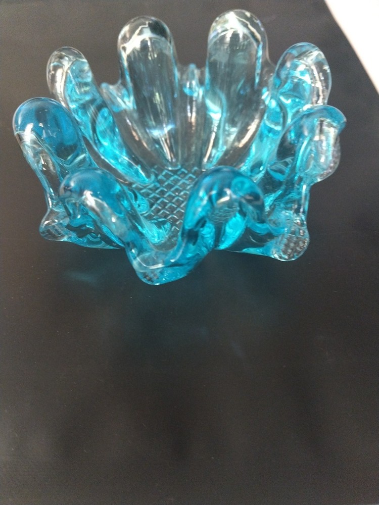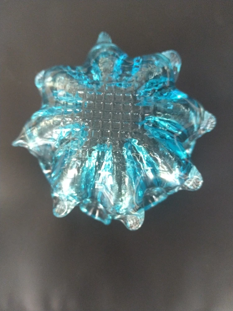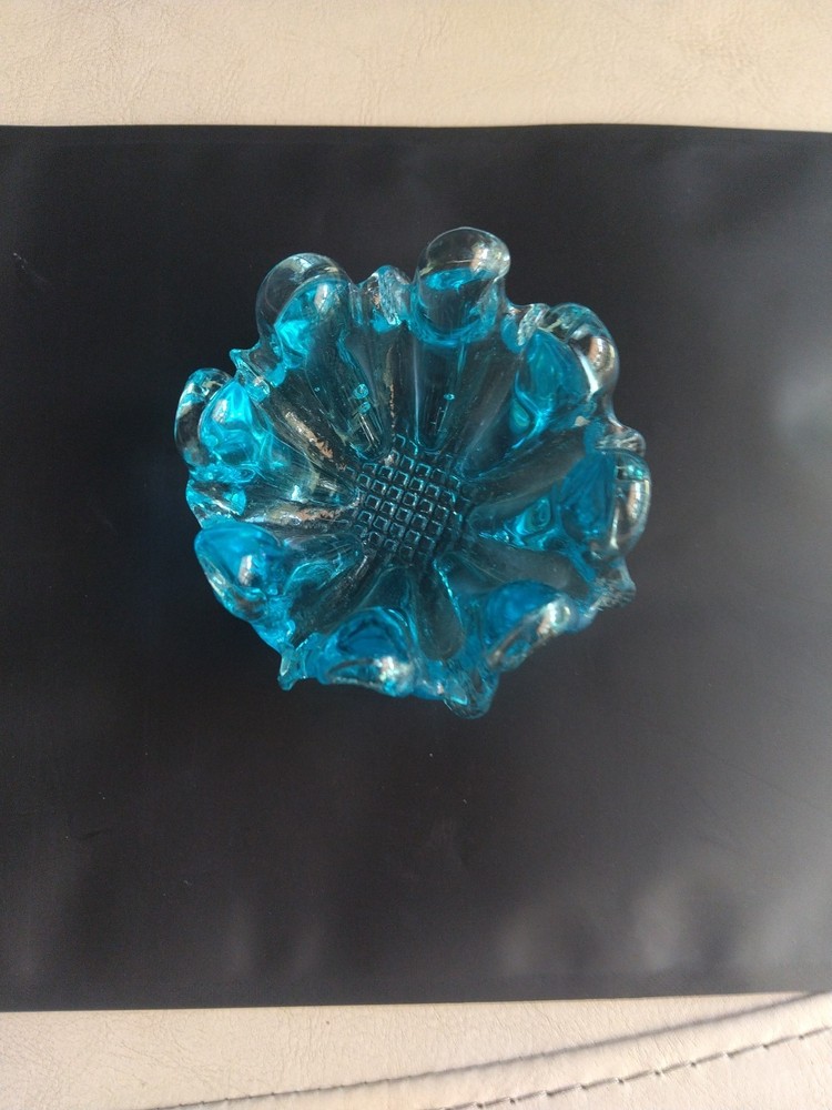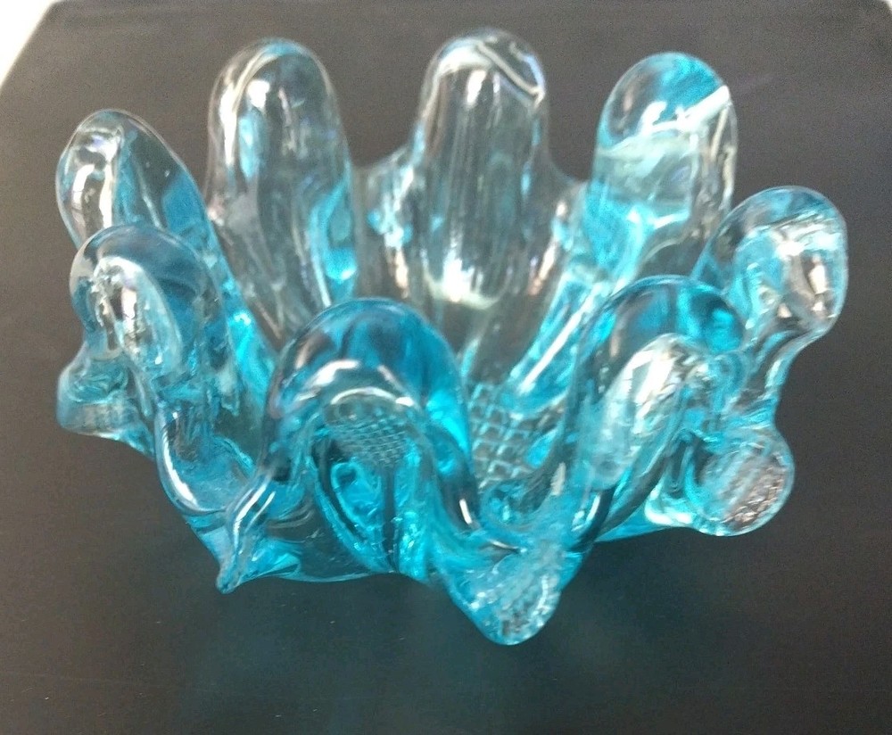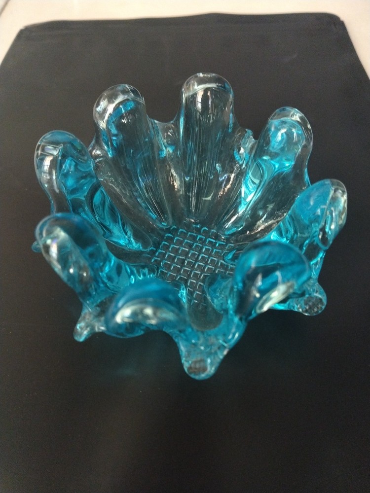 This vintage MCM art glass nesting bowl is a stunning piece that will add a touch of elegance to any collection. The bowl features beautiful ruffle edges and a clear glass that showcases the bubbles created during the hand-blown process. The bowl is perfect for use as an ashtray, trinket dish, or decorative piece. The artist behind this piece is unknown, adding to its mystery and allure. The bowl is made of high-quality glass and is a vintage original from the 1960s. It measures 3 inches x 2 inches and is in excellent condition. This bowl is a must-have for any collector of mid-century modern art glass.