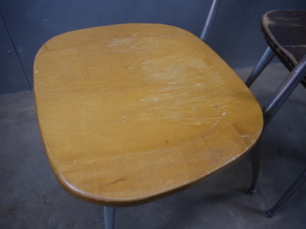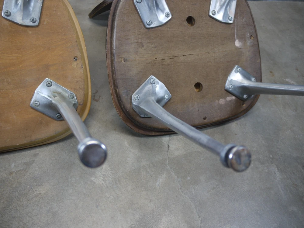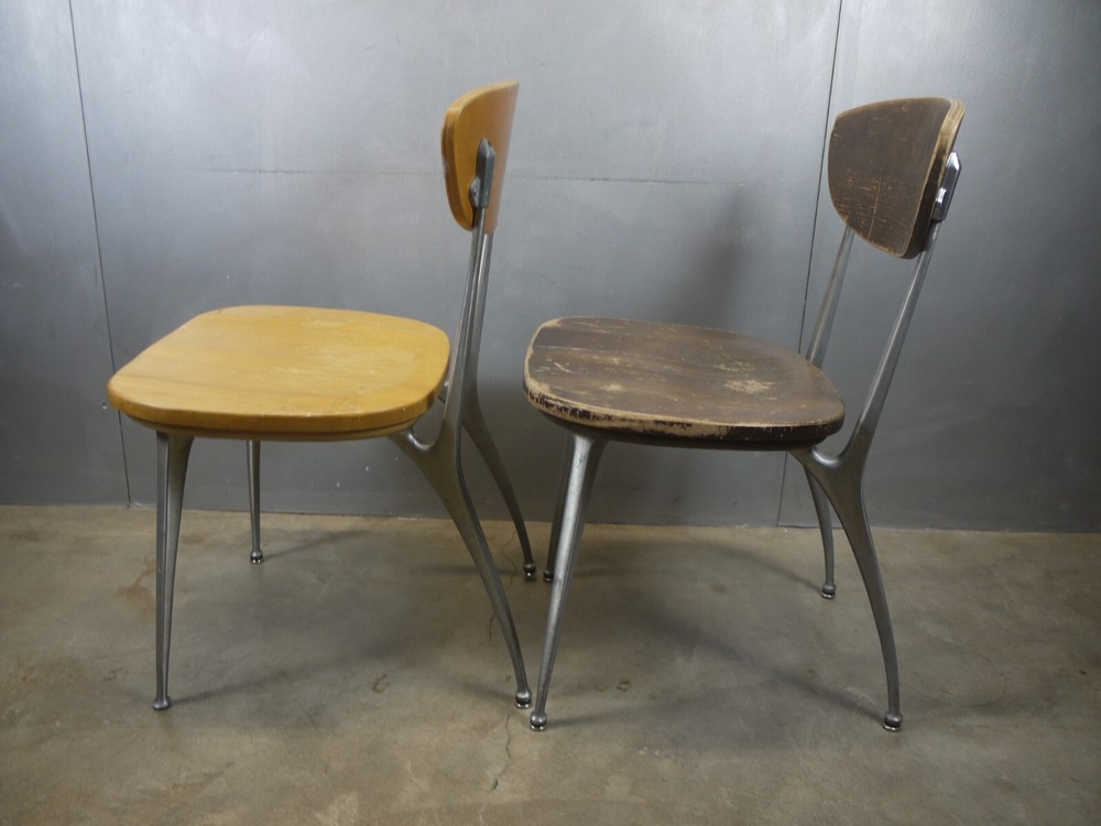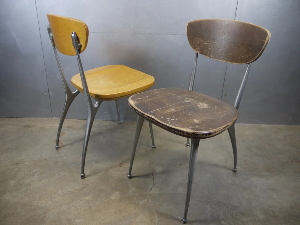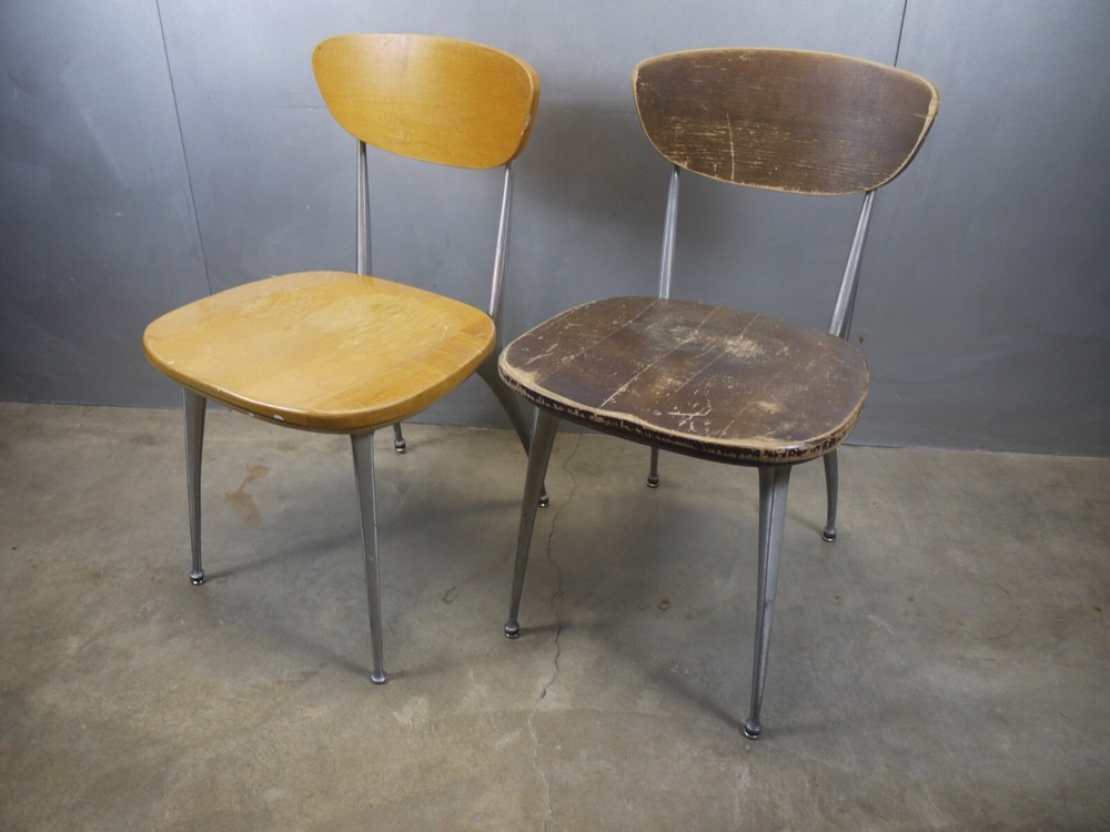 Just as found. Just as pictured. Wear and patina consistent with age and use. Blonde one is missing a foot glide. Darker one has cracks in the seat. Worthy of full restoration. Ships professionally packaged UPS ground to the lower 48 only for a flat $59.95. No PO Boxes. Assembly required.