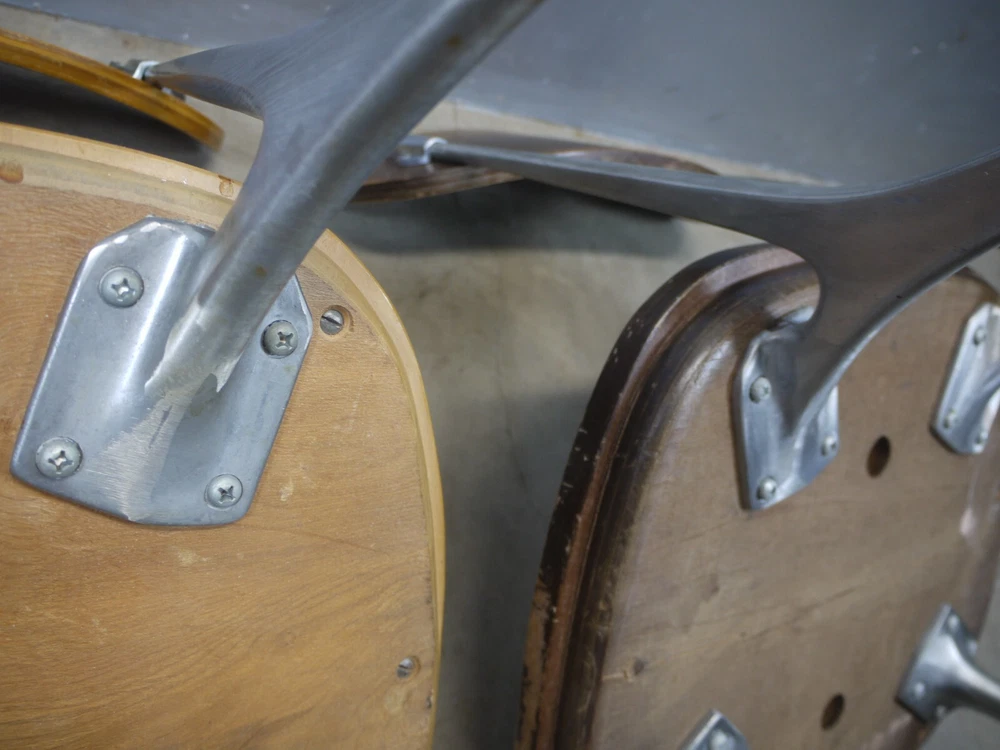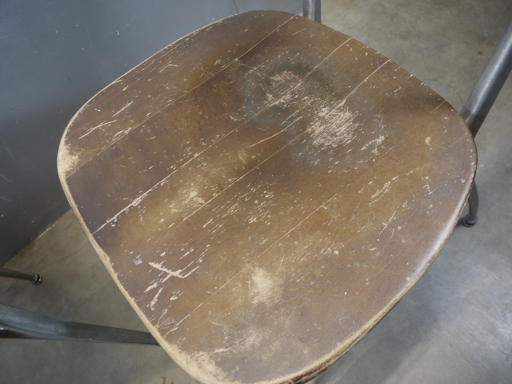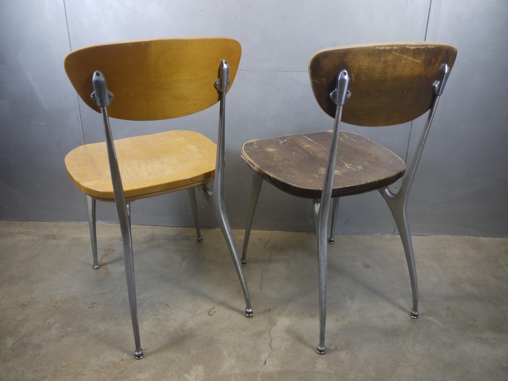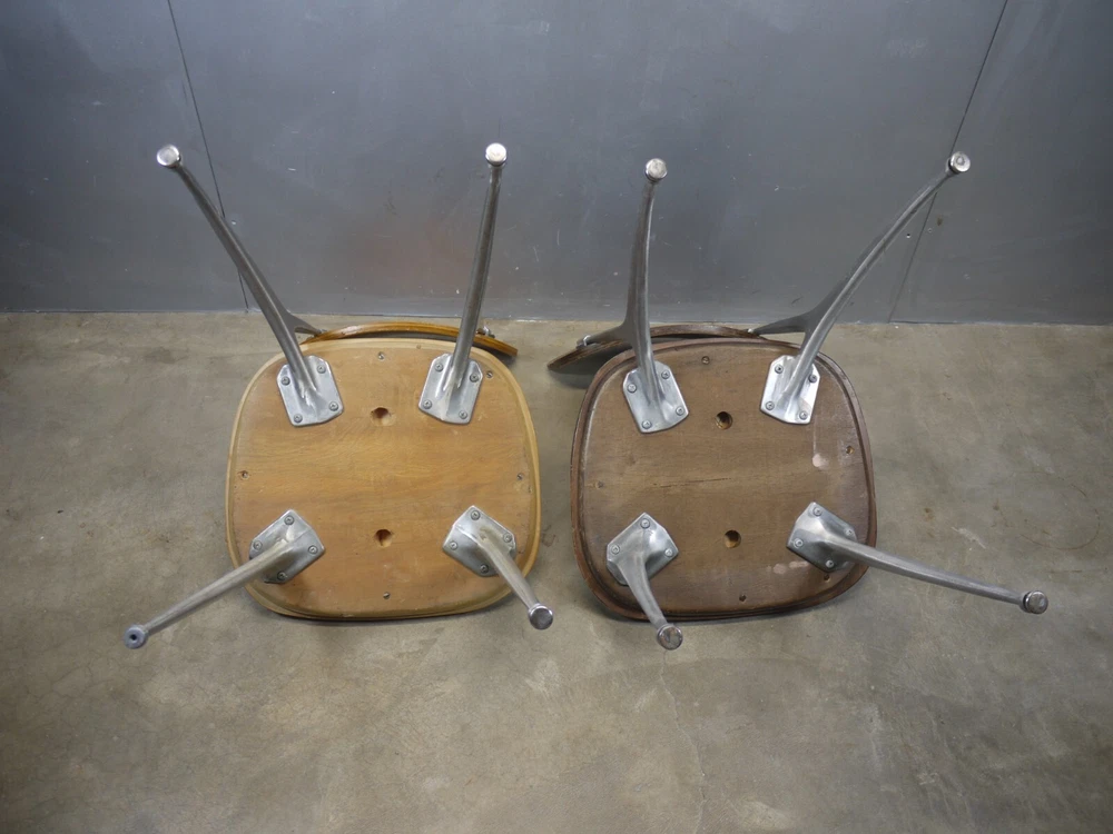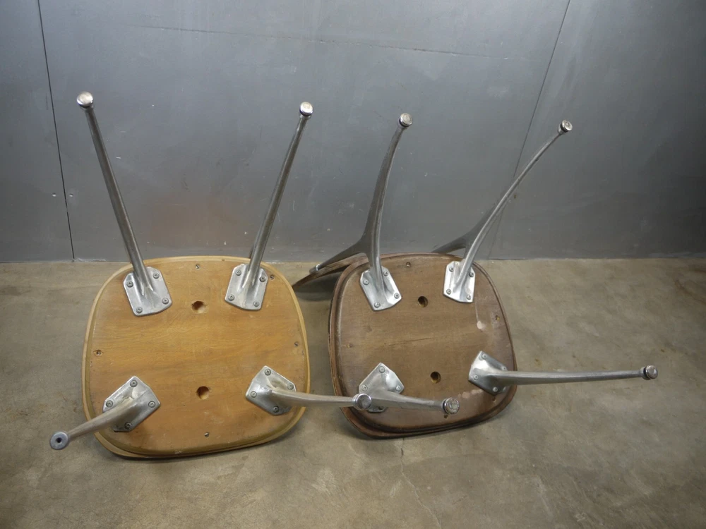 Just as found. Just as pictured. Wear and patina consistent with age and use. Blonde one is missing a foot glide. Darker one has cracks in the seat. Worthy of full restoration. Ships professionally packaged UPS ground to the lower 48 only for a flat $59.95. No PO Boxes. Assembly required.