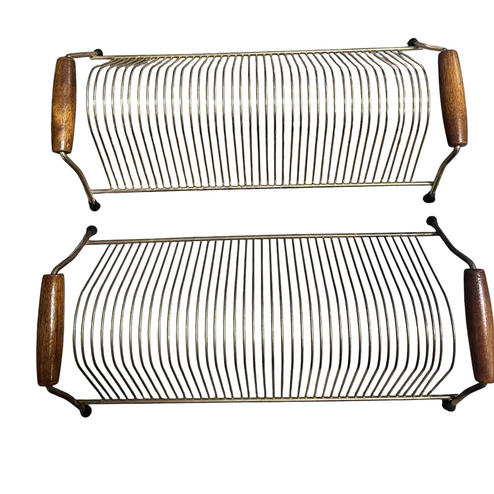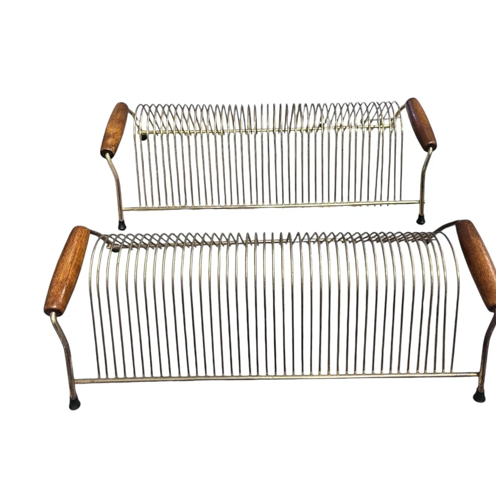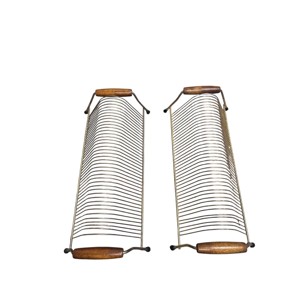These vintage record racks are a must-have for any mid-century modern collector. Its sleek design and wire holders make it a stylish addition to any room. Manufactured in the 1960s, the exact country or region of manufacture is unknown, but it is clear that these racks are a true piece of history. Not only are they functional for storing and displaying records, but they also add a touch of nostalgia with their retro style. They are not handmade and have not been modified in any way. These collectible items fall under the categories of vintage, retro, and mid-century, making it a unique find for any enthusiast. The wire racks are gold in color and have wooden handles that add to the MCM charm . They each measure 13” long and 6” wide and 3 1/2” tall .
