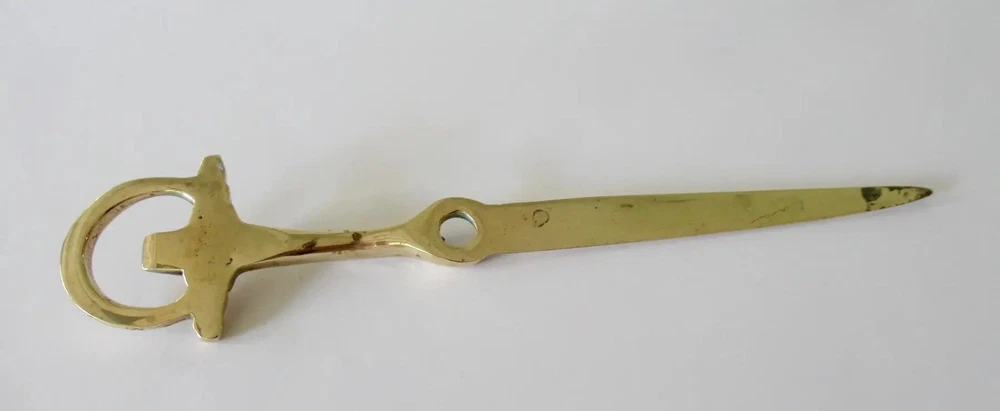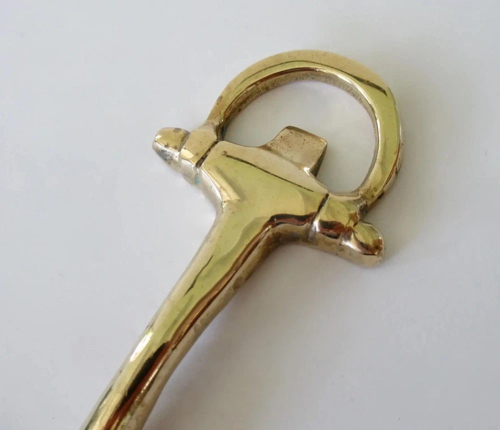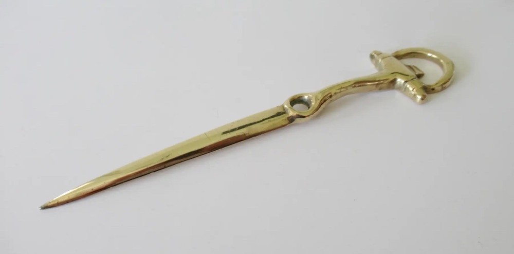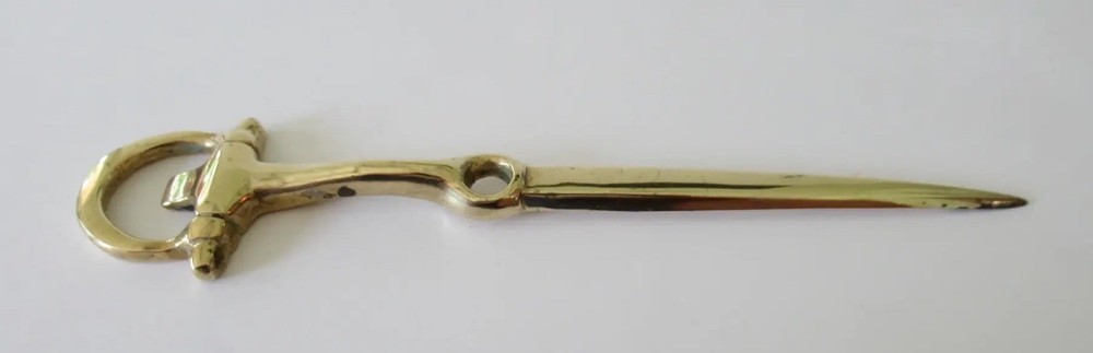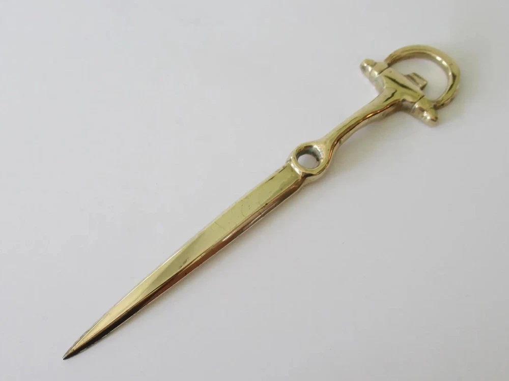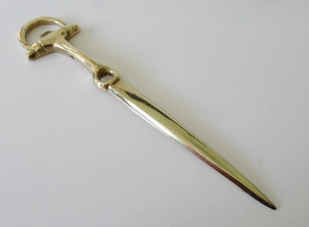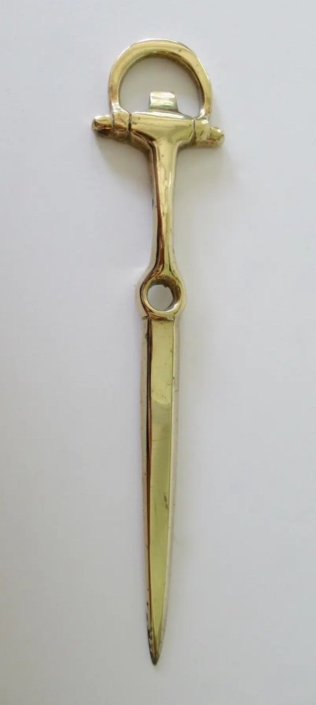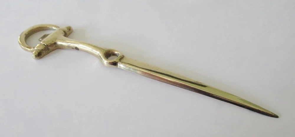 Vintage: C.1960's Equestrian-style, horse shoe shaped brass letter opener. In great condition with brass patina, even though we polished this to heighten the green to the brass. From an Upstate, NY Estate. Dimensions 8ʺW × 1ʺD × 0.5ʺH