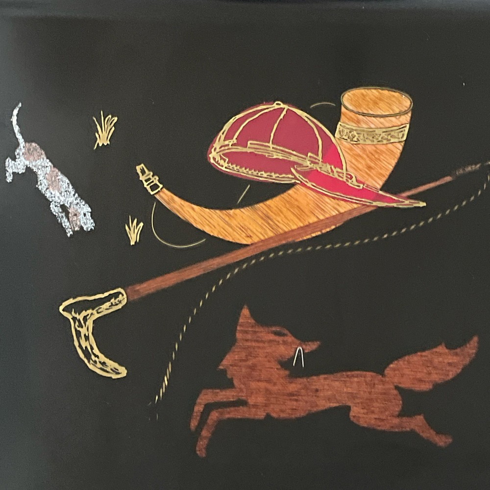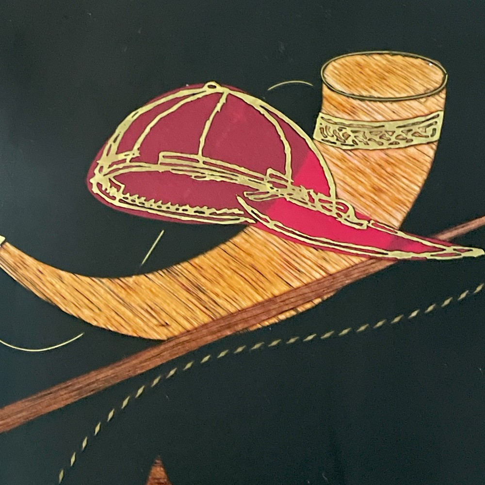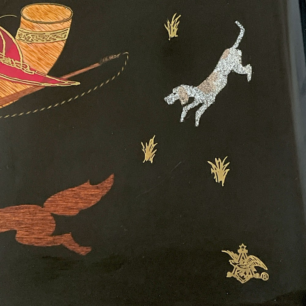 The Vintage Mid-Century Modern Couroc of Monterey Black Bar Tray with Hunt Scene is a large, rectangular serving tray made of plastic with a glossy finish. It features the insignia of Anheuser-Busch Brewing Company, in the mid-century modern style. Hand wash only to maintain its original quality. This unique tray adds a touch of vintage charm to any space, perfect for serving drinks or displaying decorative items in a stylish way. The tray is in excellent condition with no chips, scratches or damage to the surface. It measures 18” x 12 1/2”. West Coast shipping > FedEx. East Coast and Mid-West shipping > USPS Ground Advantage.