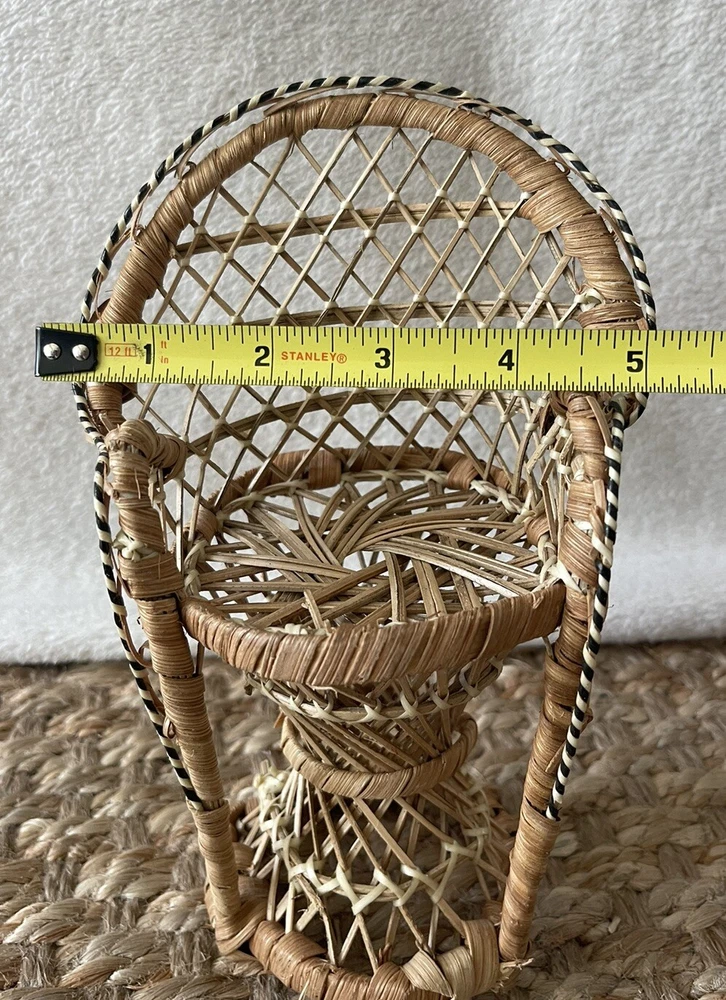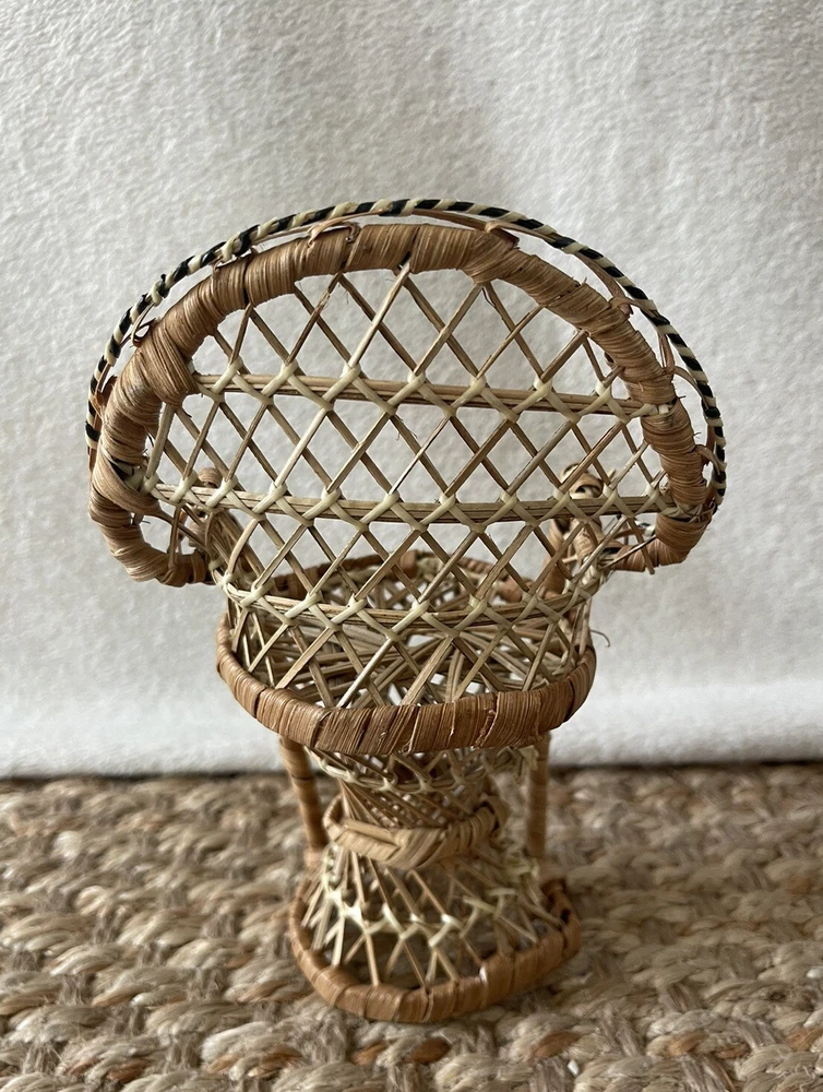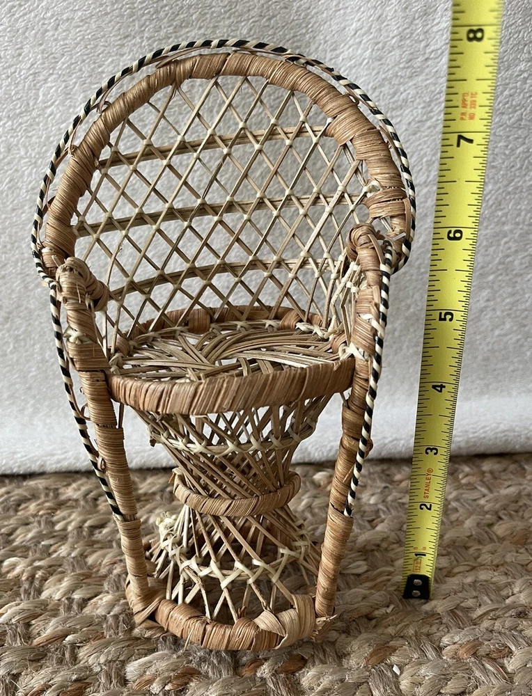 This vintage wicker peacock chair plant stand is the perfect addition to any indoor or outdoor space. The charming brown color and boho theme make it a great fit for any decor style. Measuring at 8 inches in height and 5 inches in width, this medium-sized plant holder is perfect for displaying your favorite small potted plants. The wicker material adds a classic touch and the care instructions are simple - clean with a damp cloth. This plant stand is great for any occasion and is perfect for adding a touch of summer to your home or garden. The doll size is ideal for smaller plants and will make a great addition to any collection. Thanks for looking! :)