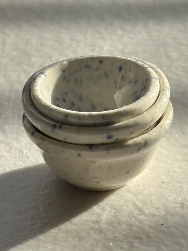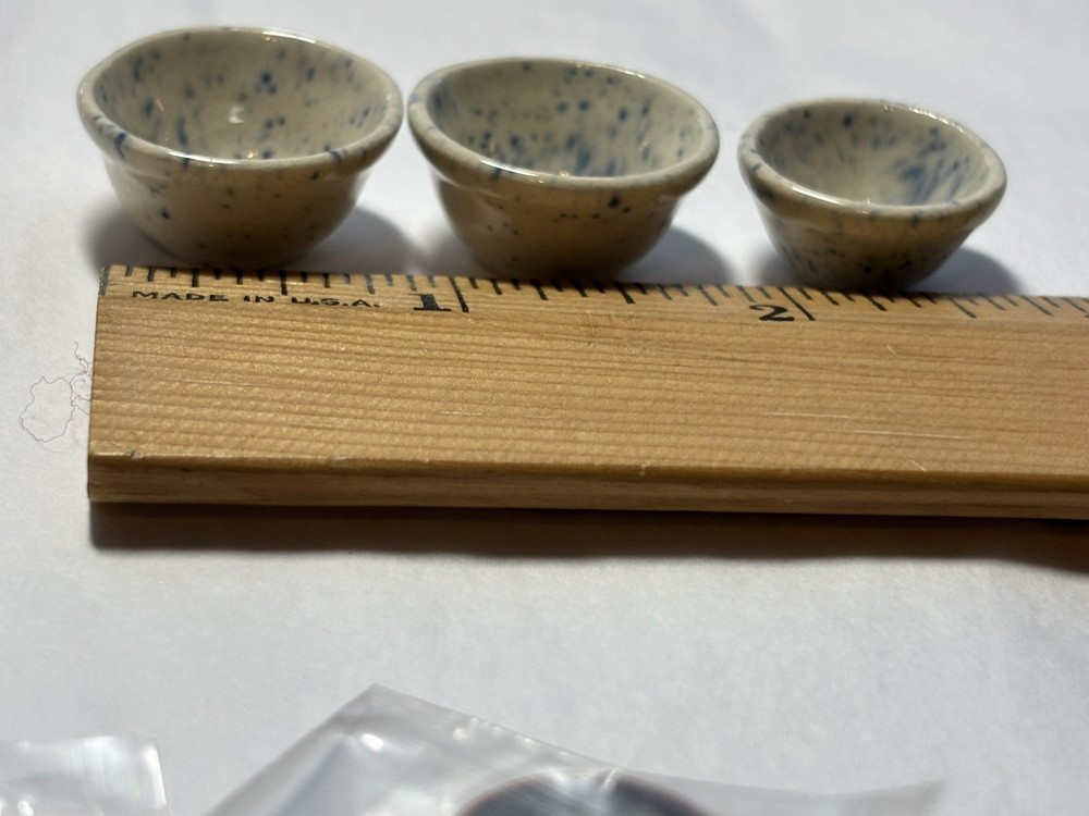 Vintage MCM 3 miniature dollhouse (2-7/8” diameter and 1 about 5/8” diameter)blue speckled bowls , with off white background, either made out of pottery or ceramic , very good vintage condition , slight wear to glaze Please examine all pictures and read entire description before purchasing this item Any questions please contact me before purchasing Smoke Free home