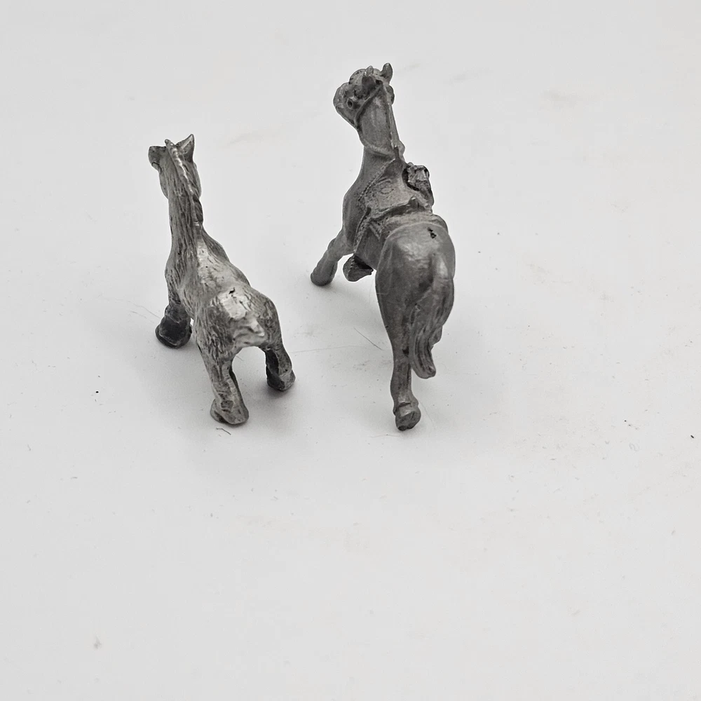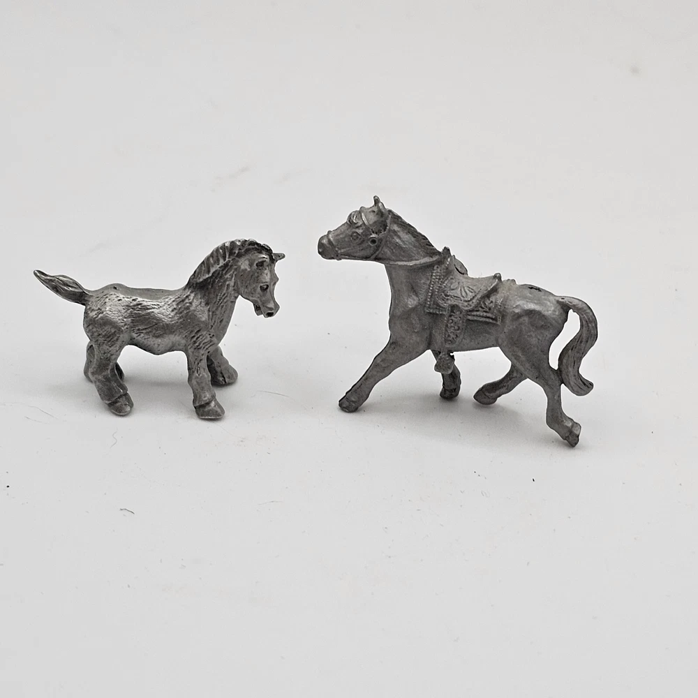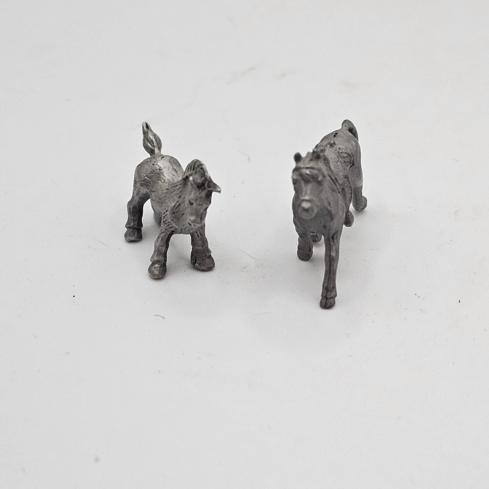 This set of two miniature pewter figurines is a must-have for any horse lover's collection. The intricate details of these foals are sure to impress, from their delicate manes to their sturdy hooves. Crafted from high-quality pewter, these figurines are built to last and will make a charming addition to any display. Whether you're a seasoned collector or just starting out, these miniature horses are a great way to add some charm to your home decor. Perfect for any room in your house, these figurines are sure to be a conversation starter. Don't miss out on the opportunity to own these delightful decorative collectibles.