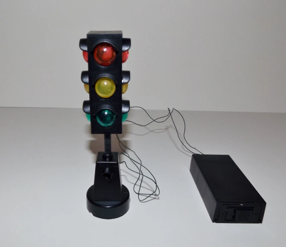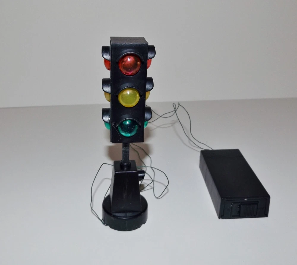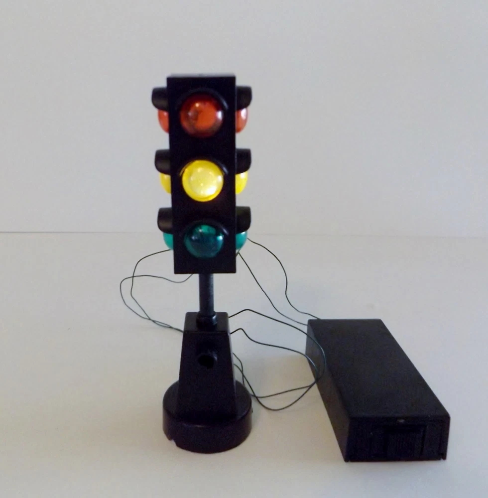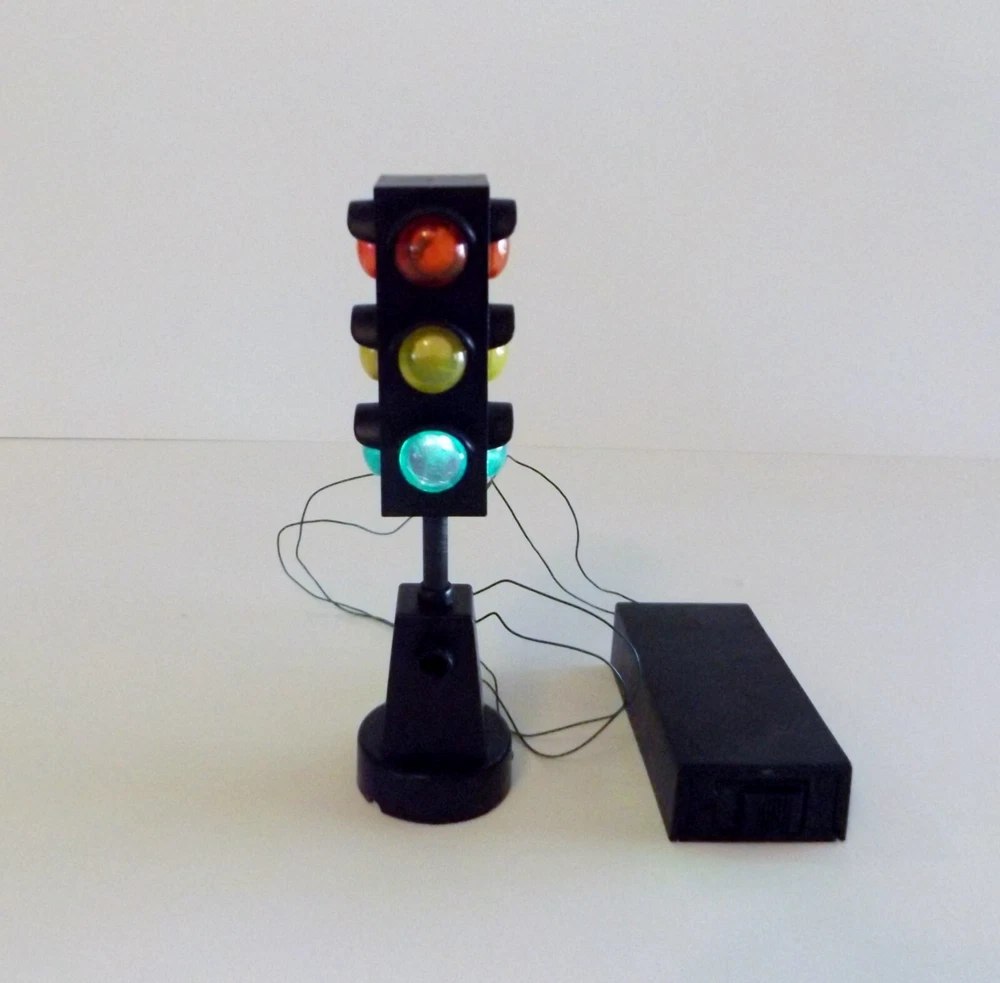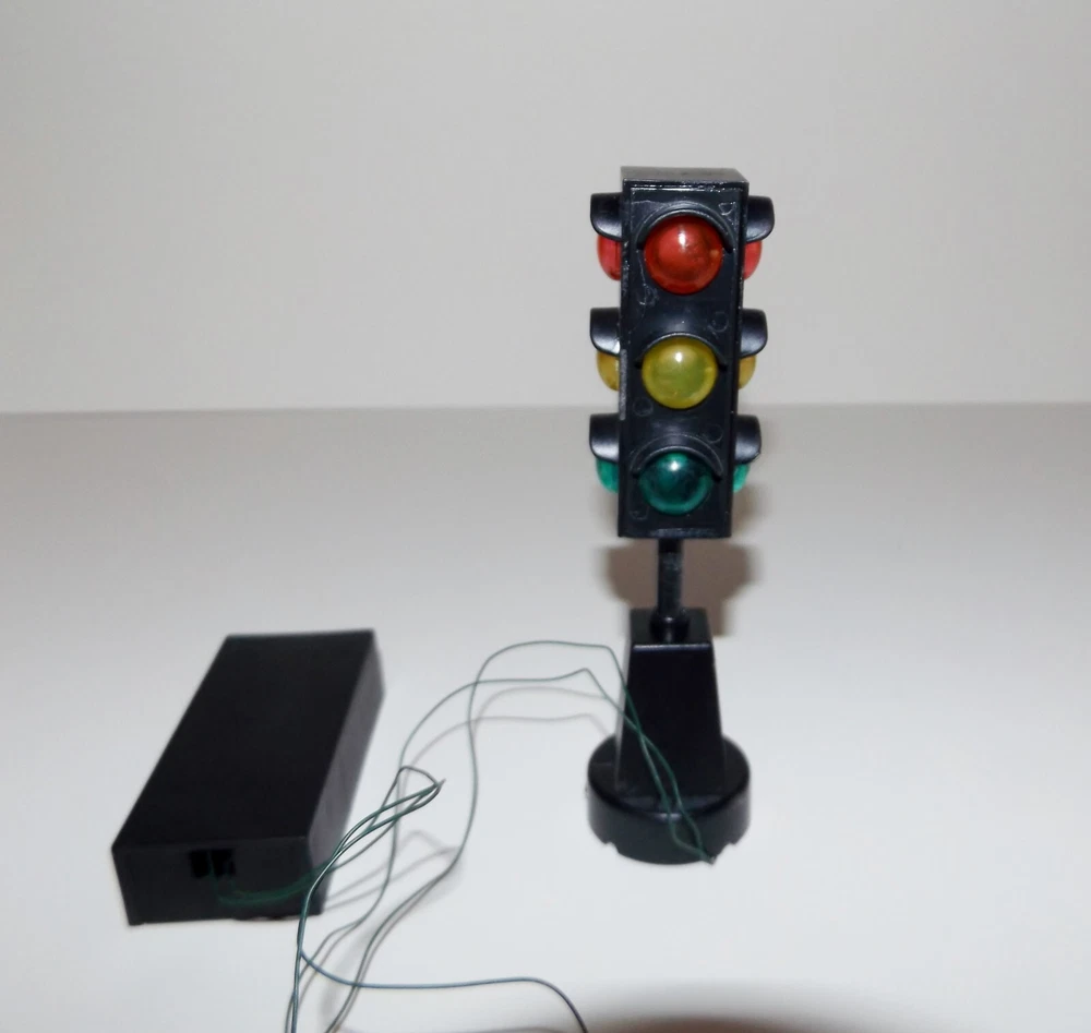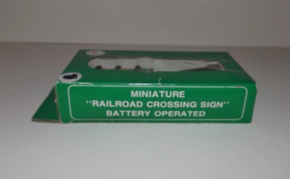 Vintage Miniature Railroad Crossing Light Christmas Village K. Adler Working Vintage pre-owned plastic battery operated miniature Railroad Crossing Sign Light, Santa's World, Kurt S. Adler Inc., Taiwan. For Christmas village, model railroads, and more. Measures approximately 5" high x 1 1/4" round base. Testing - working - flashes between red, yellow and green. Takes 2 AA batteries (not included). Selling as is. Use pictures as part of description.