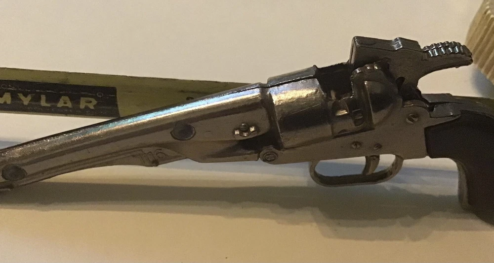4” miniature cap gun pistol. Strong hammer pull and trigger. Old Timer, Numbered 1116.