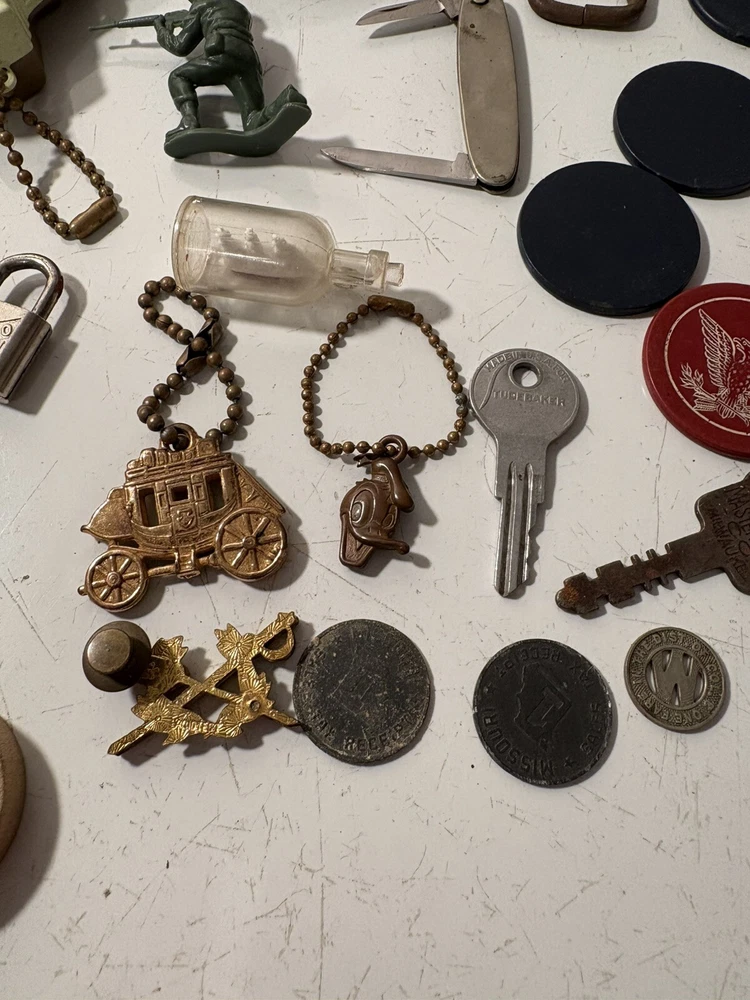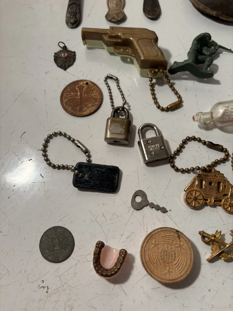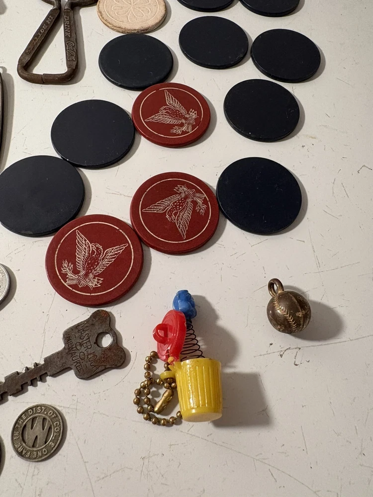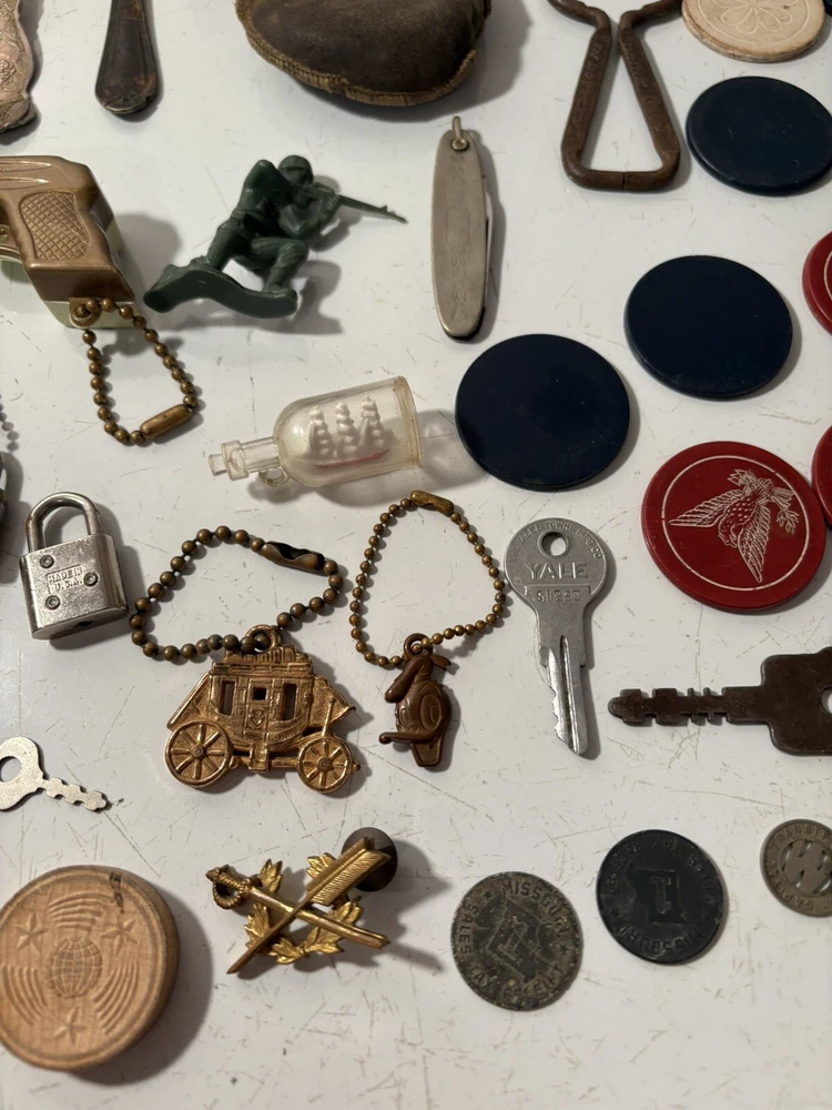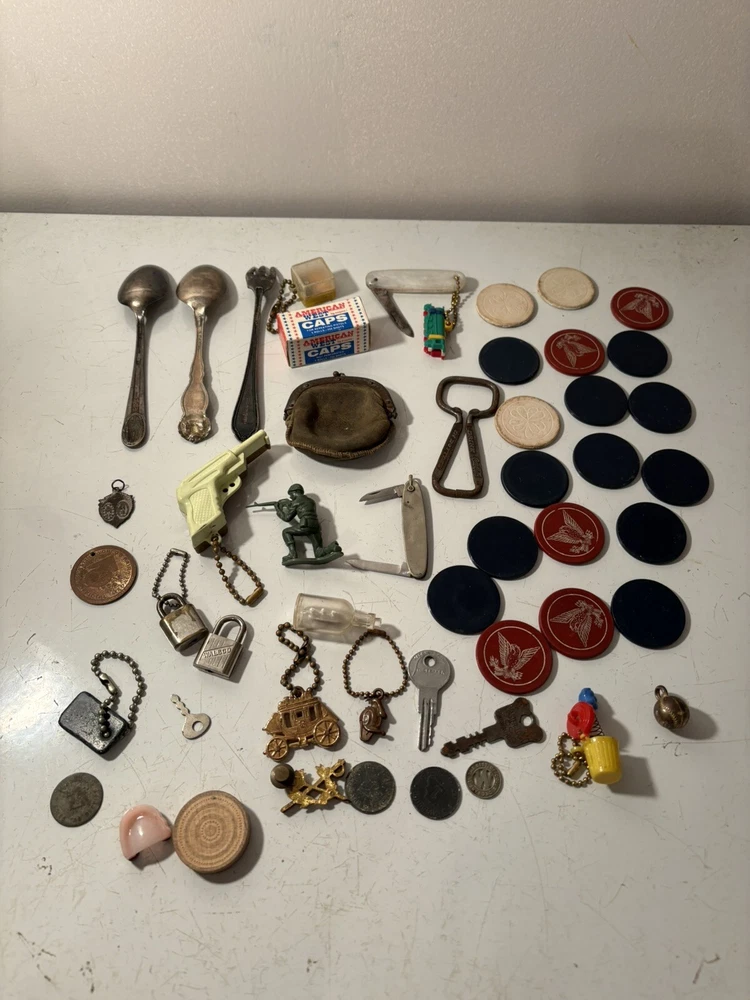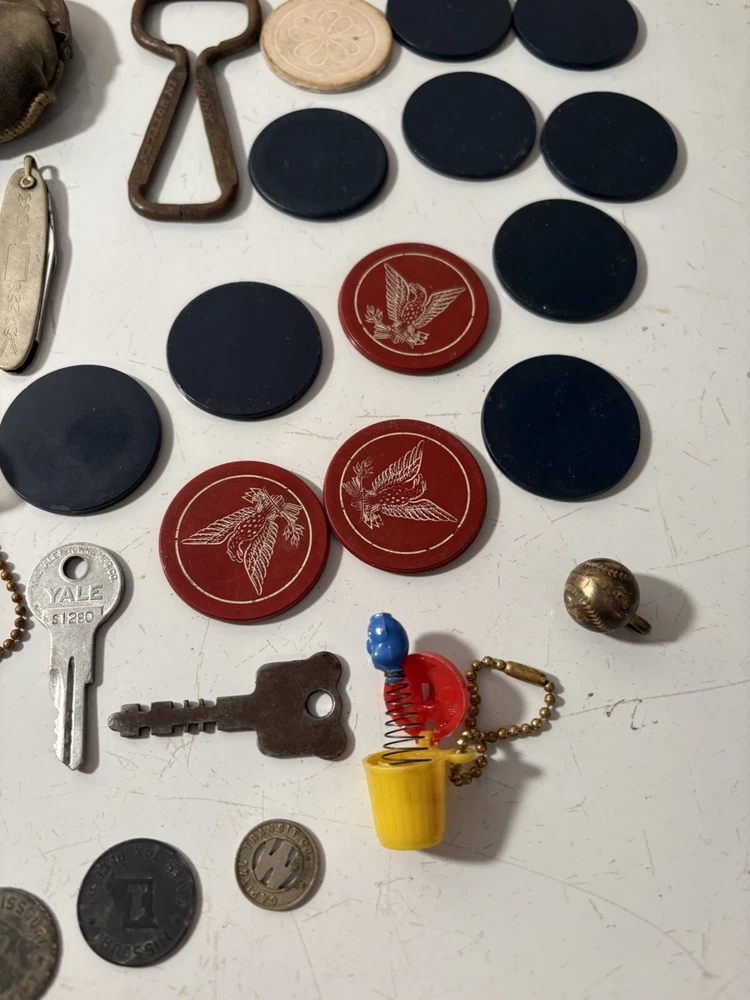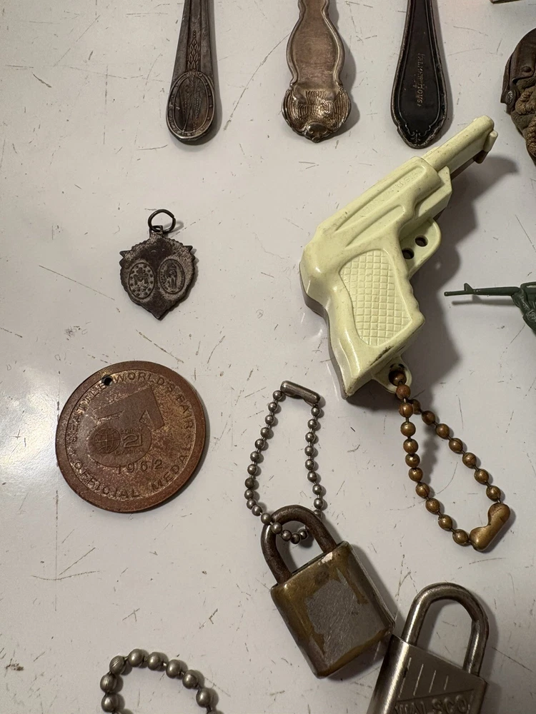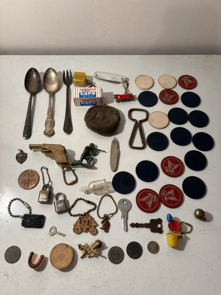 A mixed assortment of vintage odds and ends. Includes three antique silverplate utensils, older keychains, including an old Donald Duck keychain and a puzzle “train” attached to a small knife, random poker chips, some Missouri sales tax tokens, an antique religious medal with American colors on it (military?), a Coca Cola advertising bottle opener, and more. Please note that the items have varying amounts of wear and tear, including damage (the sword lapel pin near the bottom is missing a post, the jack in the box keychain on a spring can’t be loaded back inside the box, etc) and general wear from age. Please see photos, sold as is. 1/6/25 10/13/23 Mixed