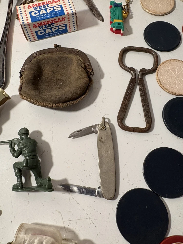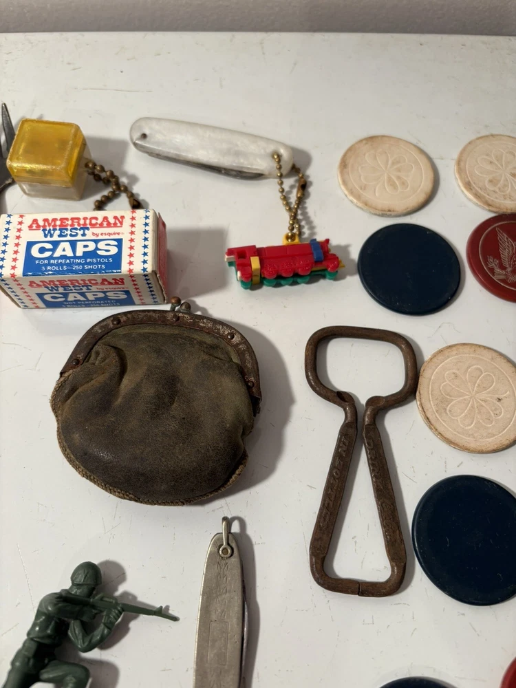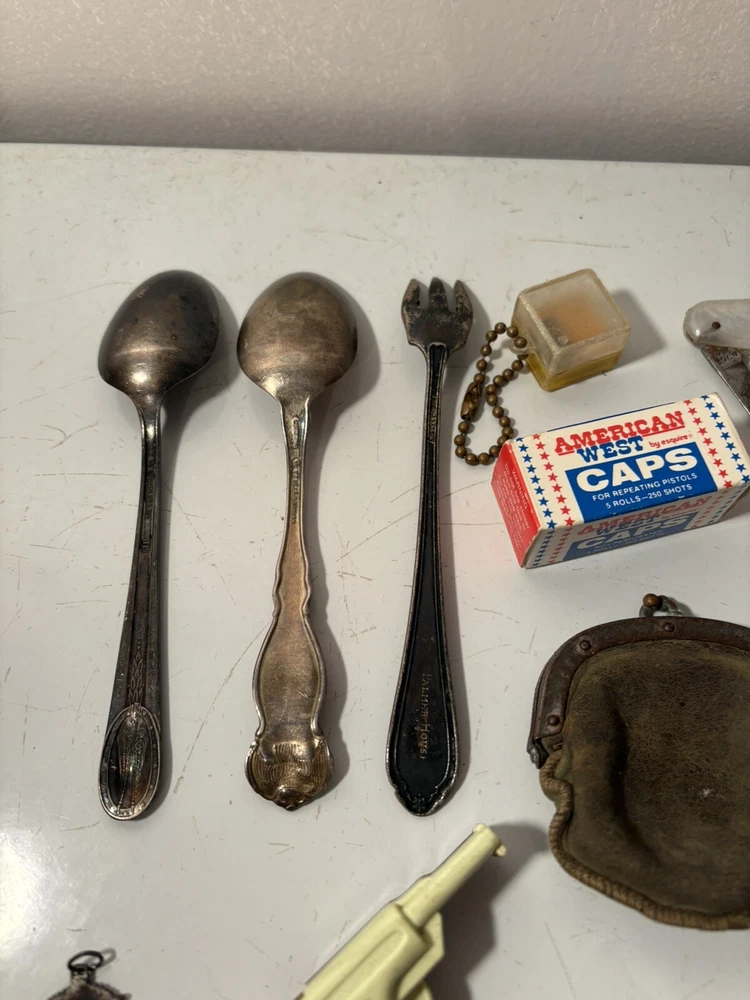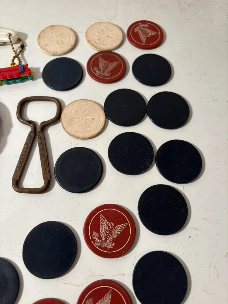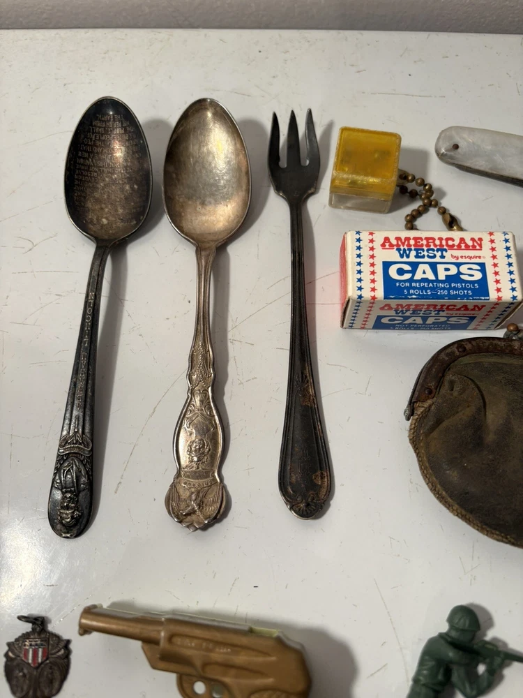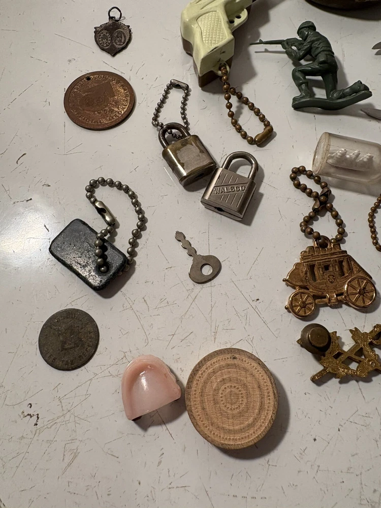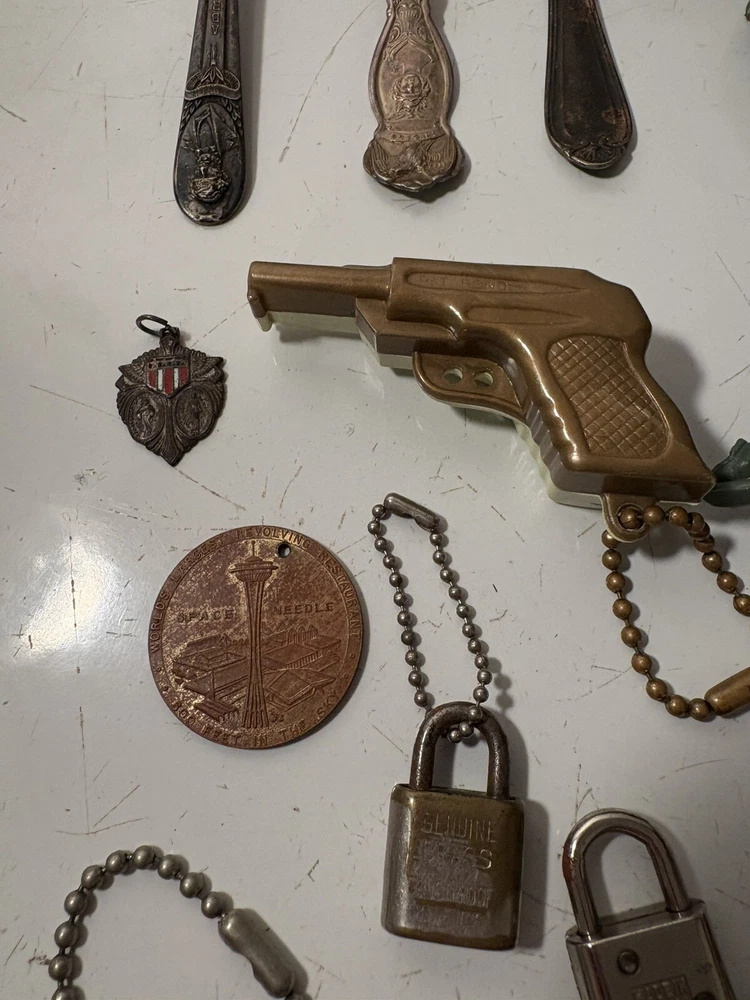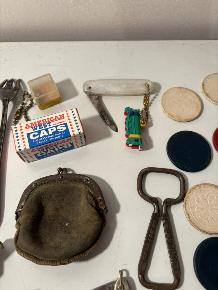 A mixed assortment of vintage odds and ends. Includes three antique silverplate utensils, older keychains, including an old Donald Duck keychain and a puzzle “train” attached to a small knife, random poker chips, some Missouri sales tax tokens, an antique religious medal with American colors on it (military?), a Coca Cola advertising bottle opener, and more. Please note that the items have varying amounts of wear and tear, including damage (the sword lapel pin near the bottom is missing a post, the jack in the box keychain on a spring can’t be loaded back inside the box, etc) and general wear from age. Please see photos, sold as is. 1/6/25 10/13/23 Mixed