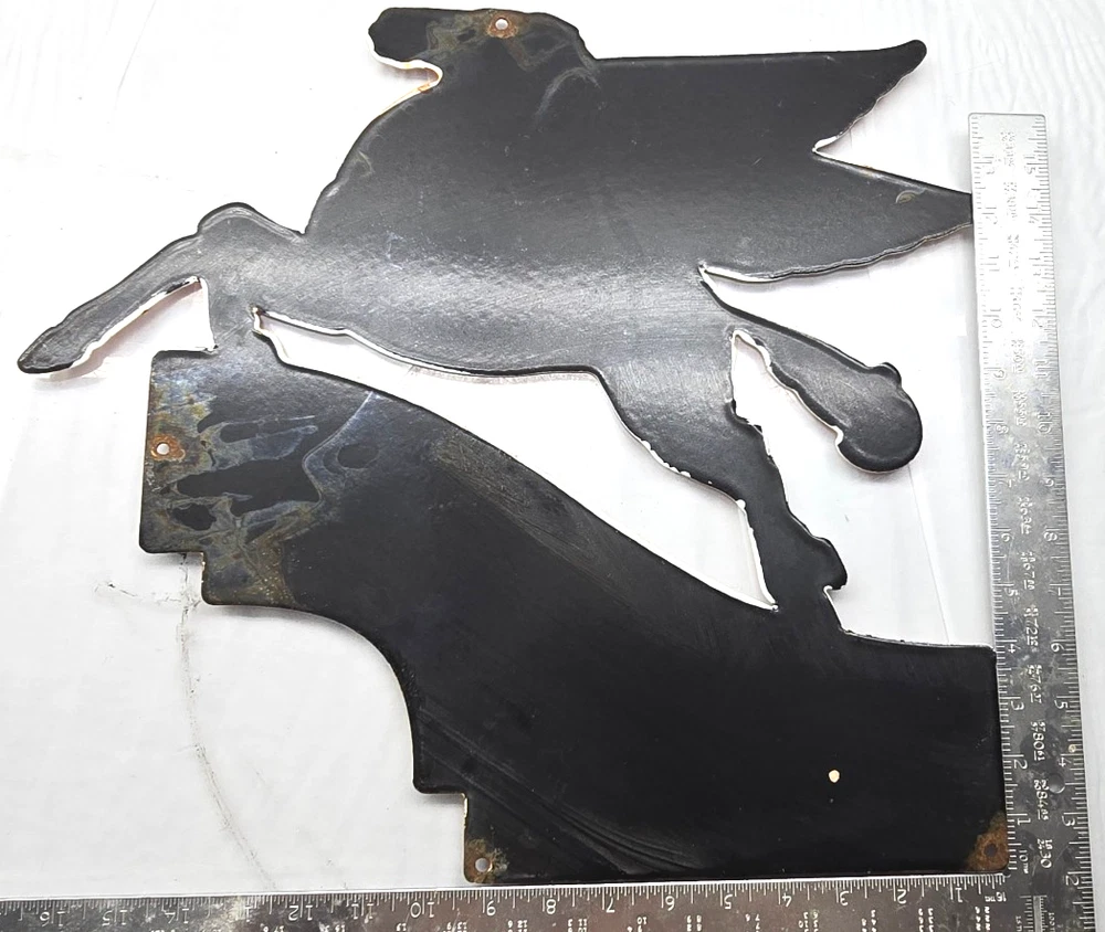 M11 The sign is 17 2/16” x 17 2/16" in diameter. Please see the pictures as they show exactly what you will receive and any imperfections. Sold as is. Please feel free to ask questions. Great for garage, man cave, game room, bar and many other uses. Will combine shipping if more than 1 item is purchased within a few days. This vintage porcelain sign is a great addition to any collection. The sign features the brand name "Mobil OIL" and has a colorful design. It is an original piece and perfect for those interested in gas and oil memorabilia. The sign is made in the United States and is a type of advertising for gas service stations.