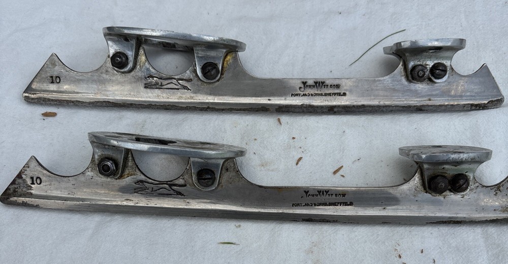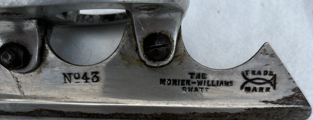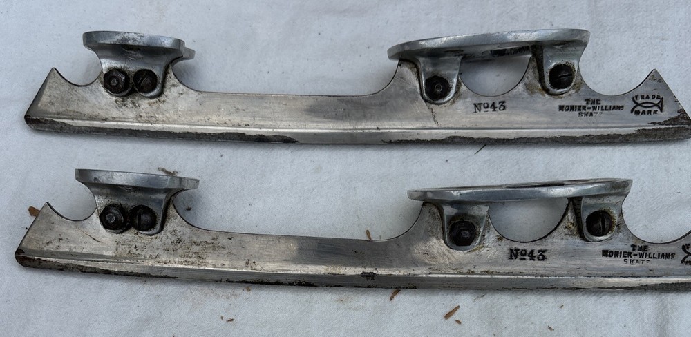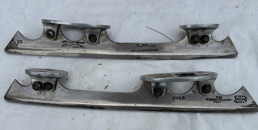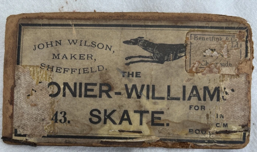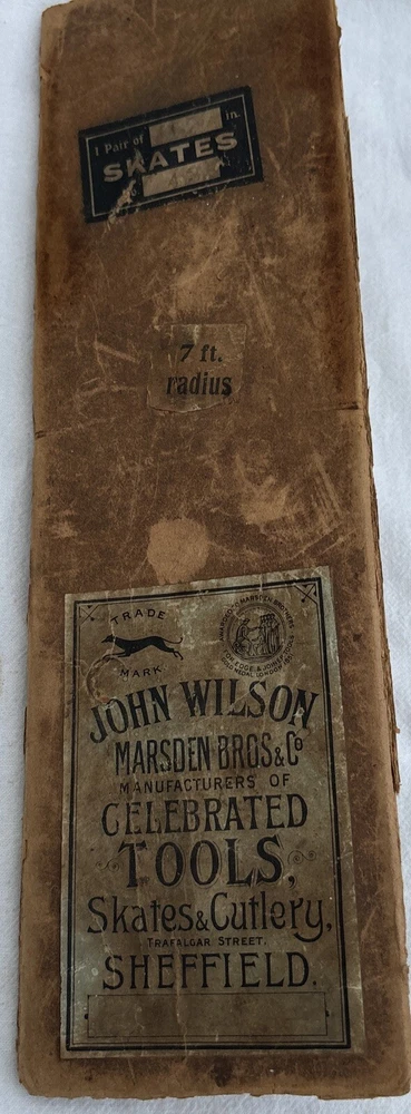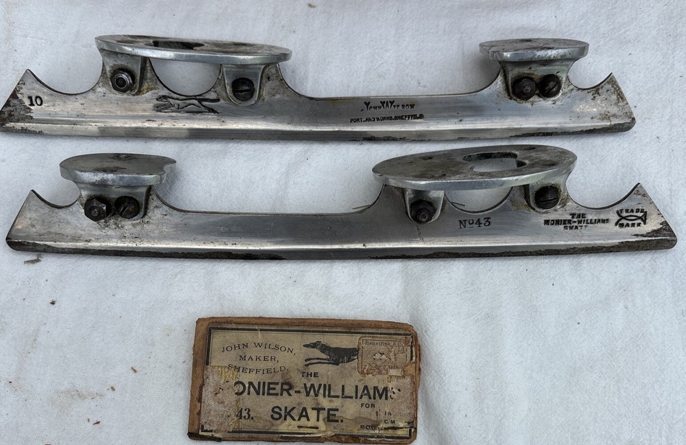 VINTAGE PAIR OF MONIER-WILLIAMS NO43 10” SKATE BLADES BY JOHN WILLIAMS SHEFFIELD ENGLAND USED IN ORIGINAL BOX SOME TARNISHING BOX DAMAGED PLEASE STUDY PICTURES IDEAL PROP
