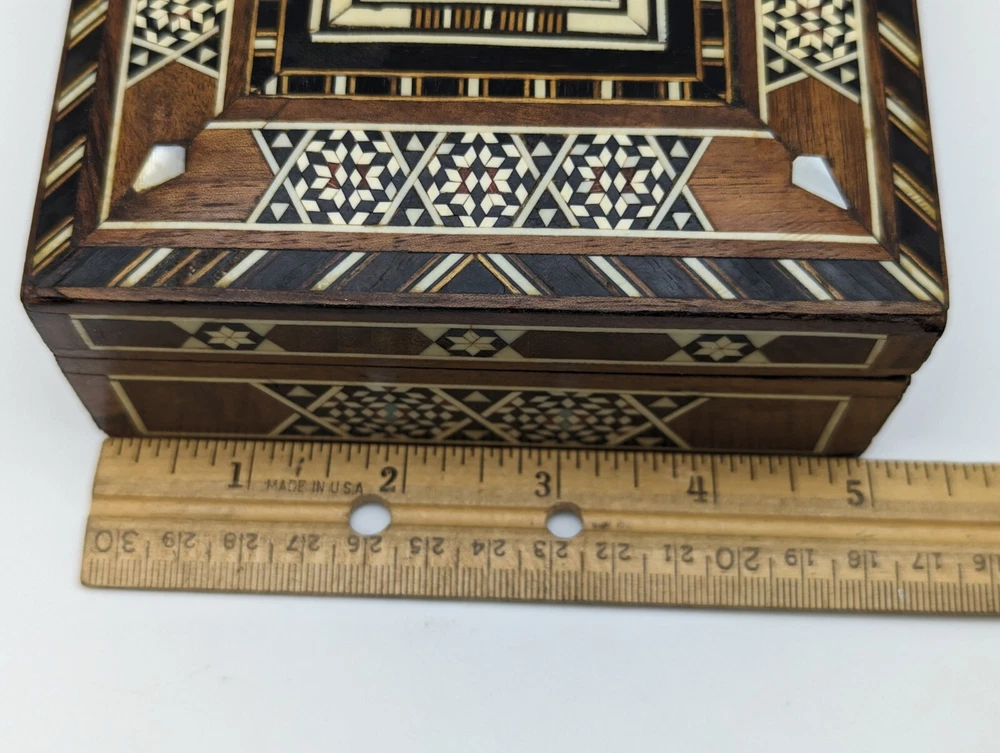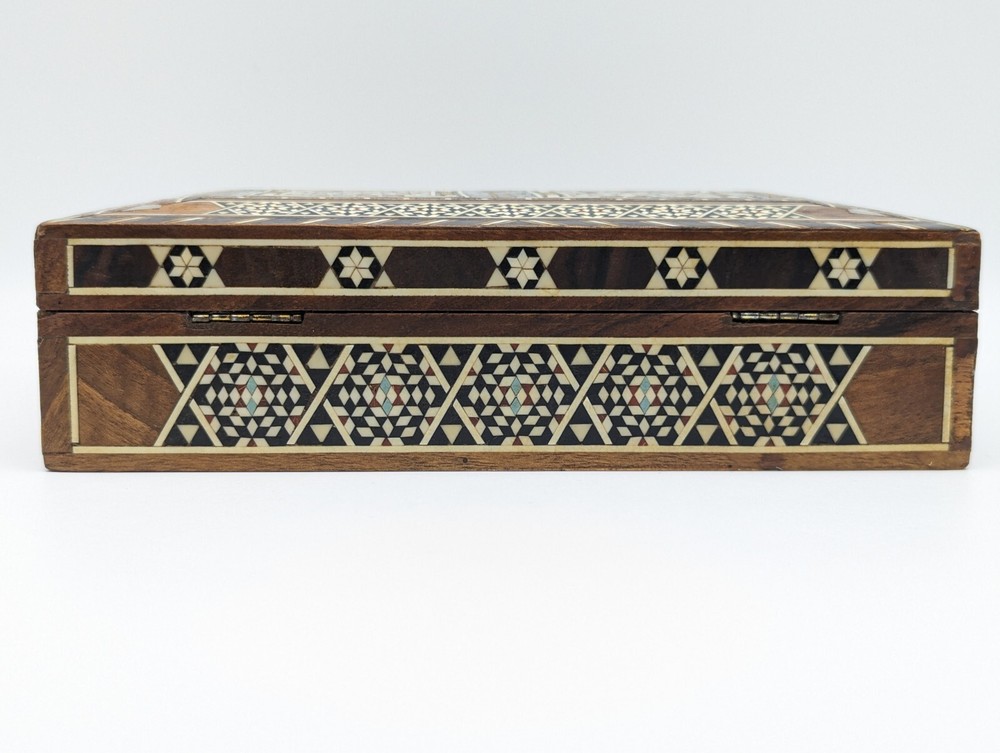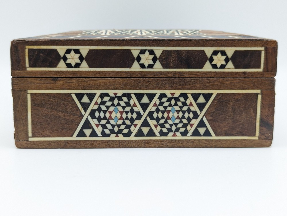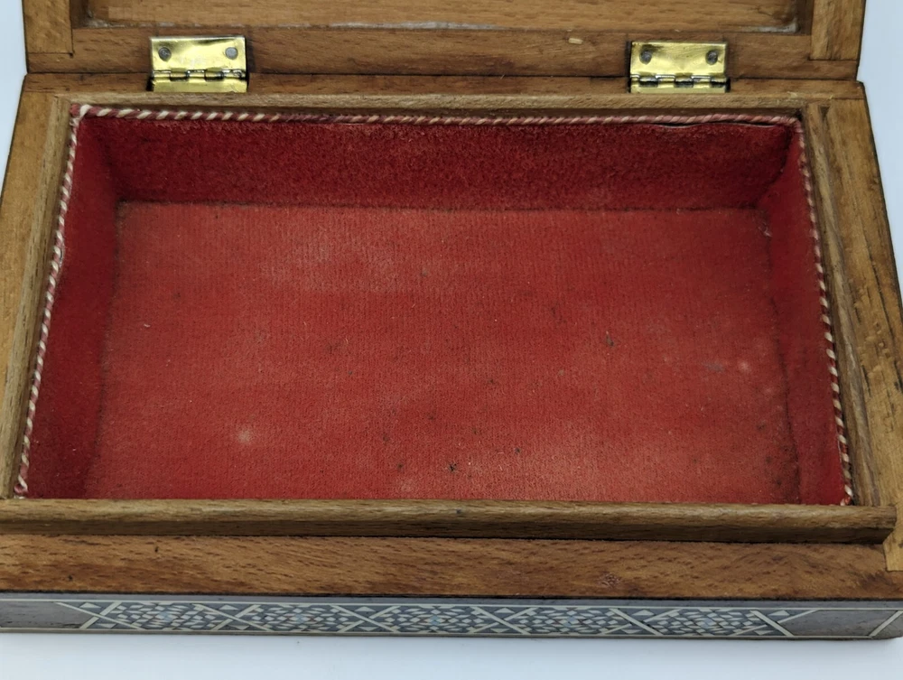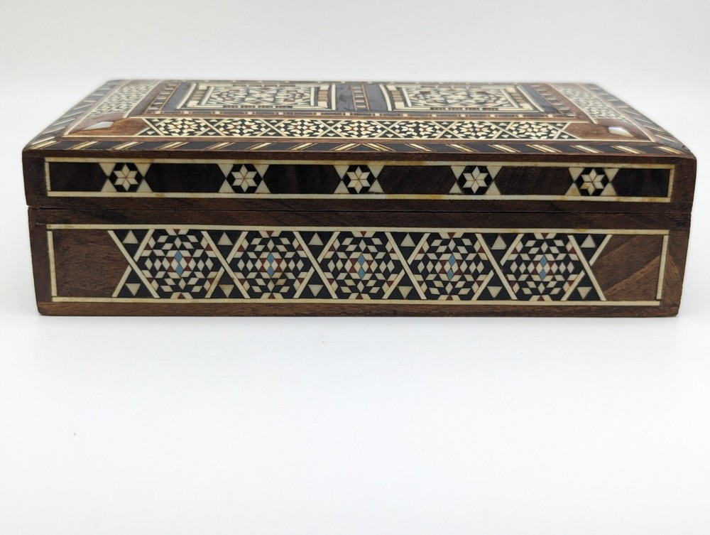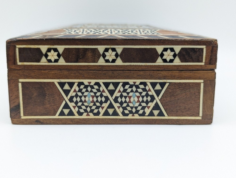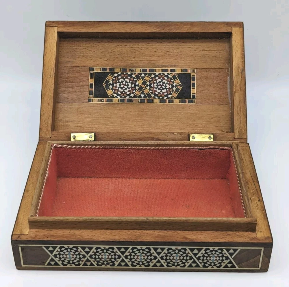 This vintage box is a beautiful work of art, crafted from wood and mother of pearl with intricate marquetry inlay. The box is a unique piece with multi-color designs that showcase a Moroccan style. It has a velvet lining that makes it perfect for storing small items. The box is an original and its primary material is wood. It is a perfect collectible for those who love decorative pieces.