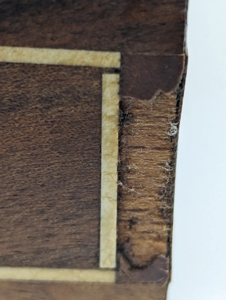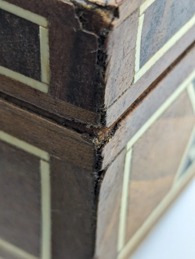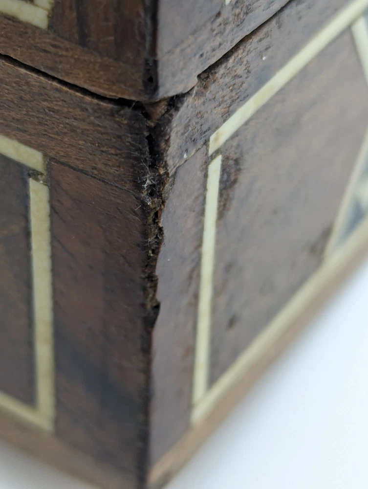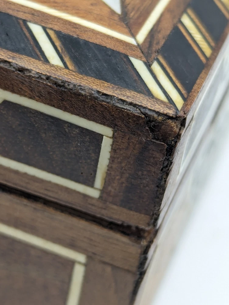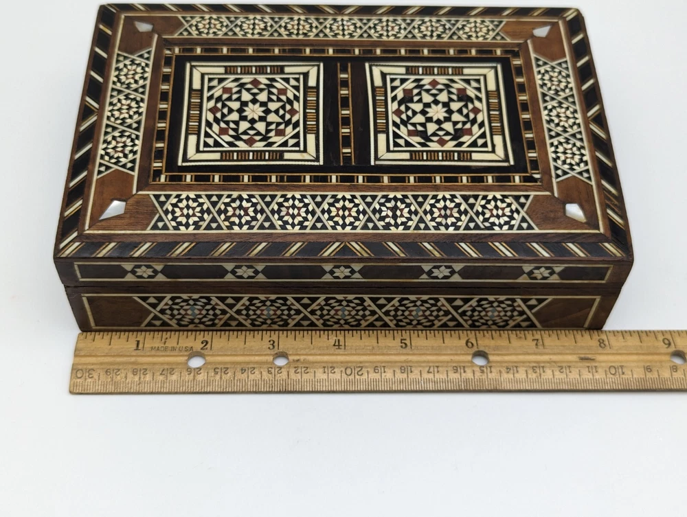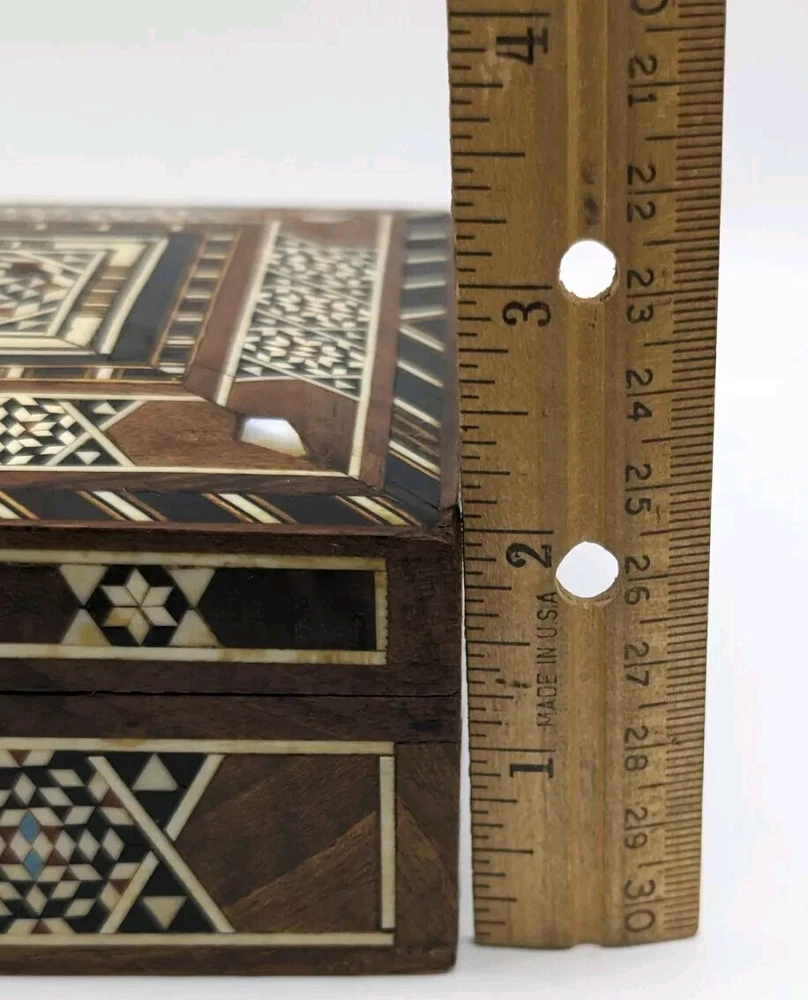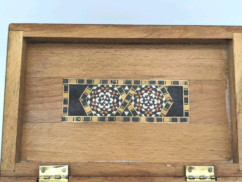 This vintage box is a beautiful work of art, crafted from wood and mother of pearl with intricate marquetry inlay. The box is a unique piece with multi-color designs that showcase a Moroccan style. It has a velvet lining that makes it perfect for storing small items. The box is an original and its primary material is wood. It is a perfect collectible for those who love decorative pieces.
