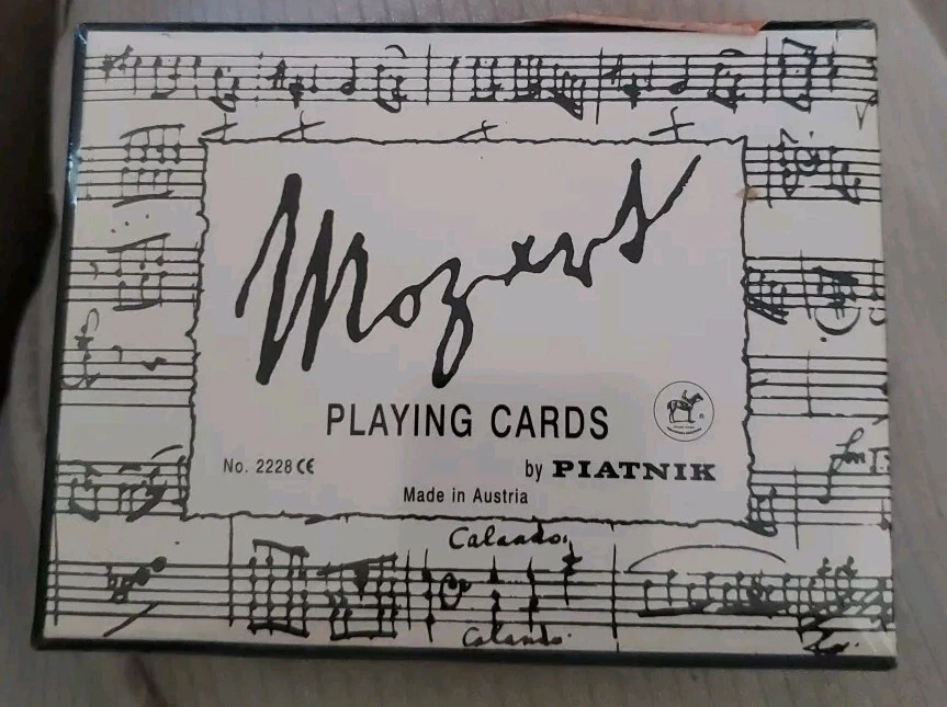 New extremely RARE HTF Experience the timeless beauty of Mozart's music with these vintage playing cards. The double bridge deck by Piatnik is a must-have for any card game enthusiast. Made in Austria, these modern cards feature the famous composer's works and are perfect for collectors and players alike. Indulge in the intricate design and attention to detail as you shuffle through the deck. The cards are perfect for display or for playing your favorite bridge game. Add this unique piece to your collection today and enjoy the elegance of Mozart's music in the comfort of your own home. Thanks for looking