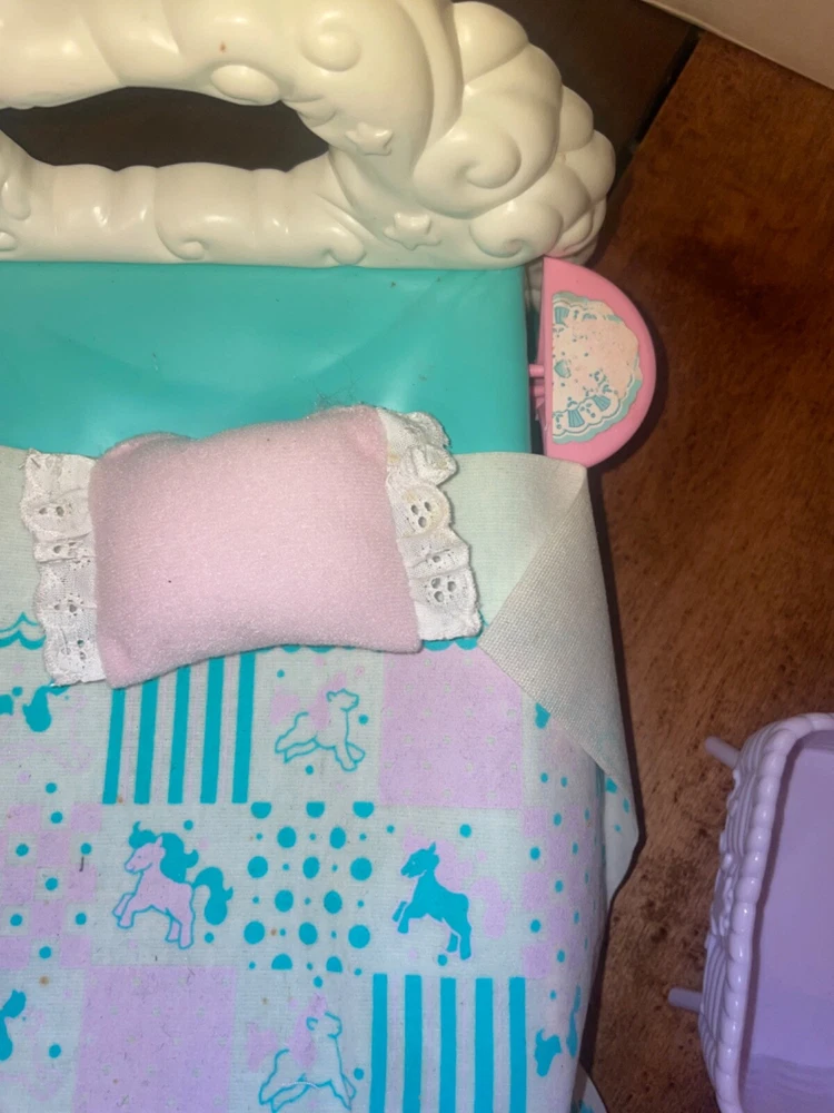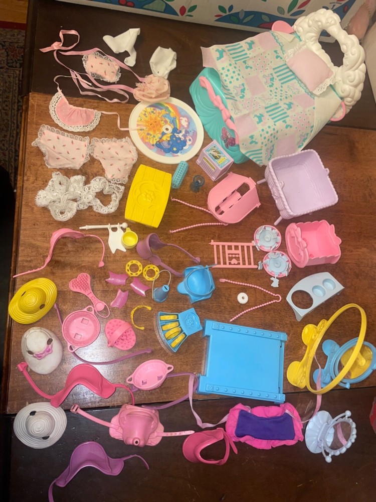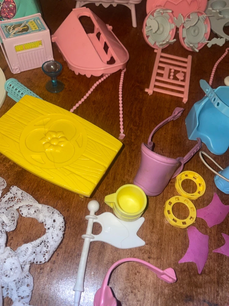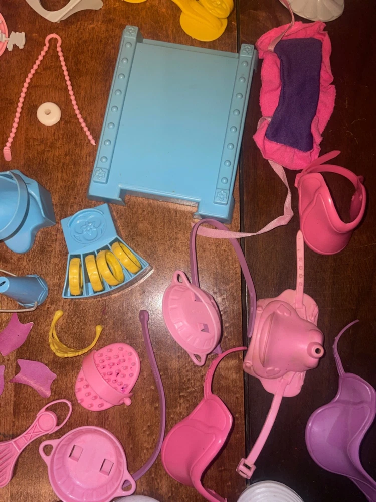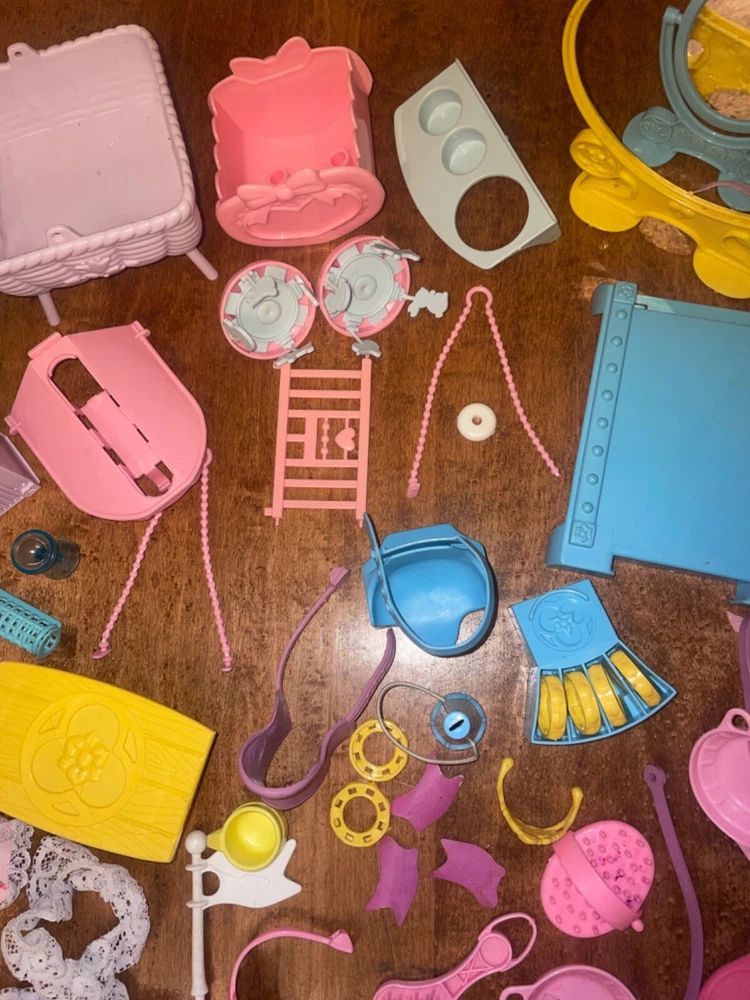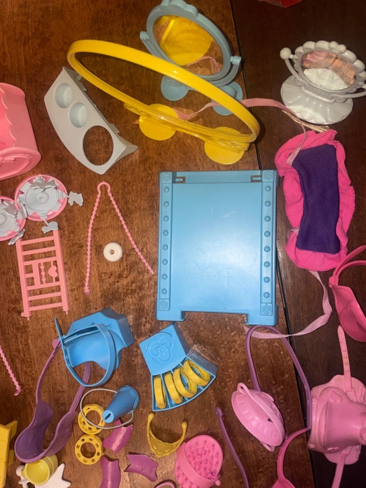 Lots of accessories for several different G1 My little pony play sets. There’s parts for the baby buggy, castle, bed, nursery, and more. Some items are in better shape than others as conditions vary. The spinning thing that goes to the bed is missing whatever attaches it to the bed. Some of the rubber hats and saddles have some condition issues, need to be cleaned, or have spots or marks. May need to clean up some of this stuff or all of it. There’s a sticker on the bed. May show other signs of use or wear but overall decent for its age. Sold as is no returns. Handling within two business days. Thank you!