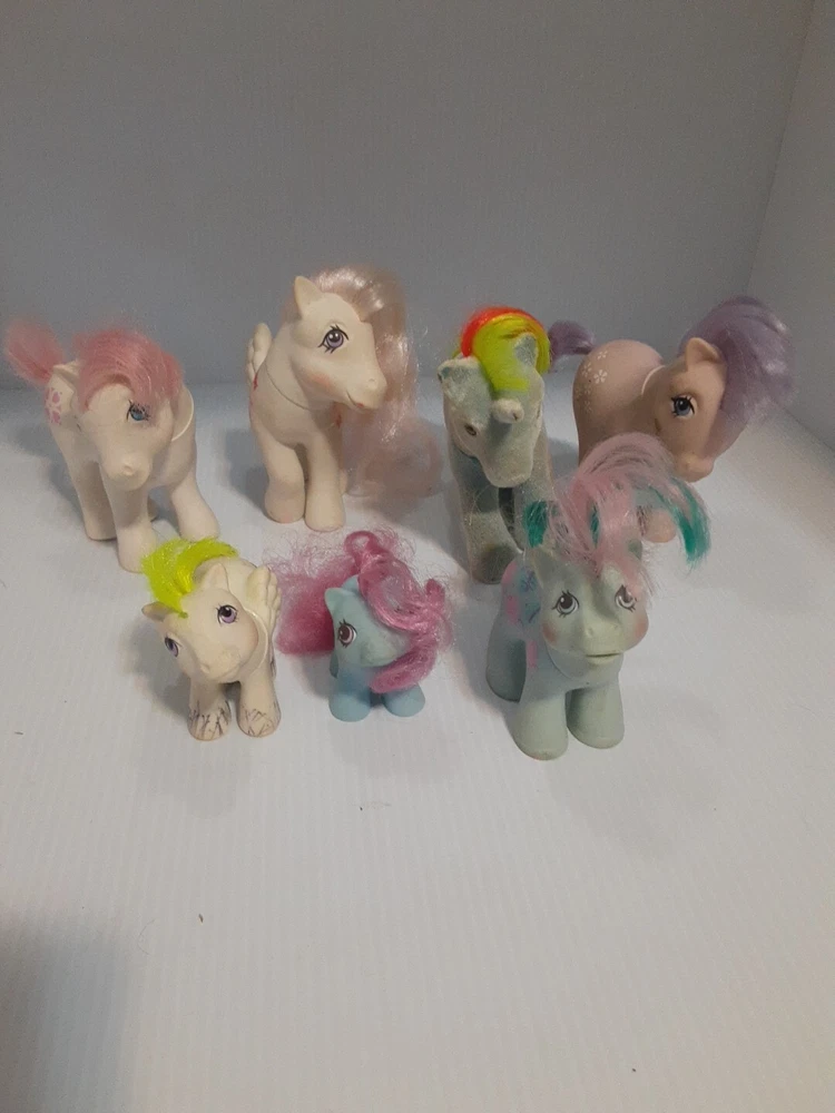 This lot of Little Ponies has led an exciting life and they wear their playtime scars well. A few have visited the Pony salon and from the looks of it, they did that sometime in the 90's! These are toys you can love or your kids or grandkids, and they will serve you faithfully. All of them made before 1987 are made in Hong Kong, and the youngest blue one hails from China. They have lived together for decades and are ready to live with you!