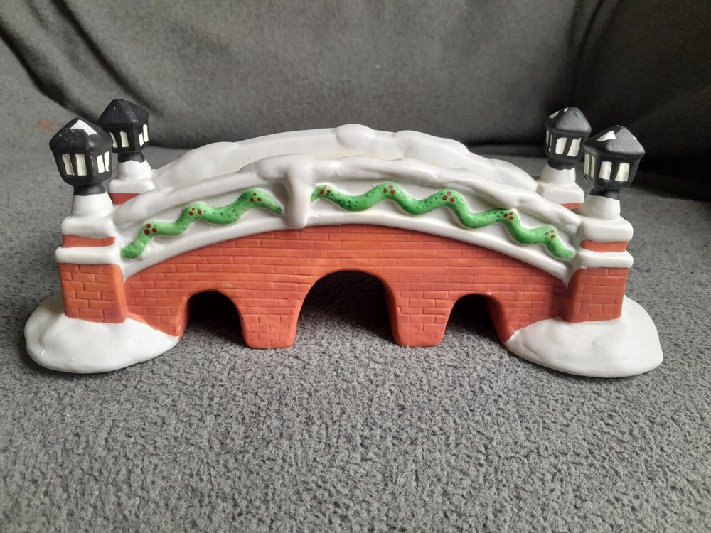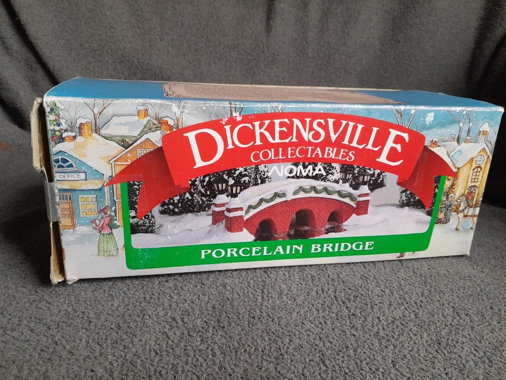 This vintage NOMA porcelain bridge is a beautiful addition to any Christmas village collection. Made in China in 1995, it features intricate handmade details and a charming design that will transport you back in time. The bridge is made of high-quality porcelain and is a retired piece from the Dickensville collectibles series. The bridge is perfect for collectors looking for a unique addition to their village, and is sure to impress with its stunning craftsmanship. It has been well-maintained and is in excellent shape, making it a great investment for those looking to add to their collection. Bring some holiday cheer to your home with this nostalgic and beautiful porcelain bridge.
