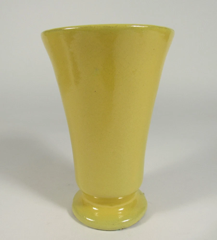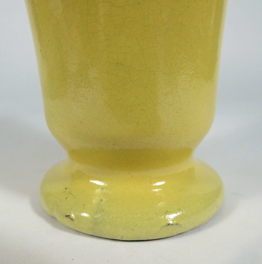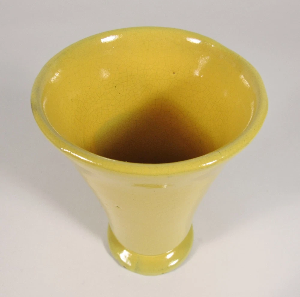 Description: This vintage pottery vase is approx.. 5 ¾” high x 3 ¾” widest point. It is glazed in a bright yellow over red clay. The piece is unmarked. There is a very tight line at the top rim into the interior approx.. 2” long and a couple of firing pops. Please view and zoom all photos.