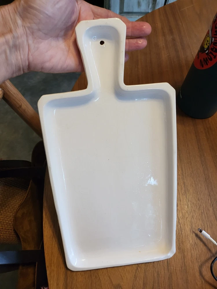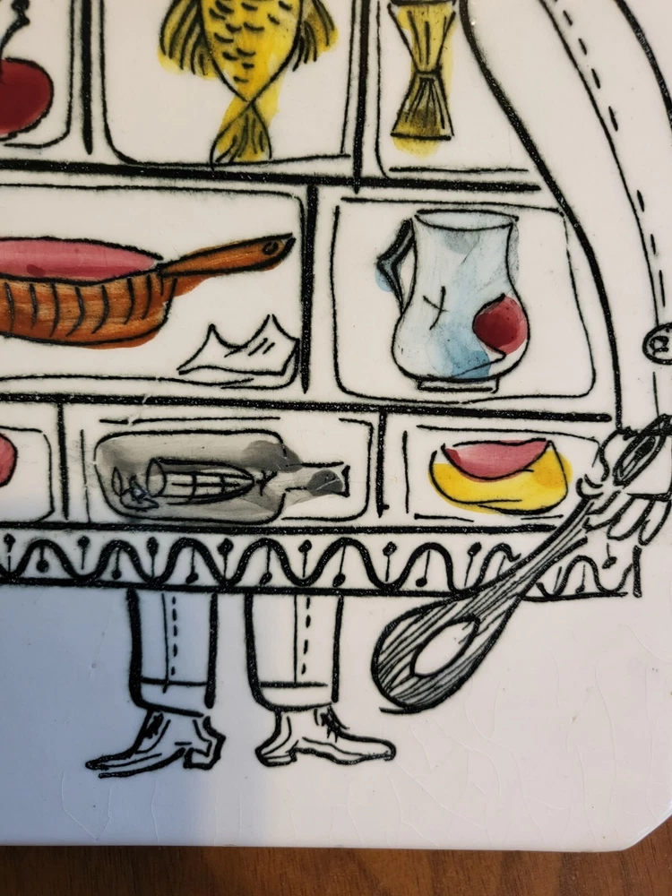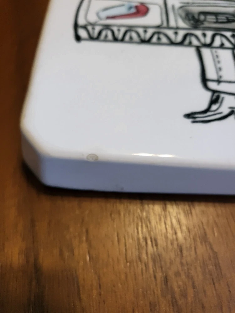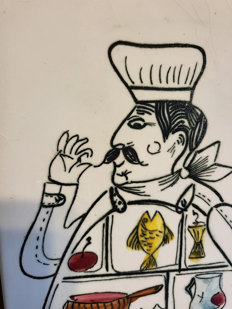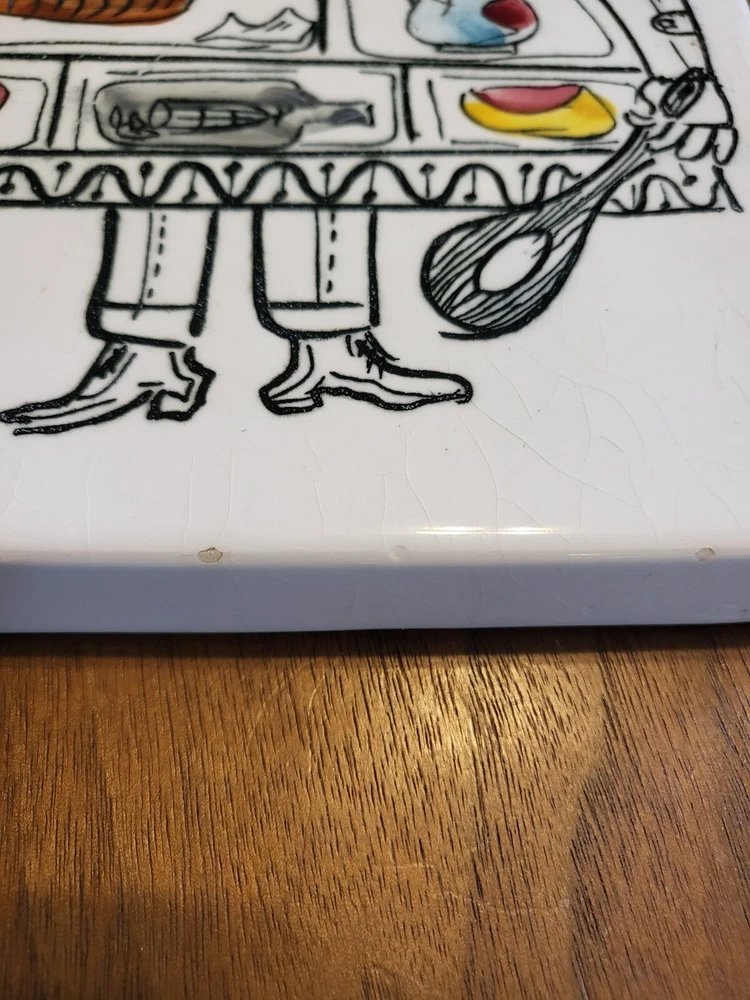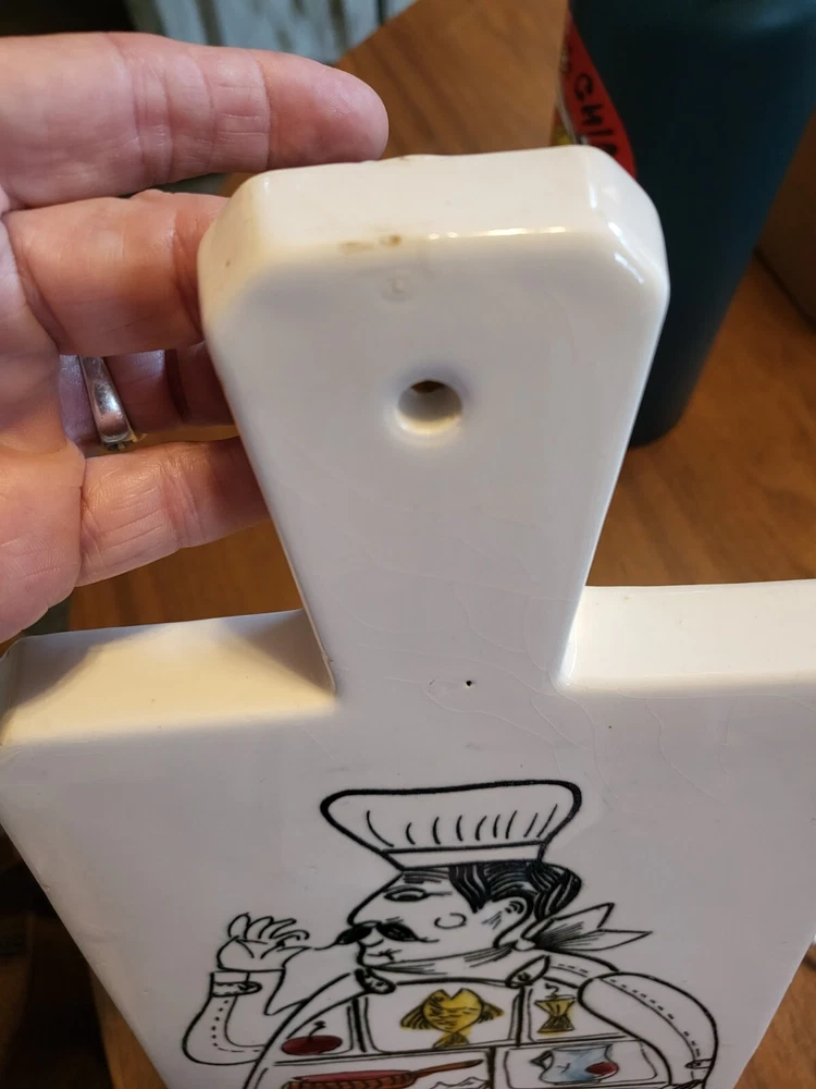Vintage Nasco? Ceramic CHEF Cheese Cutting Board Japan? Kitschy 13.5" X 7" X 1" Minor nicks only Add some retro flair to your kitchen with this vintage ceramic cutting board featuring a cheerful chef and designed for slicing your favorite cheeses. Made in Japan, this rectangular board measures 13.5 inches in length and 7 inches in width, with a thickness of 1 inch. The multicolor design and kitschy theme are sure to make a statement in any kitchen. Crafted from durable ceramic, this cutting board is perfect for cheese lovers and cooking enthusiasts alike. The board is also versatile enough to be used for other food items that need slicing. Whether you're a collector of vintage kitchen tools or just looking for a unique addition to your culinary arsenal, this Nasco? ceramic cutting board is sure to fit the bill.