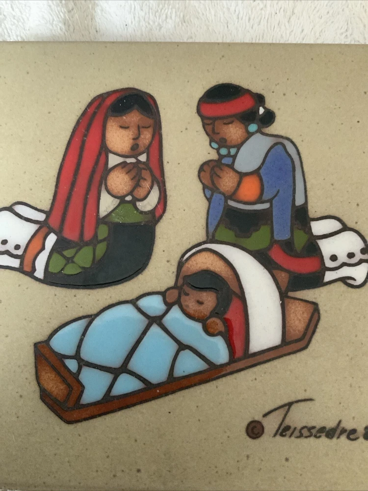 This vintage Native American tile art trivet wall decor is a beautiful addition to any collection. Created by Cleo Teissedre in 1986, this square ceramic tile features a hand-painted Navajo pattern in multicolor. The tile is signed by the artist and is an original piece from the late 20th century. This Southwestern-style tile is suitable for wall decor and has a high gloss finish. It depicts a Native American subject and is perfect for all occasions. Whether you're a collector or just looking for a unique piece of art, this tile is a must-have.