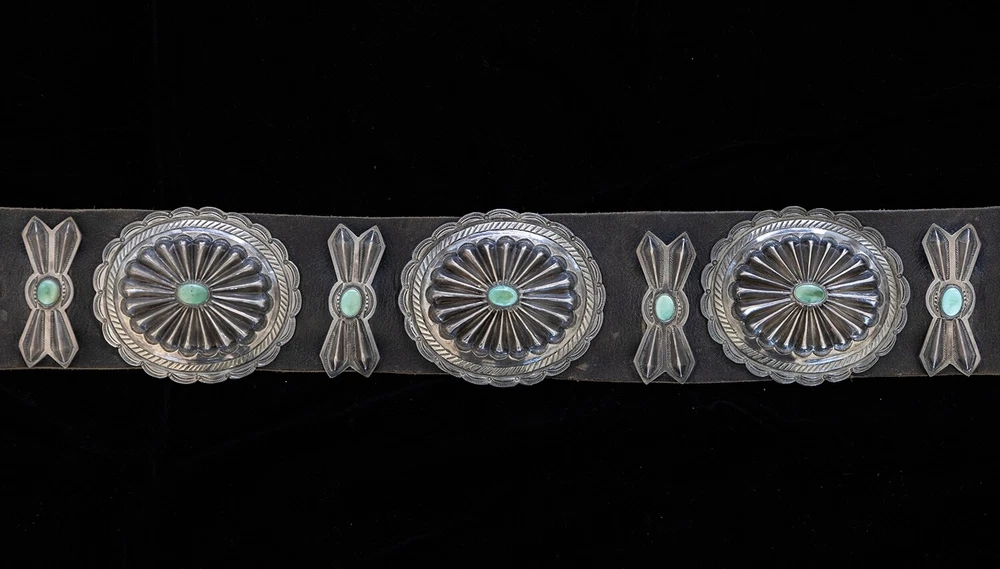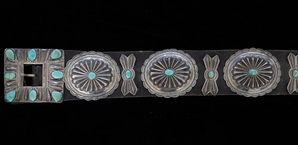 This is a one-of-a-kind vintage Native American belt made from sterling silver and turquoise. Handmade, the intricate design and blue color make it a unique addition to any collection. It is suitable for adult unisex wear. Collectable but also wearable. Purchased in the early 1970's in Santa Fe but not sure exactly how old it was then or now.