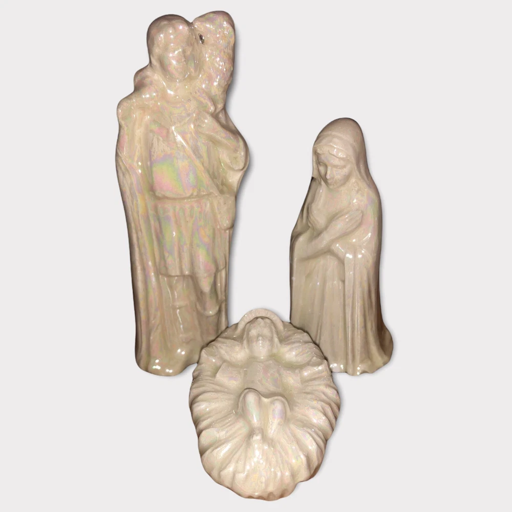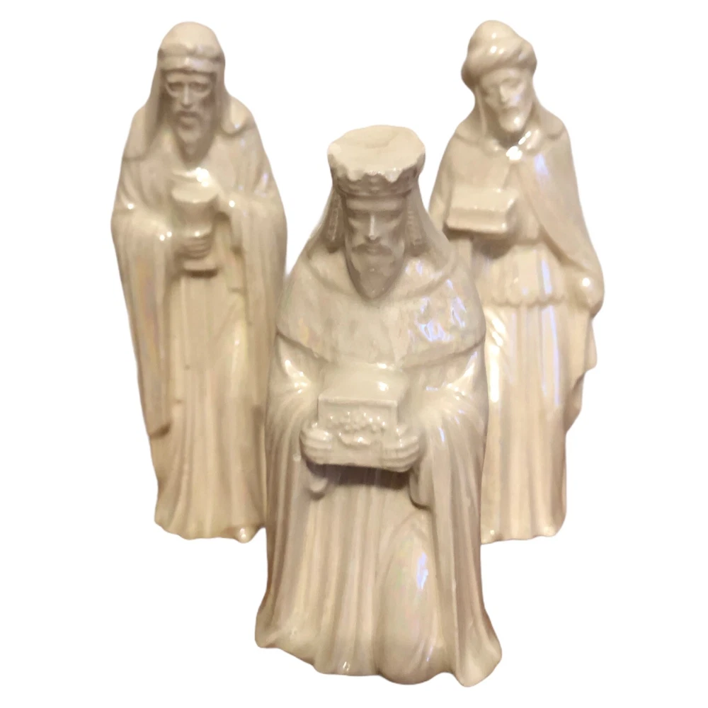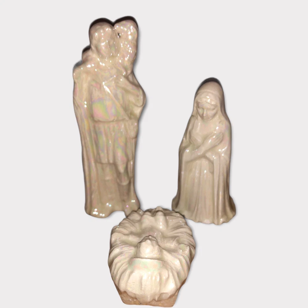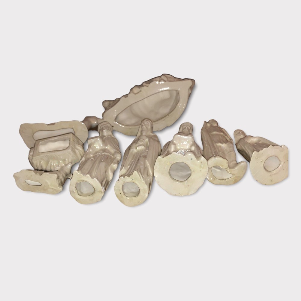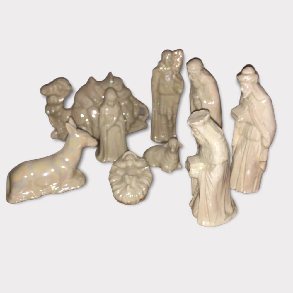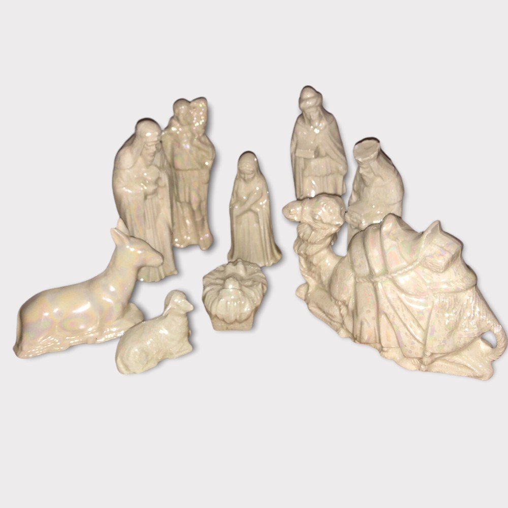 Vintage 9 Piece Ceramic Iridescent Glazed White Mold Nativity Set. Set Includes, Baby Jesus, Mary, Joseph, Three Wisemen, Donkey, Camel, Lamb. Height of Figurines Vary from 2” to 5”. Condition Excellent. No Chips or Cracks. Smoke/Pet Free Environment. 30 day returns. Shipper pays return shipping. Refund issued upon receipt of item/s in condition shipped to buyer.