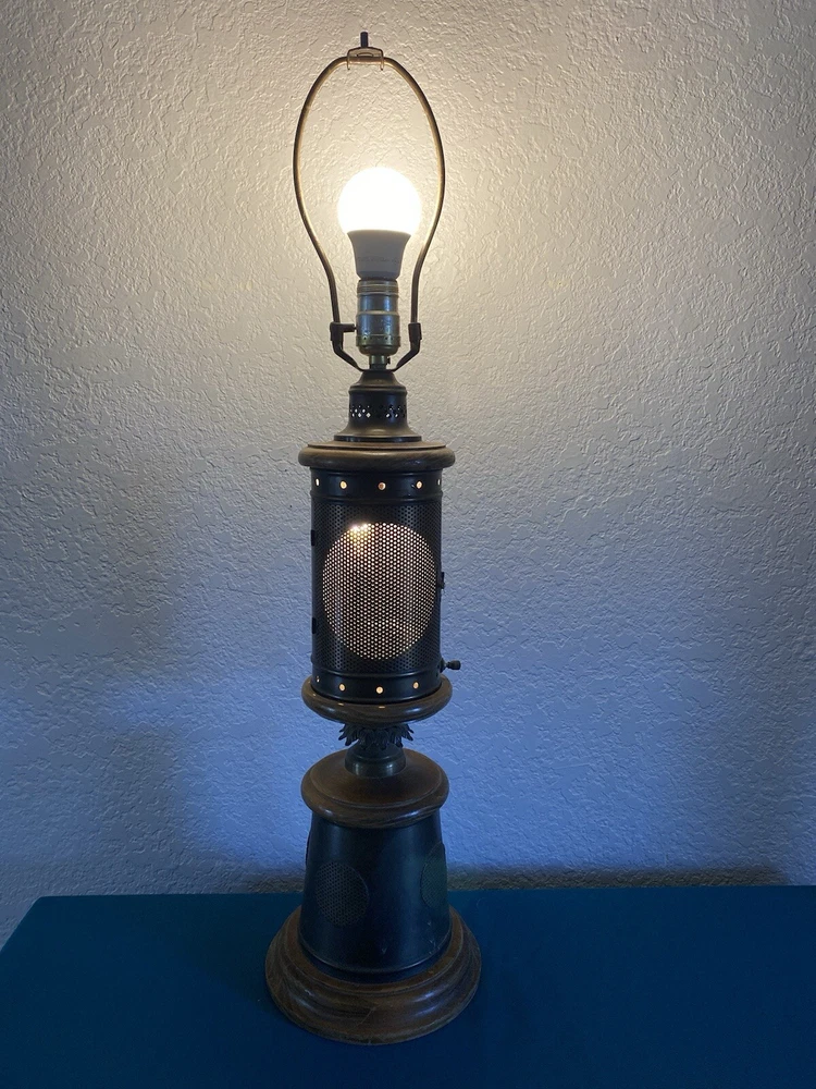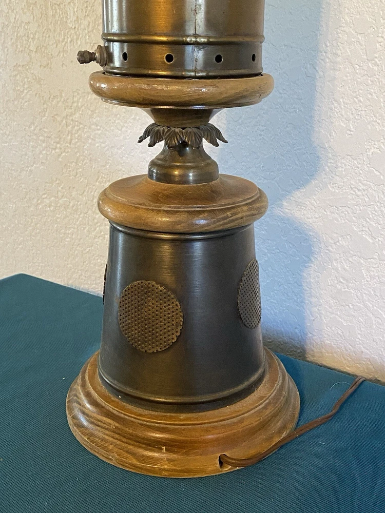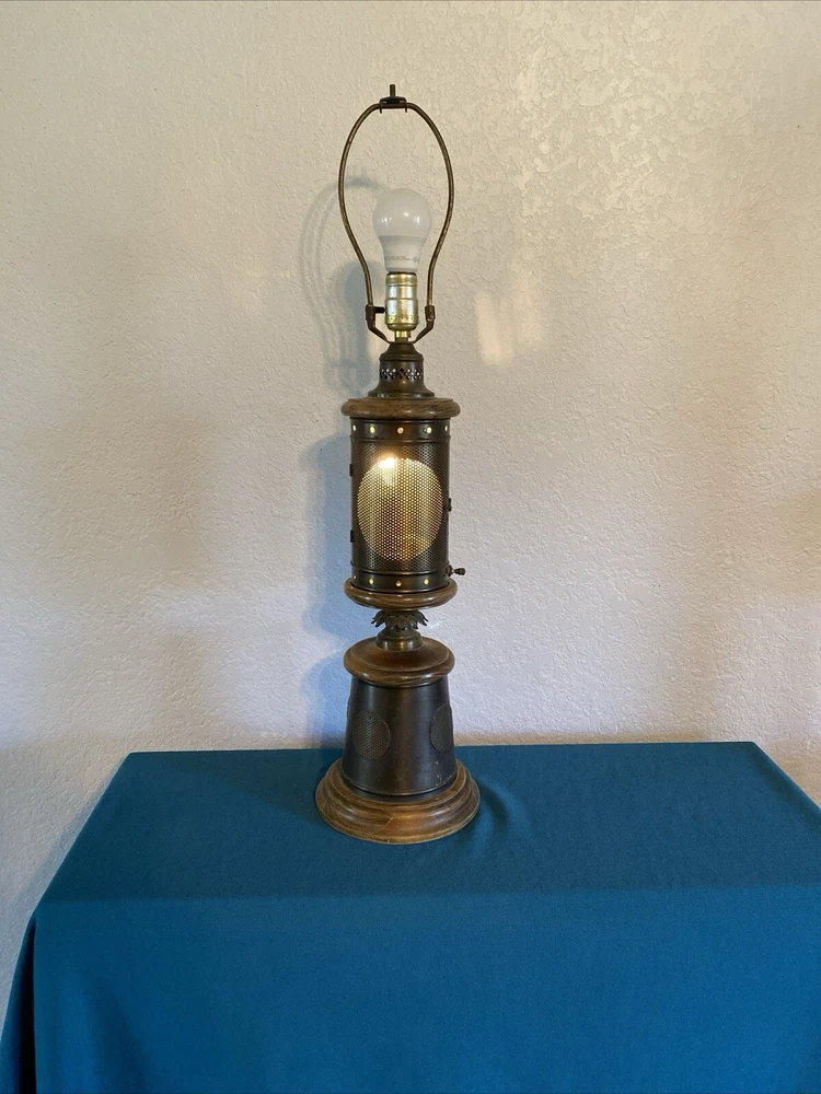 Vintage Nautical Lantern Table Lamp Brass Wood Dual Light - Will not be shipped with outer bulb - lamp shade not included - 29" tall 7" wide - latch for center opening was replaced long ago with a piece of wire to keep it closed - zoom in on photos for detail - this lamp is roughly 60 years old - signs of age can be seen