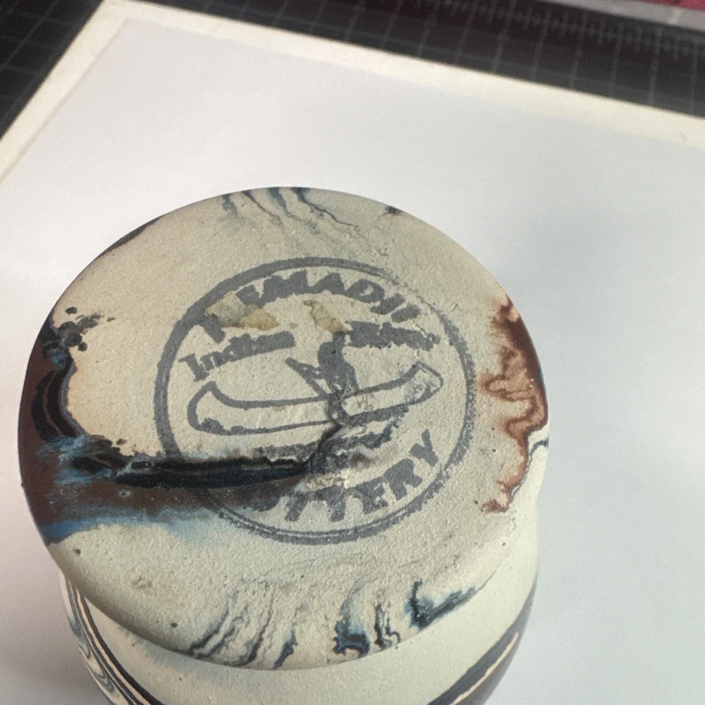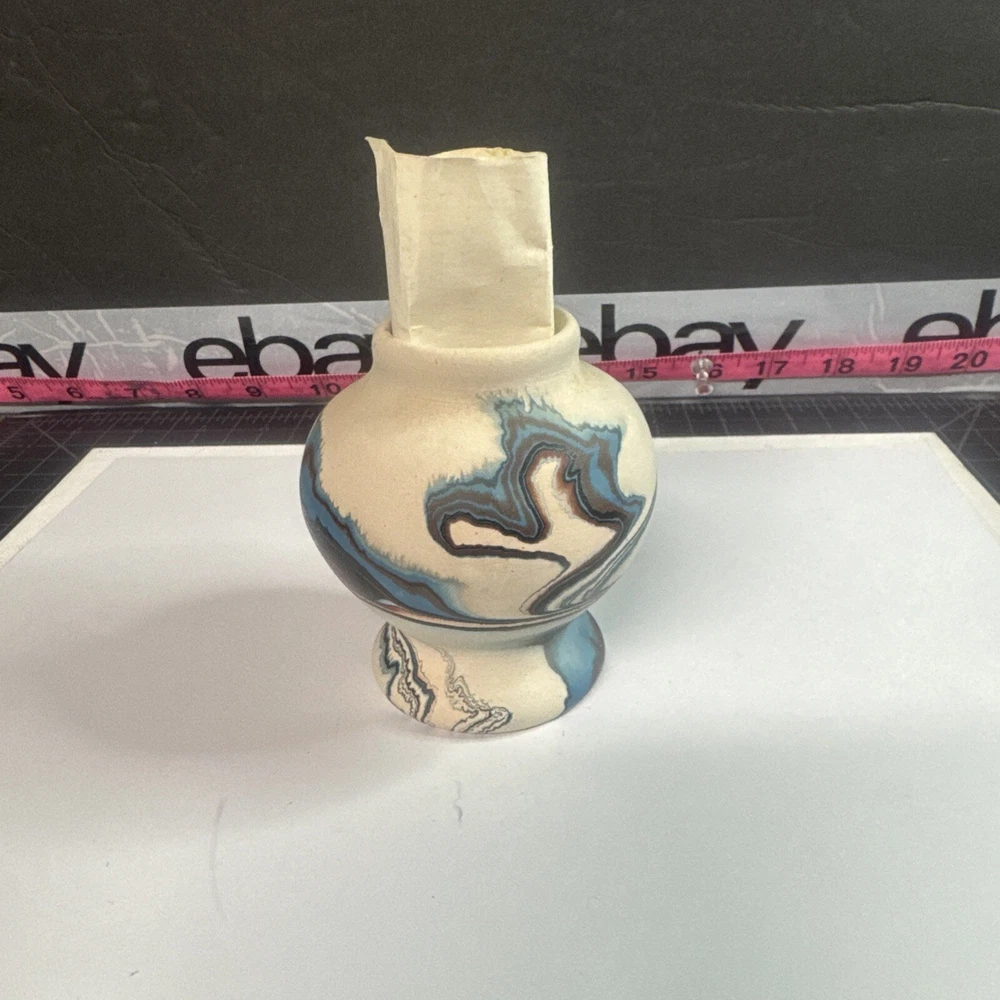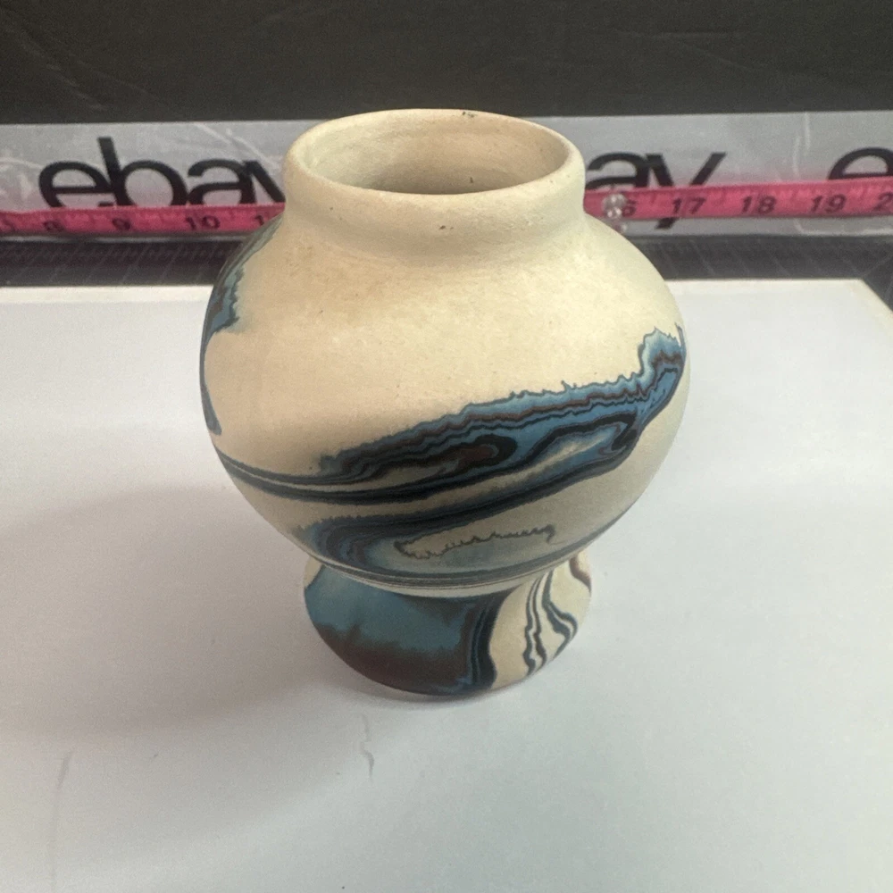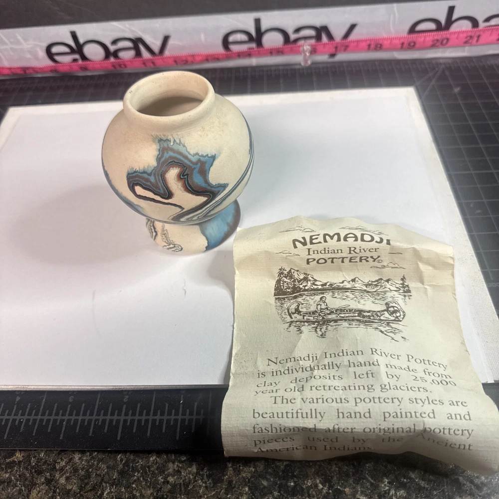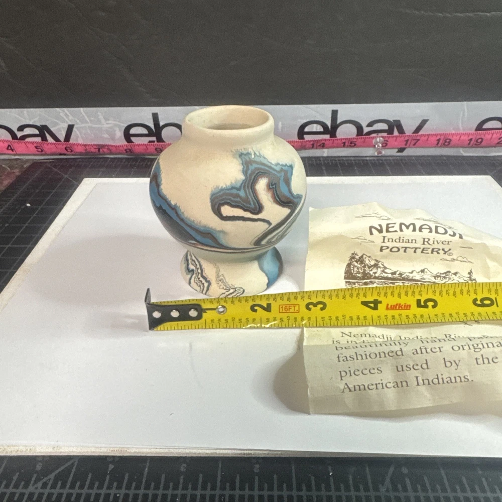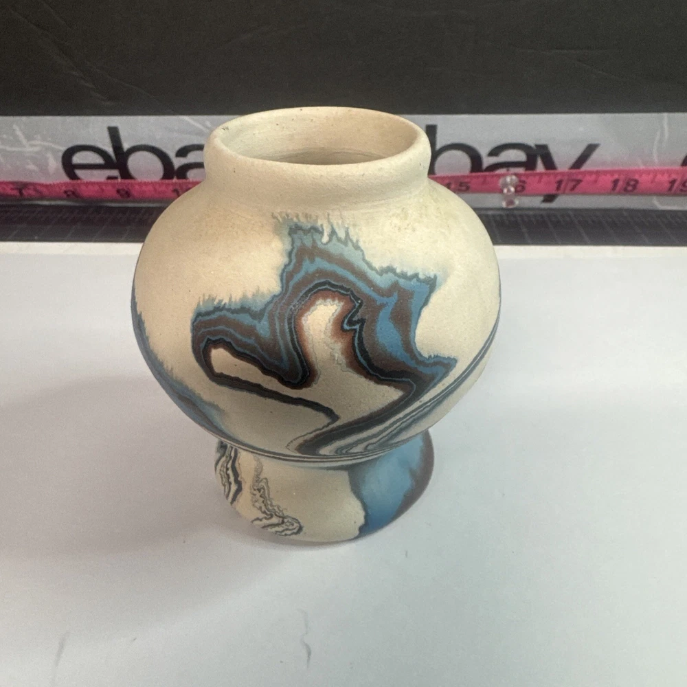 This Vintage Nemadji Indian Pottery Vase is a stunning piece of handmade art pottery from the United States. The vase features swirling earth tone colors and an abstract art subject. The matte finish and folk & indigenous style make it a perfect addition to any home decor. The vase is an original piece and was produced using traditional pottery techniques. It is made of high-quality clay material and has a unique and colorful theme. This vintage vase is perfect for those who appreciate the beauty and artistry of North American pottery. Please see photos for condition and what’s included. Please feel free to contact us with any questions before purchasing.
