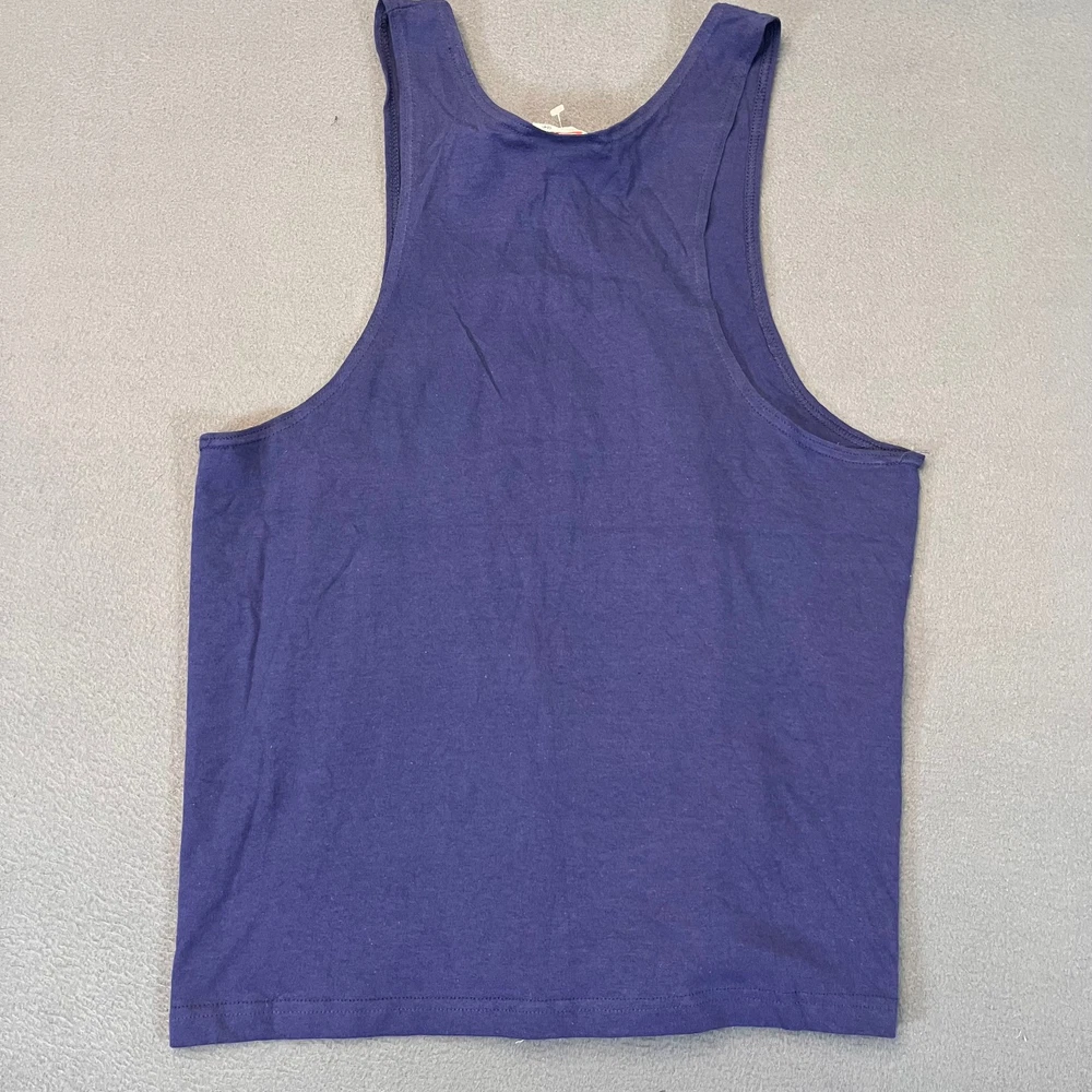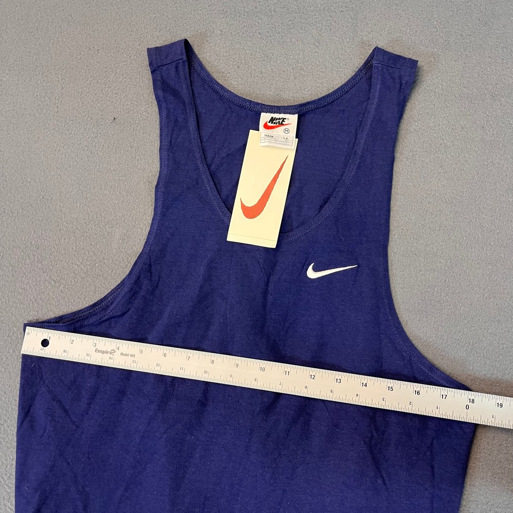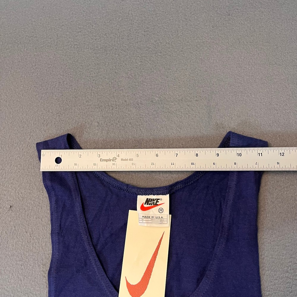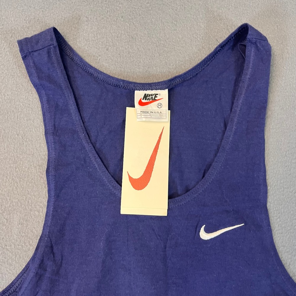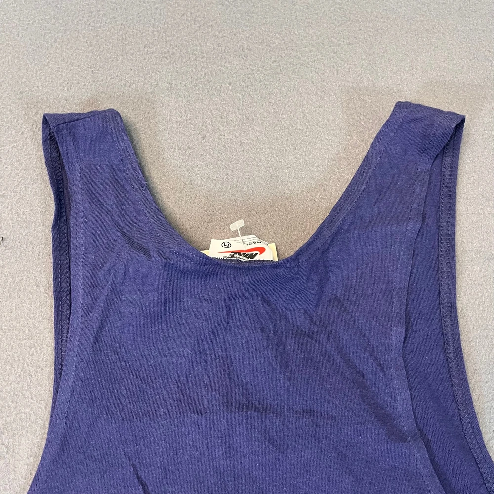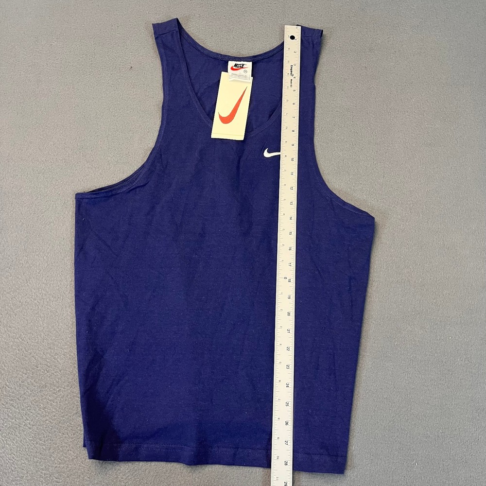 This Vintage Nike Sleeveless Tank Top T-Shirt in Men's size medium is a classic piece made in the USA with a crew neckline and a solid blue color. The shirt features a white Swoosh logo, making it a timeless and breathable addition to your wardrobe. Perfect for summer, fall, or spring, this shirt is a comfortable and stylish choice for any casual occasion. Made of cotton knit fabric, this Nike tank top is a must-have for anyone looking for a piece of 90s nostalgia in their clothing collection.